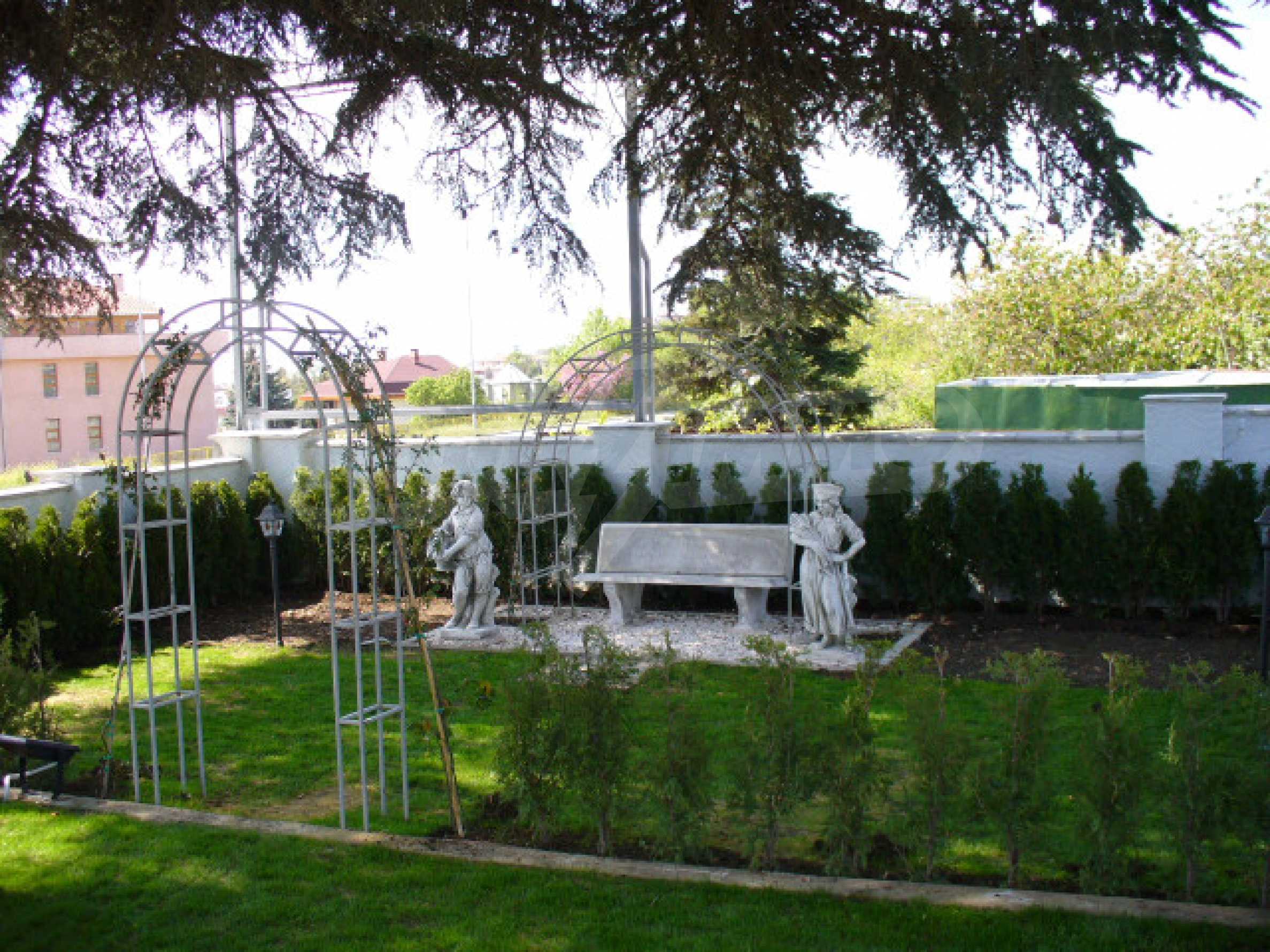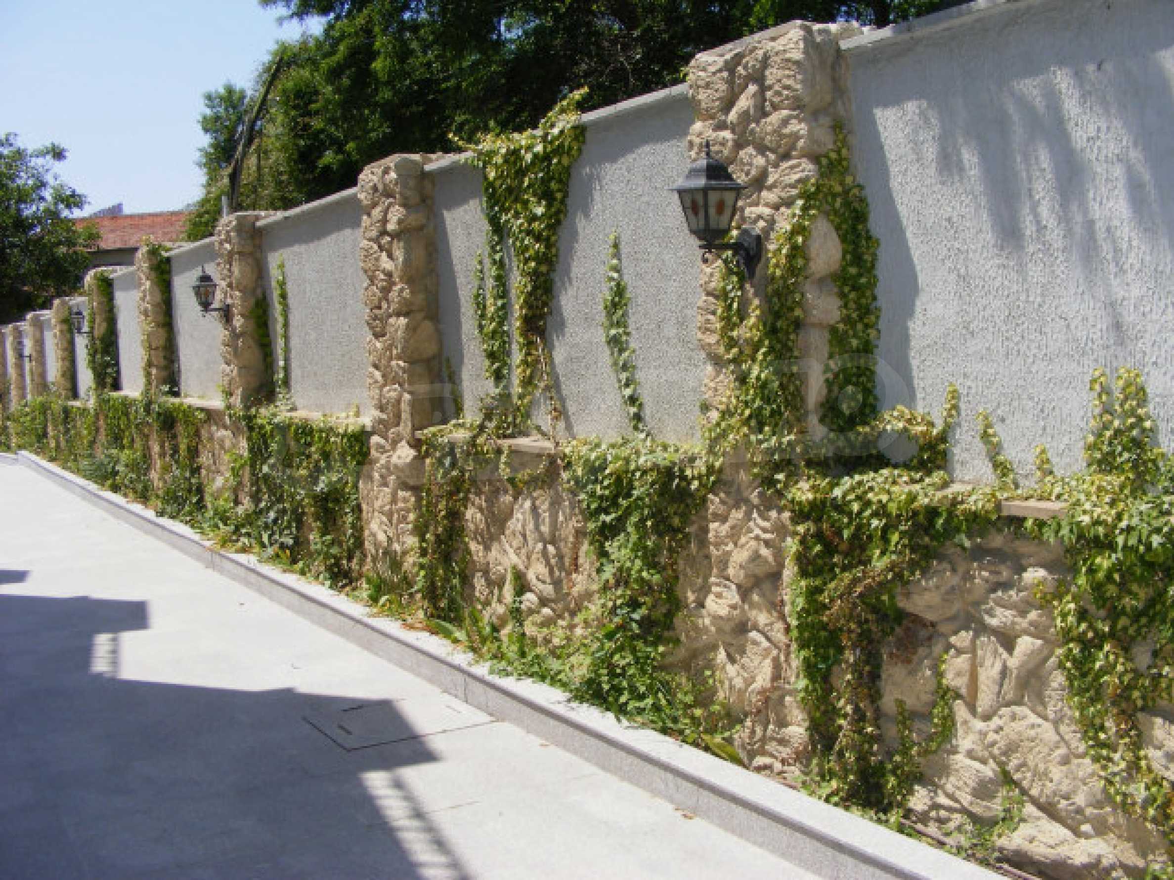 Das Anwesen ist von massiven Zäunen umgeben, die mit dekorativem Stein ausgekleidet sind. Gassenböden bestehen aus natürlichem rauchigem Granit. Die Eingangstür zum Innenhof ist aus massivem Schmiedeeisen, automatisch und mit Video-Gegensprechanlage.