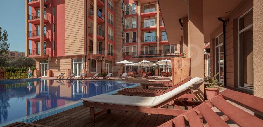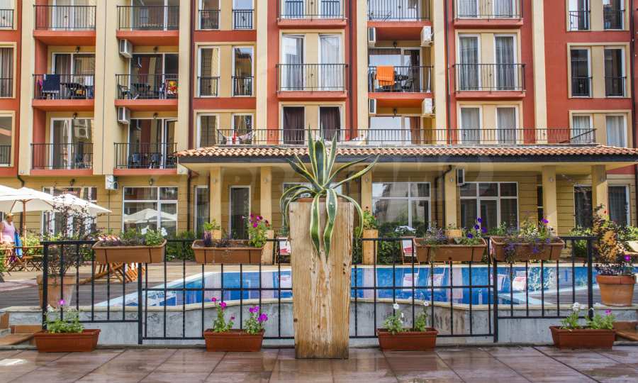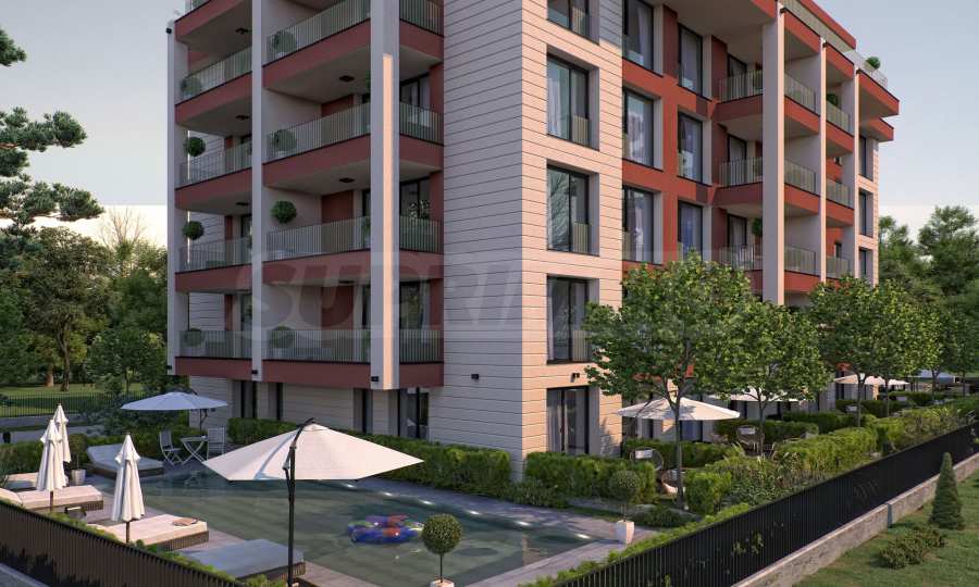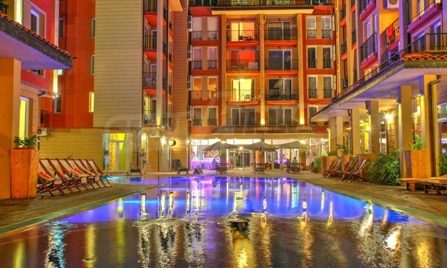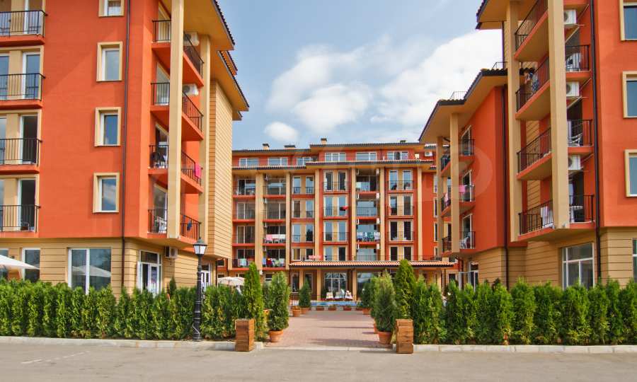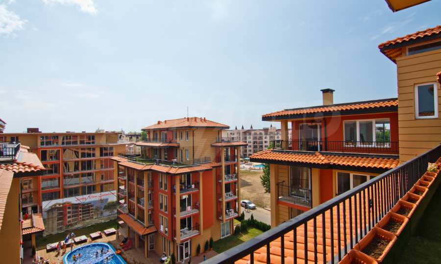 Die Wohnungen sind in drei separate Gebäude auf sechs Etagen aufgeteilt. Der Komplex ist nach Süden ausgerichtet und bietet Blick auf den Pool und den Spielplatz. Der Komplex verfügt über viele Extras, die den Aufenthalt angenehm machen.