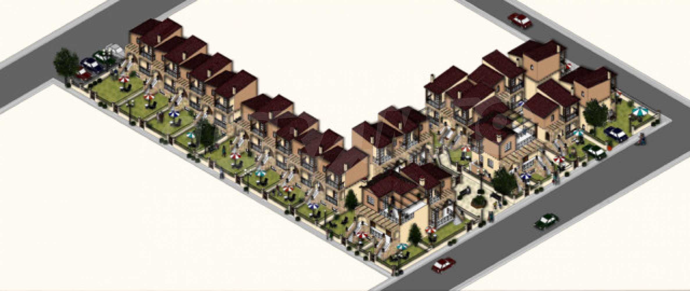 Der Komplex besteht aus fünf Teilen und die malerischen Pflastersteine und Parkplätze erleichtern den Zugang zu jeder Villa. Der erste Teil besteht aus vier Villen, der zweite, dritte und vierte Teil - jeweils zwei Villen, und der fünfte, der in zwei Flügel unterteilt ist, umfasst insgesamt sieben Villen. Die meisten Villen haben zwei Stockwerke, darunter ein Untergeschoss mit einer erhöhten Ebene, ein komfortables, breites Wohnzimmer und eine Küche im Erdgeschoss, ein großes Schlafzimmer mit einem Badezimmer im ersten Stock sowie zwei weitere geräumige Schlafzimmer, ein Badezimmer und einen Abstellraum im Untergeschoss.