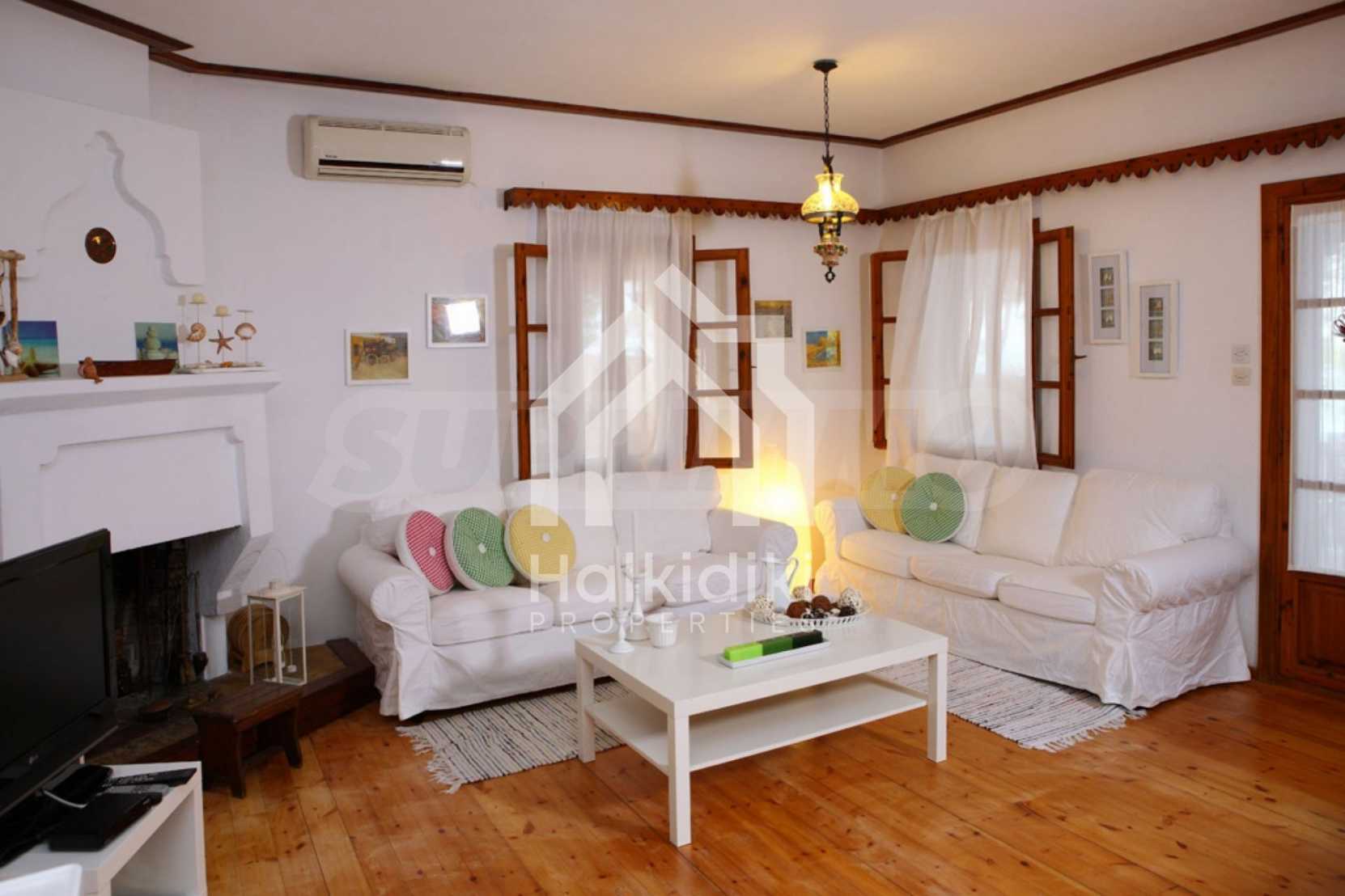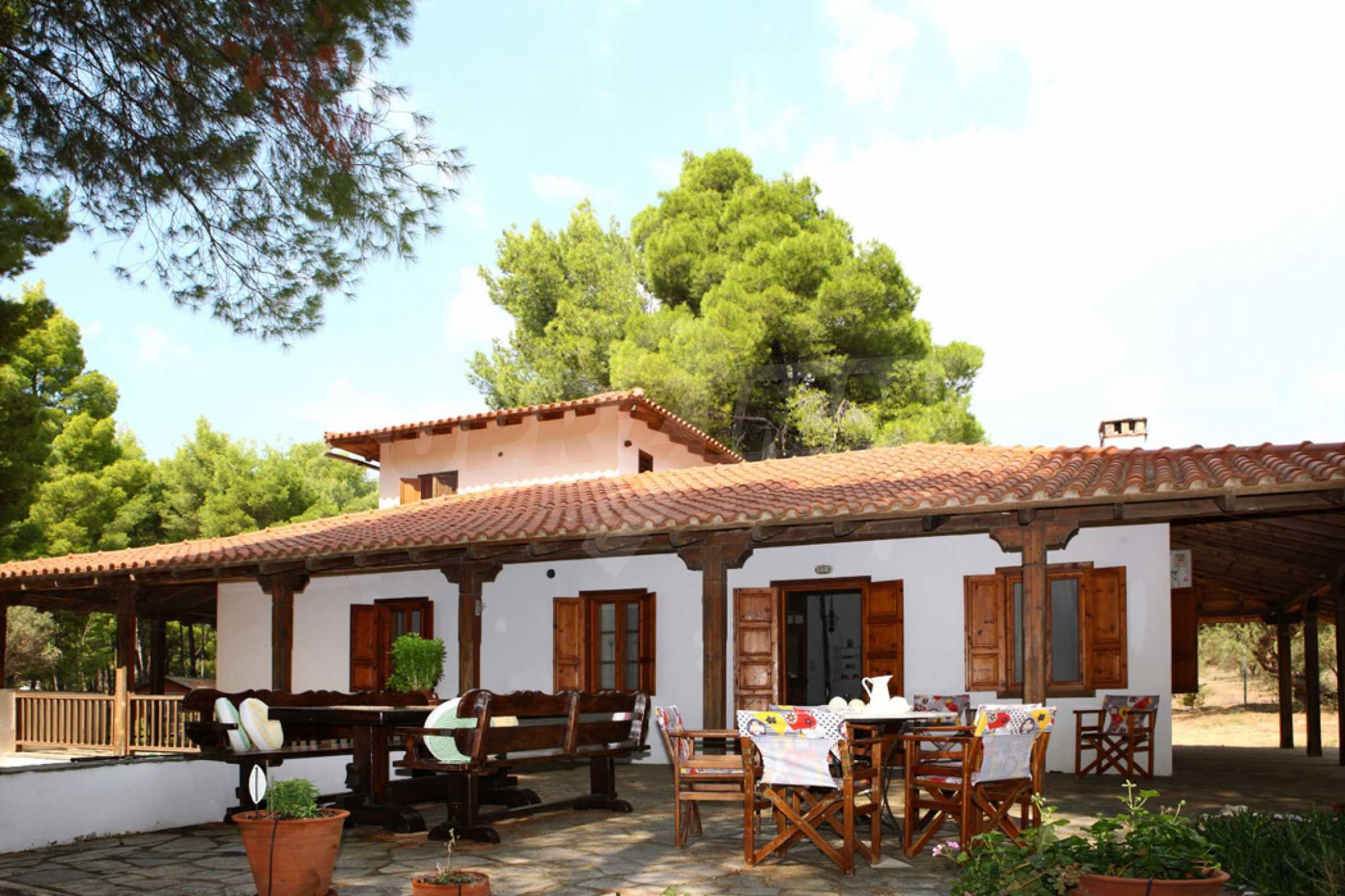 Große und geräumige Villa im Feriendorf Metamorfosi am Sithonia-Arm, Teil der Halbinsel Chalkidiki. Die Villa wurde 1978 erbaut und erstreckt sich über eine Fläche von 255 qm. Das Haus ist auf drei Ebenen gebaut und bietet fünf Schlafzimmer und drei Badezimmer. Auf der ersten Ebene befinden sich zwei Schlafzimmer und ein Badezimmer. Auf der zweiten Ebene gibt es eine Küche und ein großes Wohnzimmer, zwei Schlafzimmer und ein Badezimmer, und auf der dritten Ebene gibt es ein weiteres Schlafzimmer und ein Badezimmer. Das Haus ist voll möbliert und mit allem ausgestattet, was Sie brauchen.