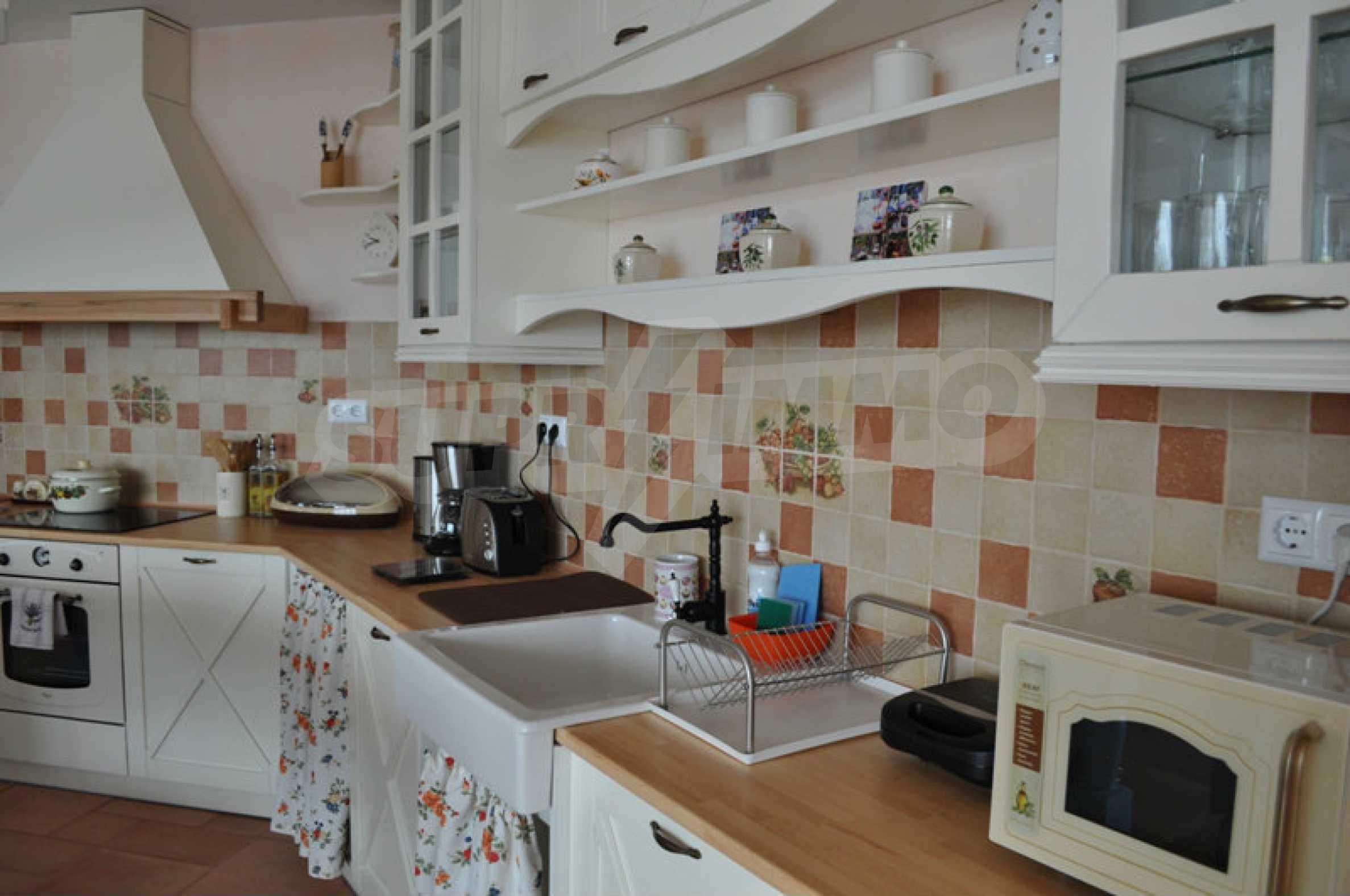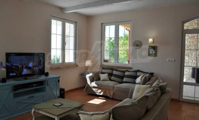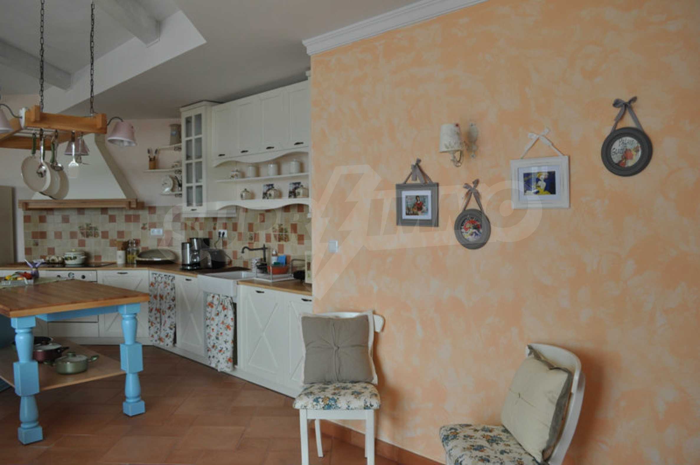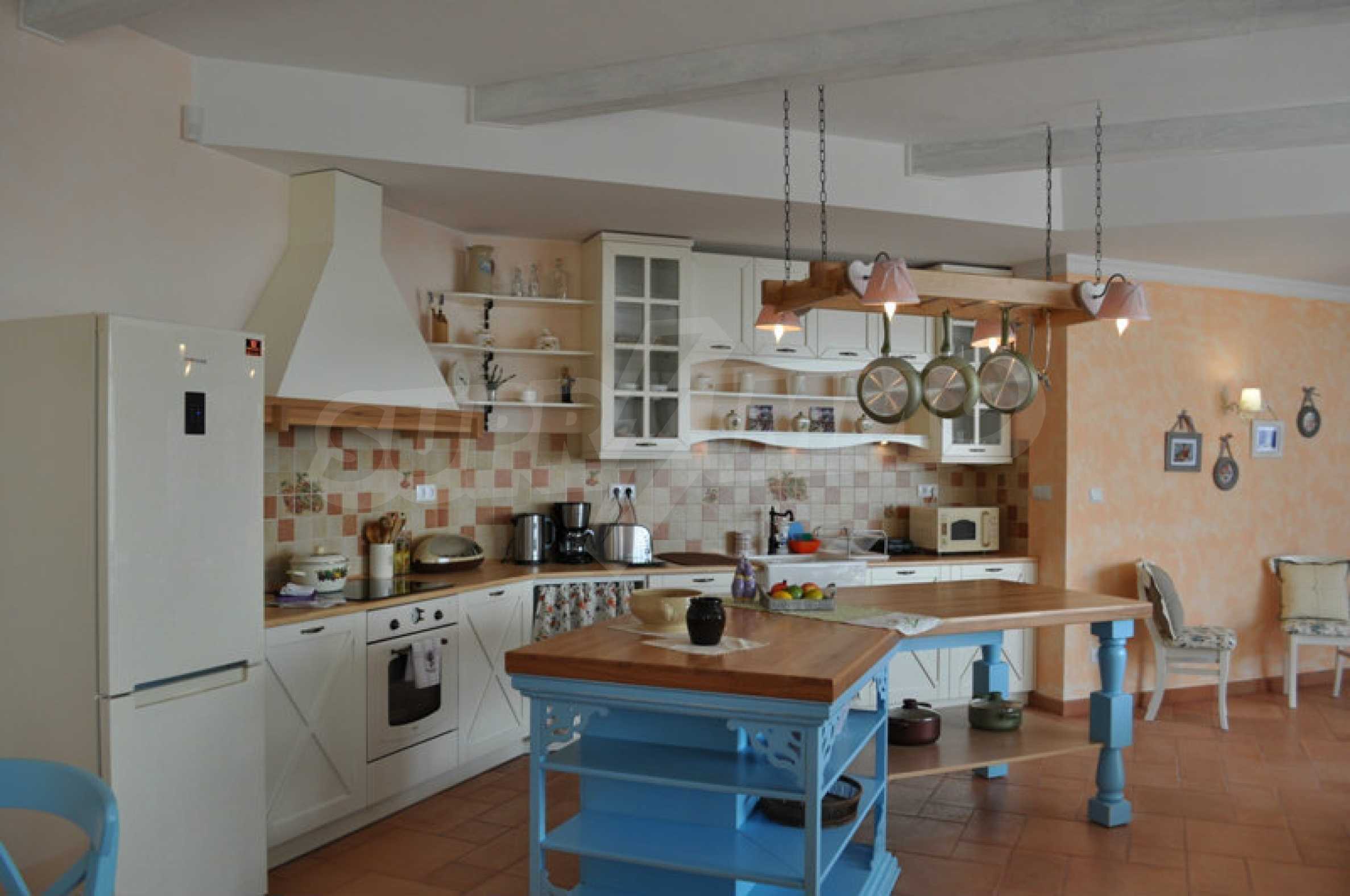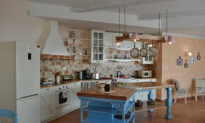 Das Wohnzimmer befindet sich im Erdgeschoss der Villa und erstreckt sich über mehr als 50 Quadratmeter. Es besteht aus mehreren Bereichen - Eingangshalle, Küchenzeile mit Kochinsel, Esstisch und Sitzbereich. Die Küche ist komplett ausgestattet mit einem Kühlschrank mit Gefrierfach, elektrischen Kochplatten, eingebautem Backofen, Geschirrspüler, Dunstabzugshaube, Wasserkocher, Mikrowelle, Kaffeemaschine, Toaster und kombiniert all diese modernen Annehmlichkeiten mit der alten Einrichtung.