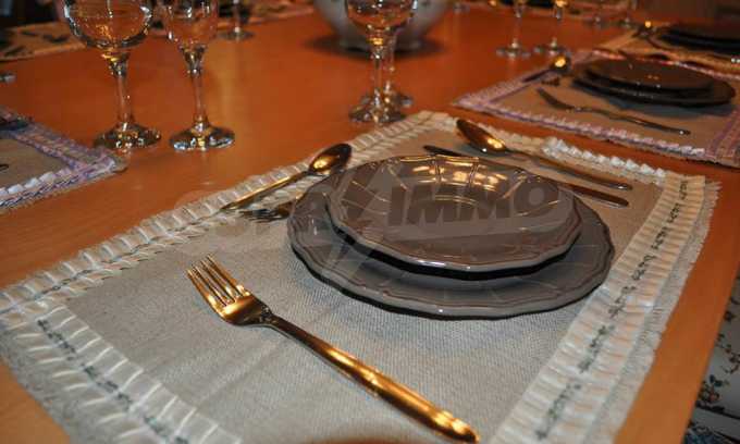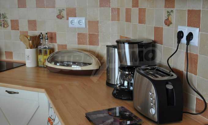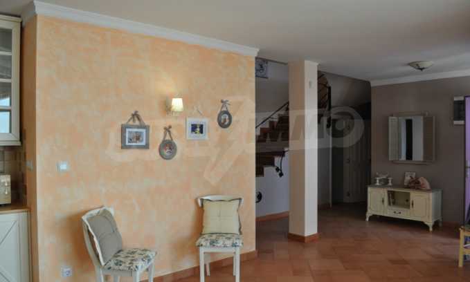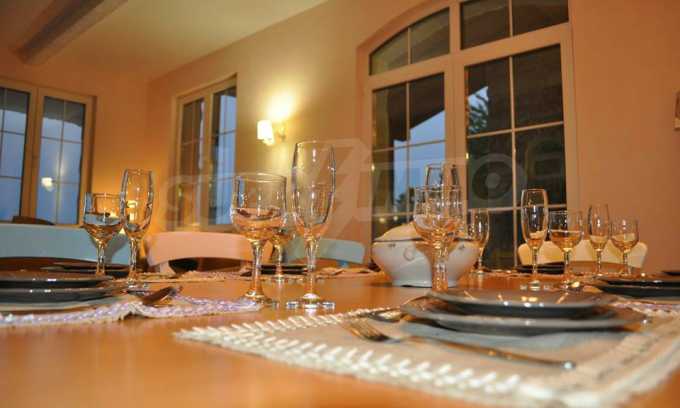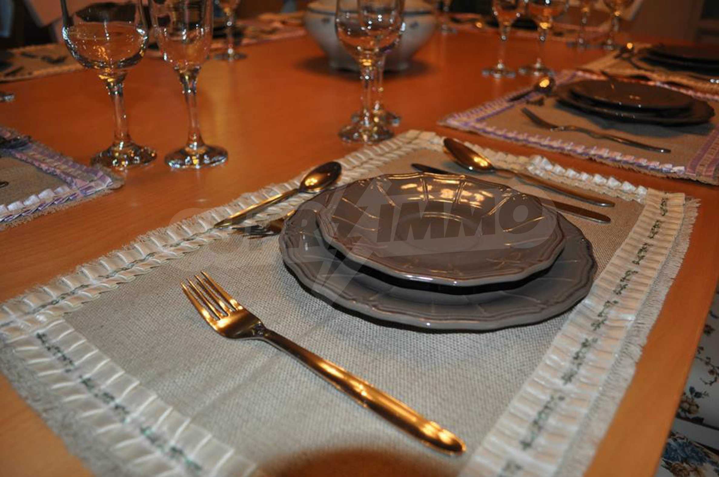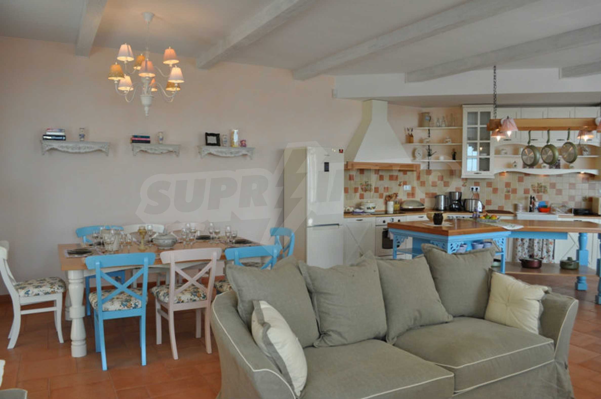 Das Wohnzimmer befindet sich im Erdgeschoss der Villa und erstreckt sich über mehr als 50 Quadratmeter. Es besteht aus mehreren Bereichen - Eingangshalle, Küchenzeile mit Kochinsel, Esstisch und Sitzbereich. Die Küche ist komplett ausgestattet mit einem Kühlschrank mit Gefrierfach, elektrischen Kochplatten, eingebautem Backofen, Geschirrspüler, Dunstabzugshaube, Wasserkocher, Mikrowelle, Kaffeemaschine, Toaster und kombiniert all diese modernen Annehmlichkeiten mit der alten Einrichtung.