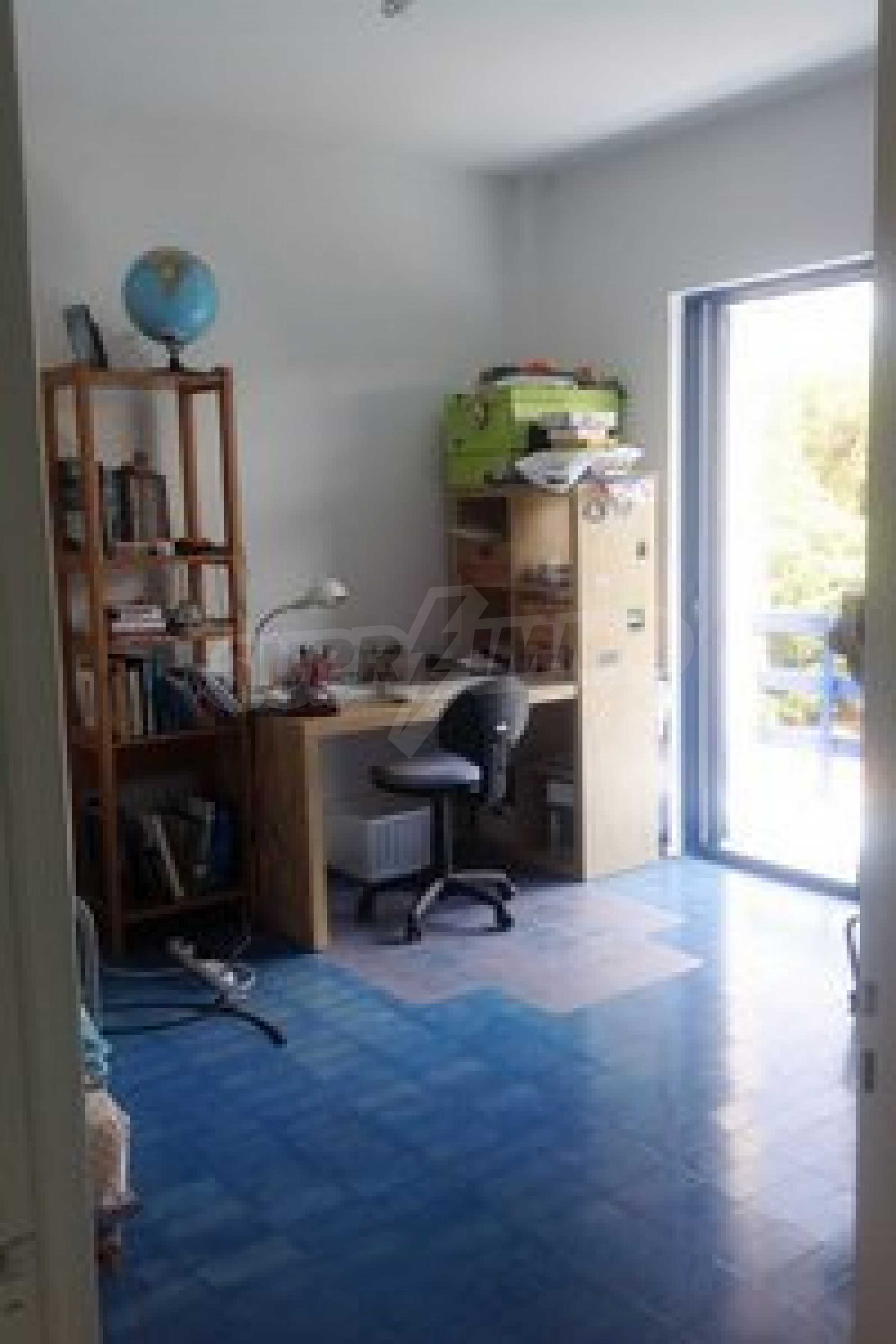 Alle Zimmer in der Unterkunft sind gestaltet und der umzäunte Garten ist mit viel Grün, Fliesen und einem Grillplatz dekoriert.