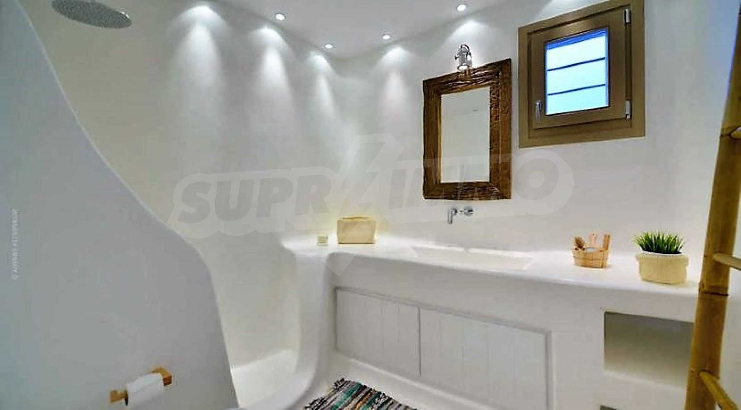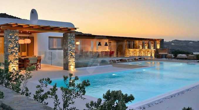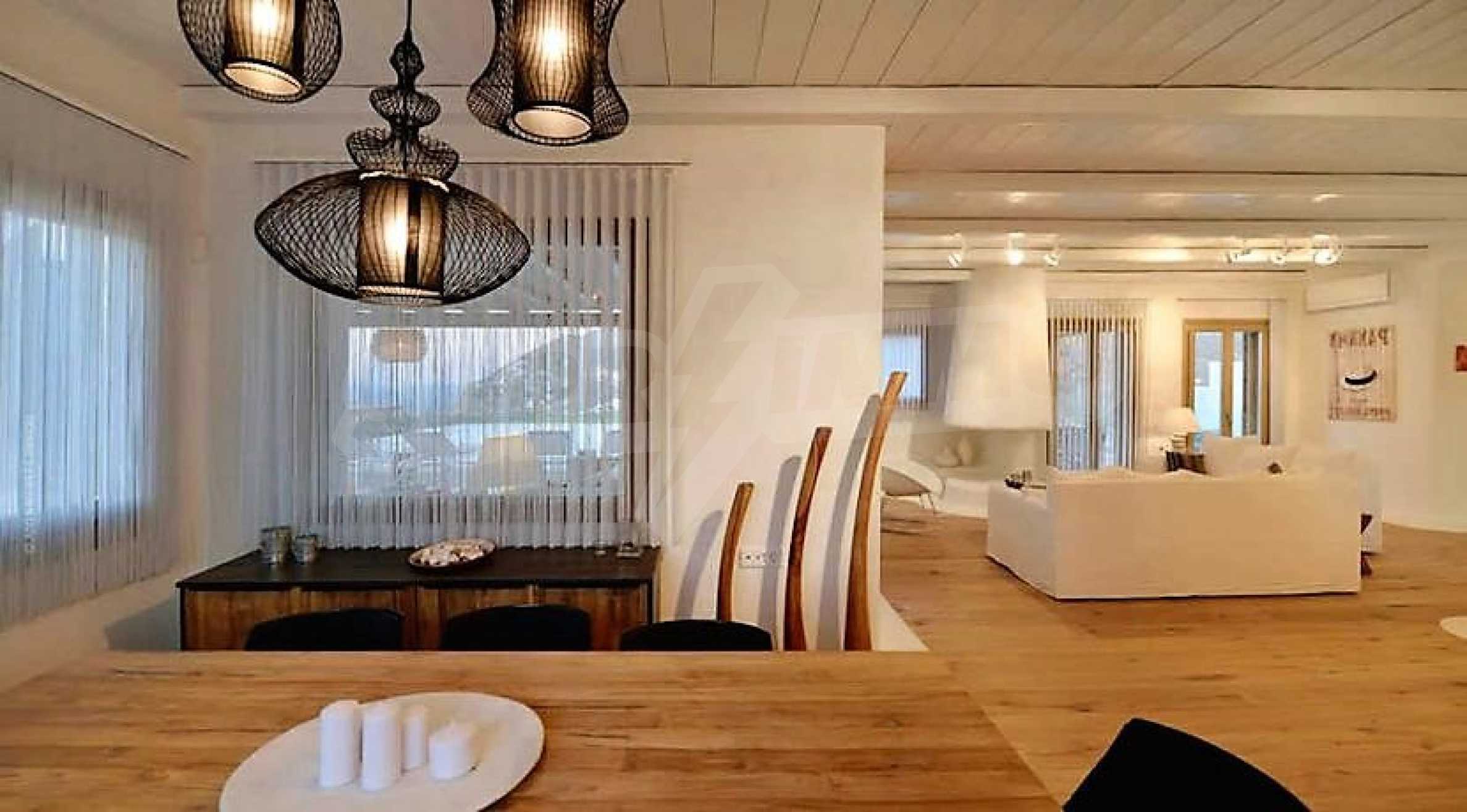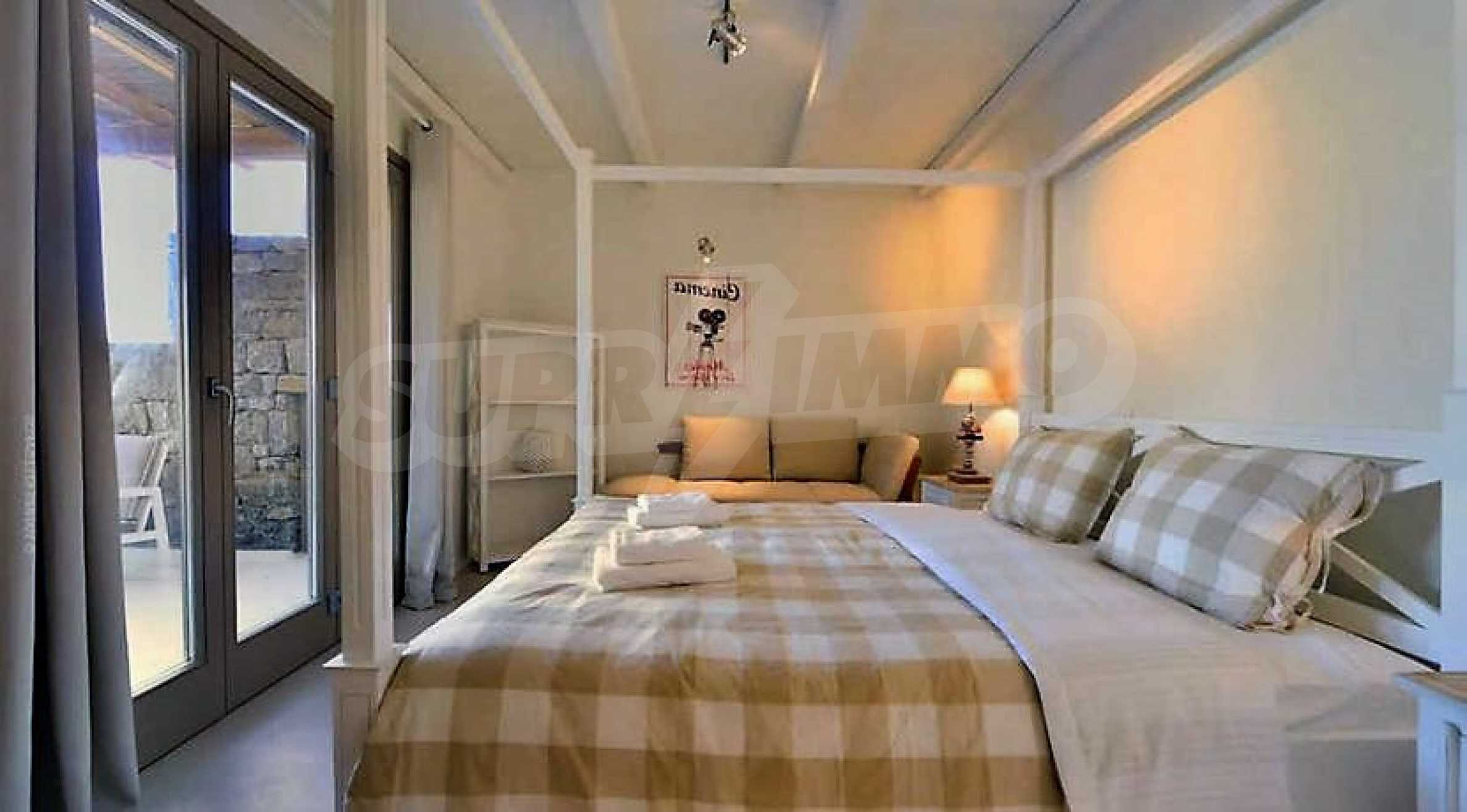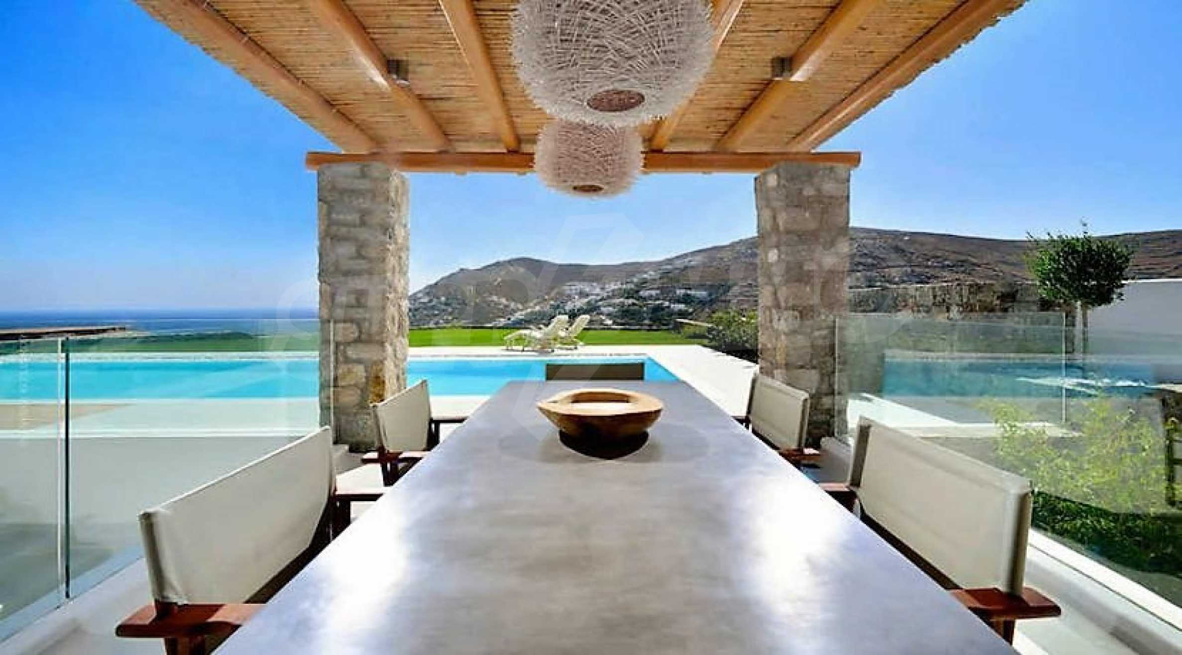 Nur 1,5 km. Von der Villa aus befindet sich das grafische Dorf Ano Mera mit seinem einzigartigen Kloster, in dem Sie Tavernen, Cafés, Konditoreien, einen großen Supermarkt, eine Bäckerei, Pavillons und eine Apotheke finden. 10 km entfernt befindet sich die Hauptstadt Chora und der Flughafen der Insel.