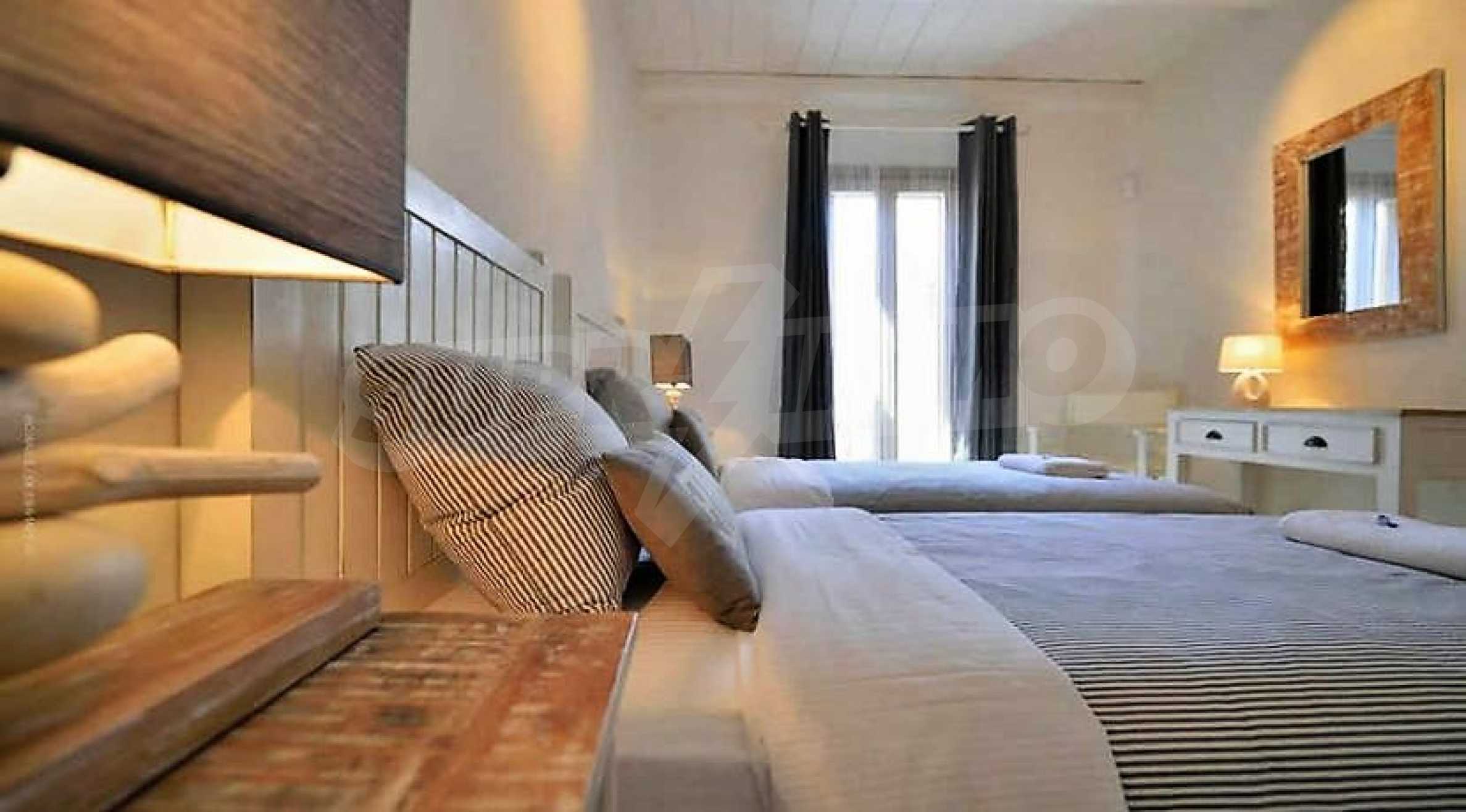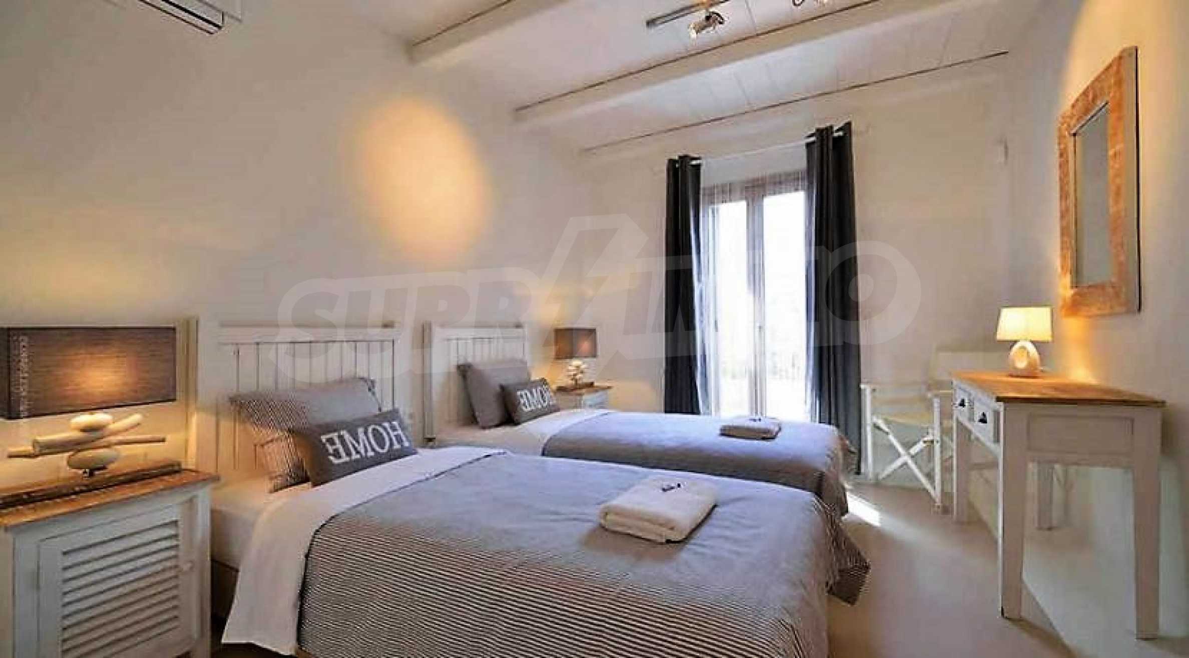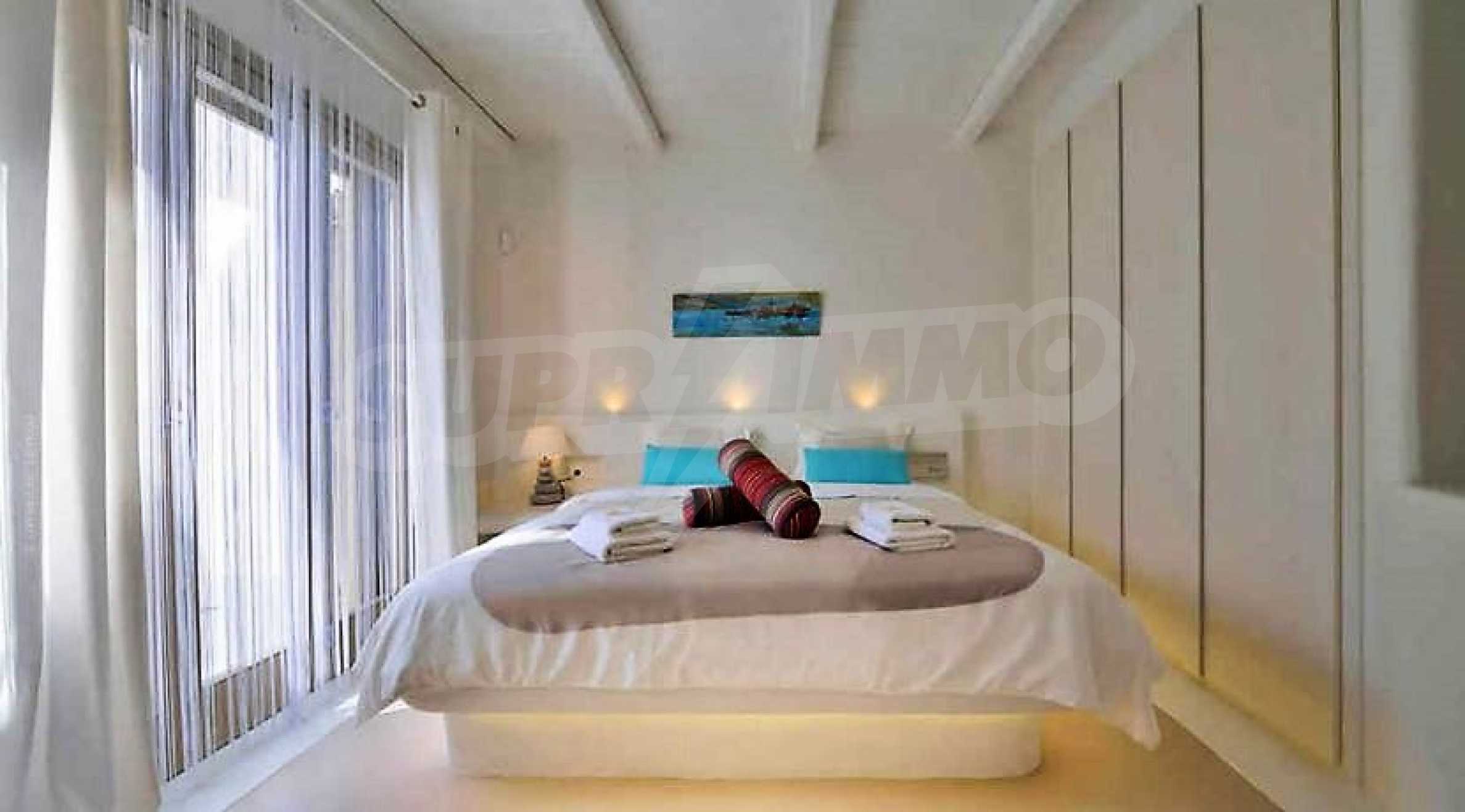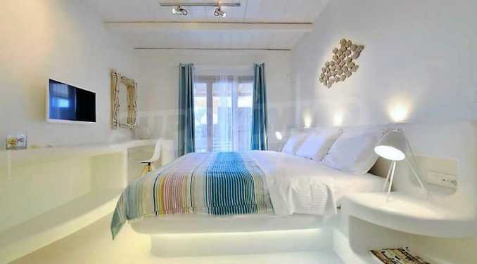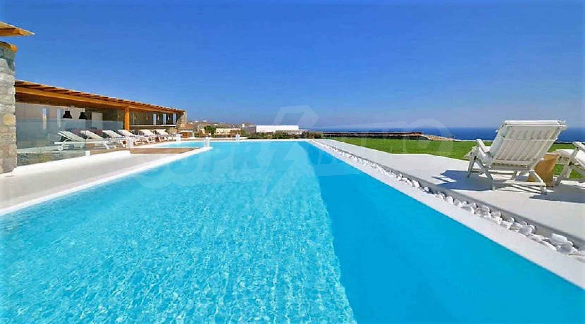 Nur 1,5 km. Von der Villa aus befindet sich das grafische Dorf Ano Mera mit seinem einzigartigen Kloster, in dem Sie Tavernen, Cafés, Konditoreien, einen großen Supermarkt, eine Bäckerei, Pavillons und eine Apotheke finden. 10 km entfernt befindet sich die Hauptstadt Chora und der Flughafen der Insel.