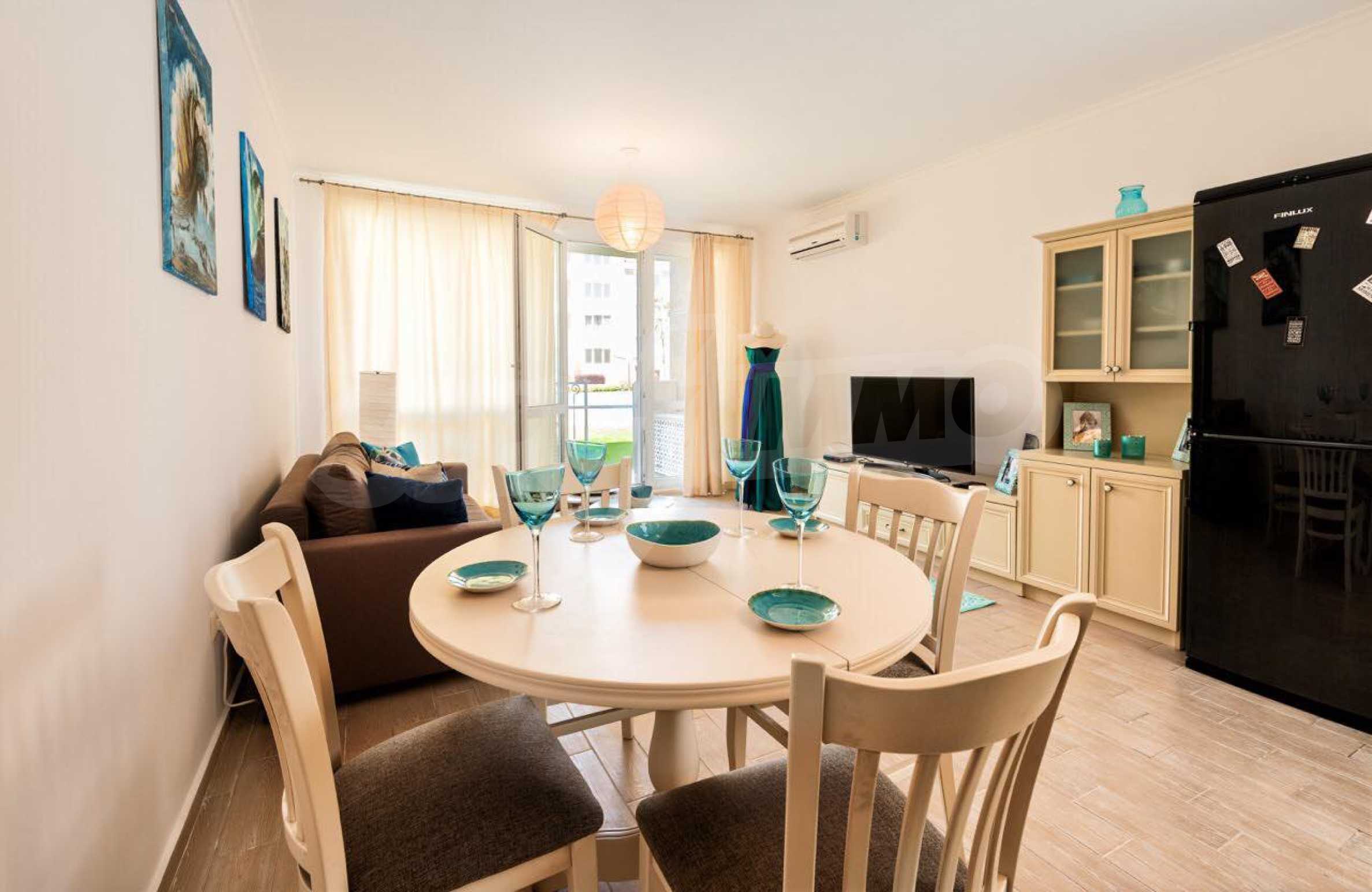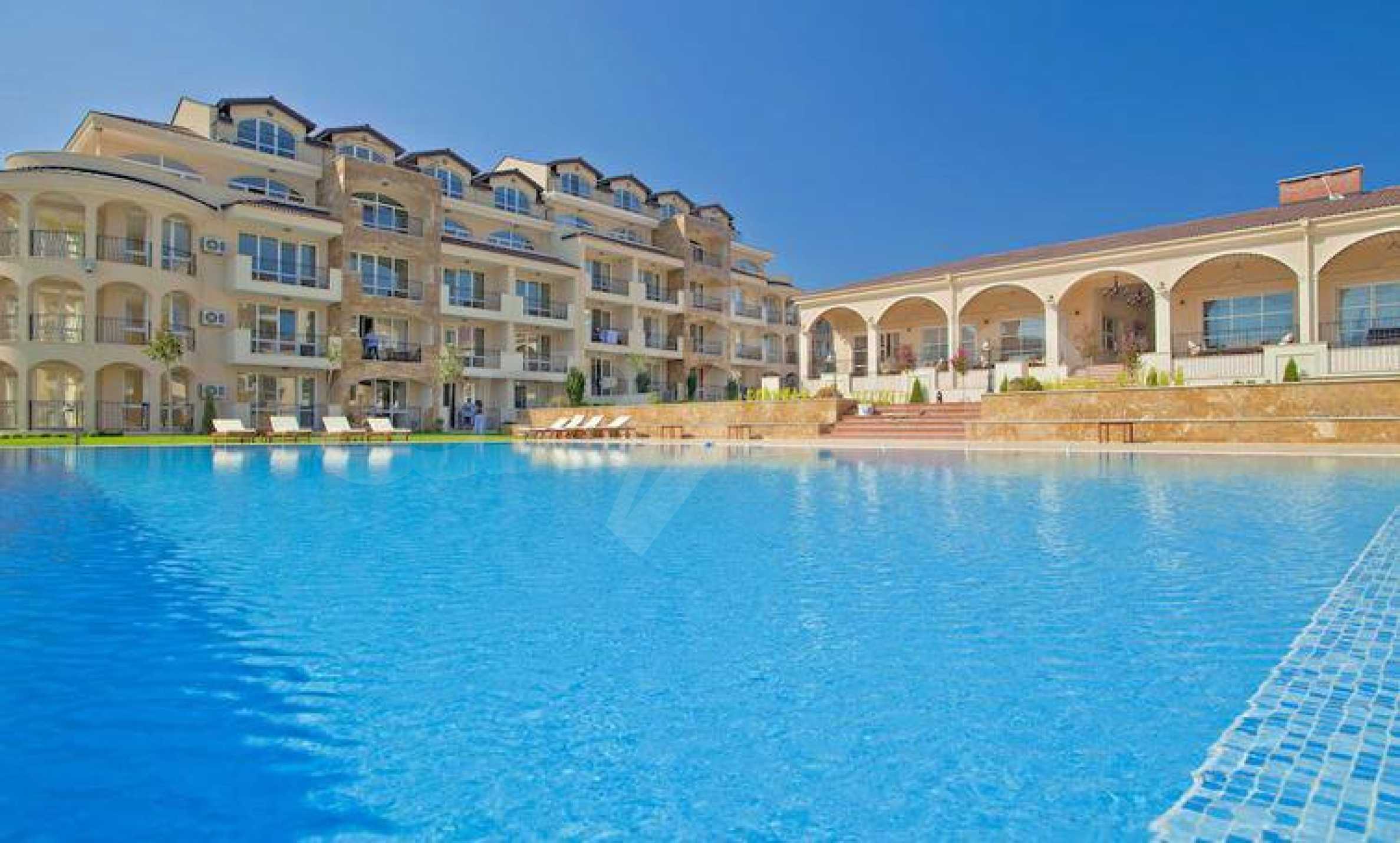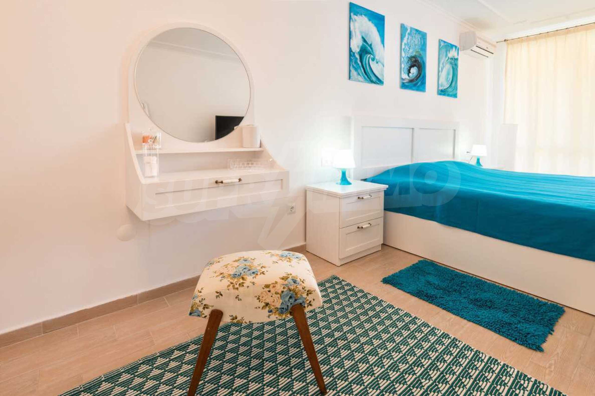Die Wände der Wohnung sind mit Latex gestrichen, der Boden ist aus Granit, die Fenster haben hochwertige PVC-Fenster. Die Zimmer des Apartments sind im Sommer kühl und das stilvolle Interieur in hellen Farben ist voller Harmonie und Ästhetik der Meereslandschaften. Die gepflegten öffentlichen Bereiche, die Ruhe und Beschaulichkeit sowie die vielen Annehmlichkeiten in der Anlage ergänzen perfekt die allgemeine Atmosphäre der Raffinesse, des Komforts und der Entspannung. Darüber hinaus bietet der Komplex folgende Extras: