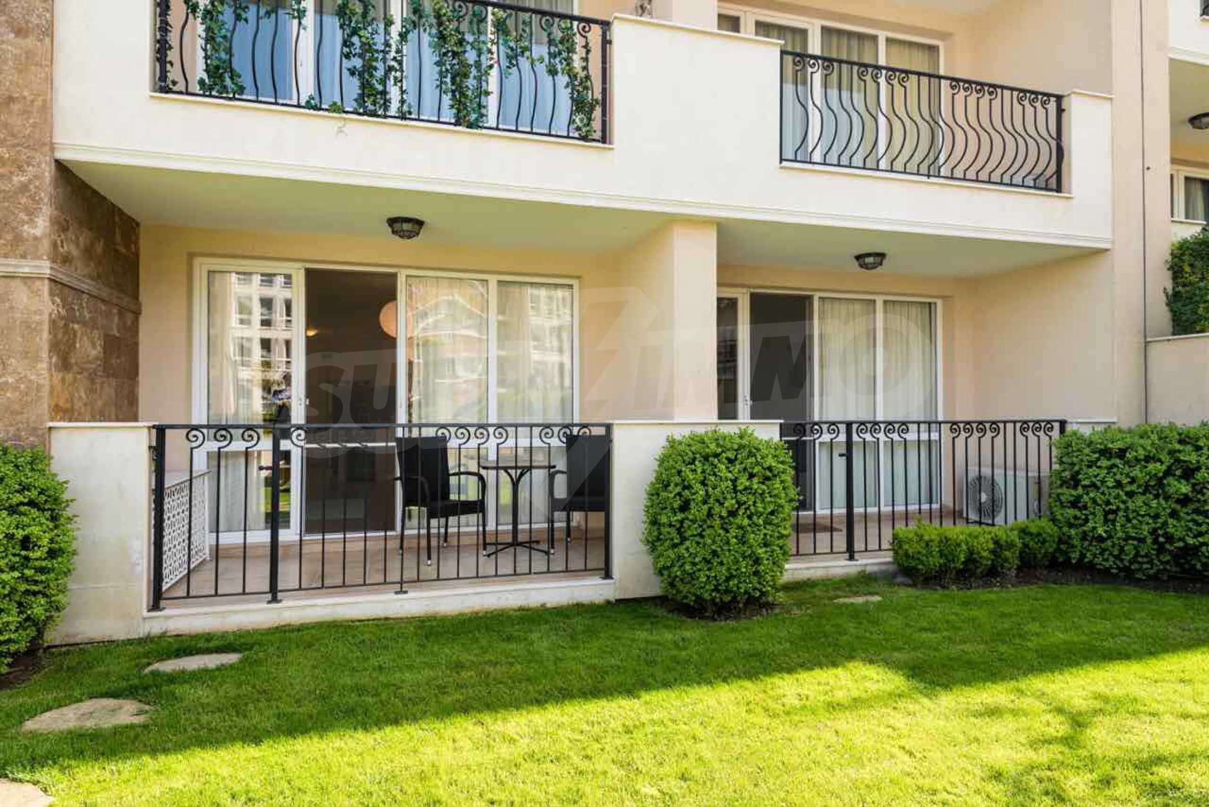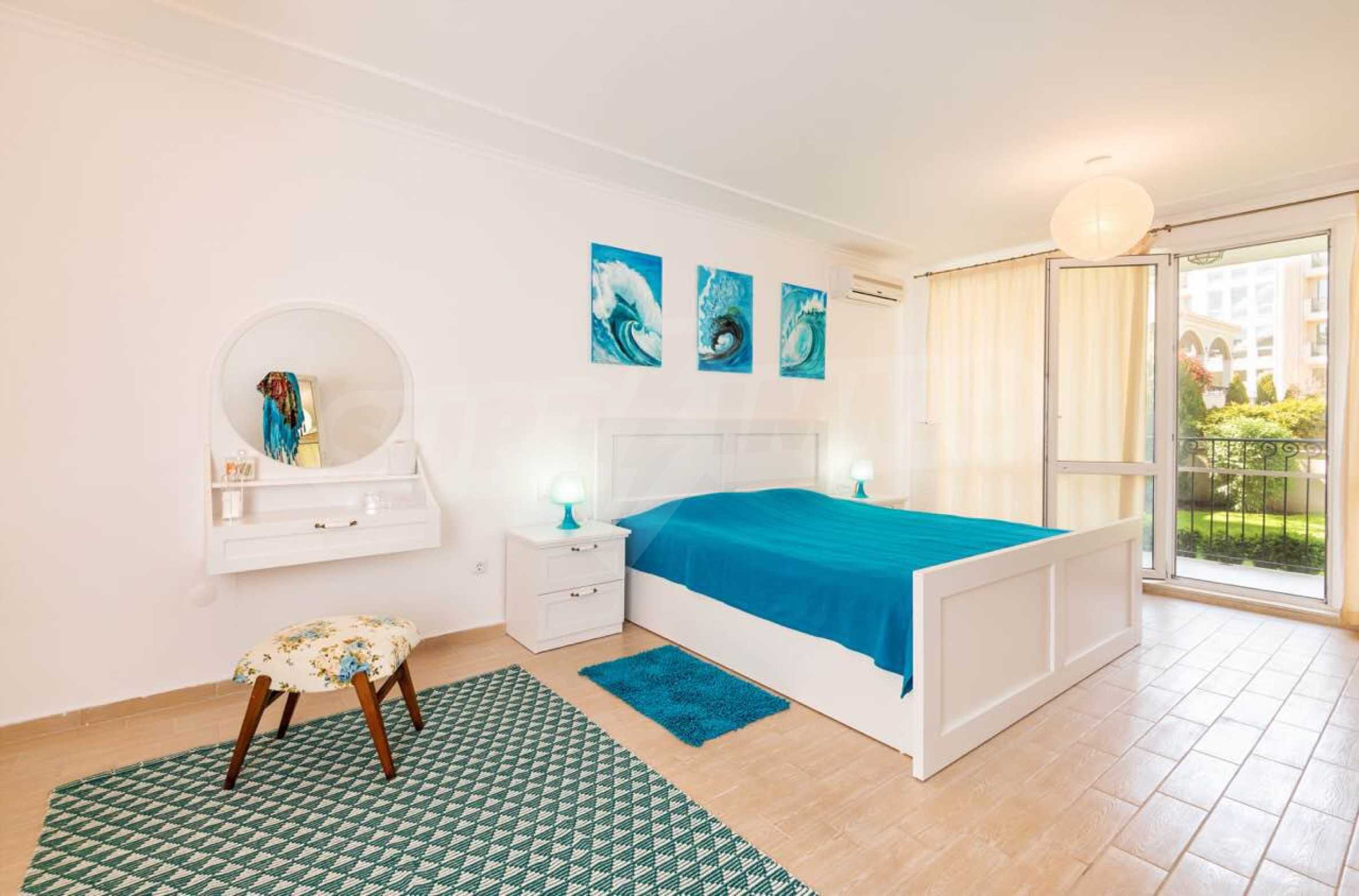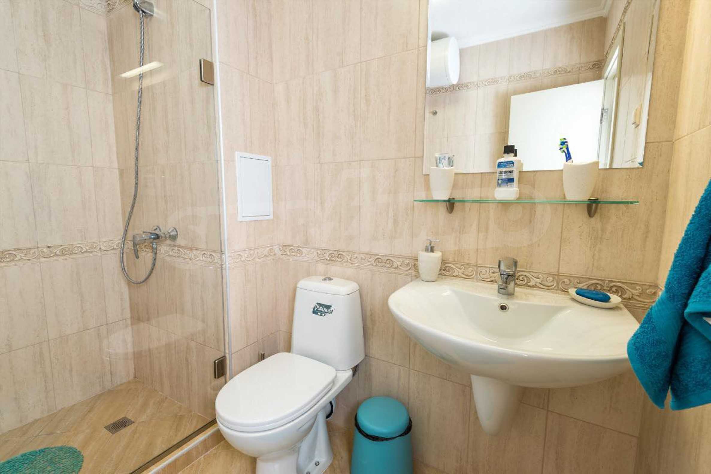 Die Wände der Wohnung sind mit Latex gestrichen, der Boden ist aus Granit, die Fenster haben hochwertige PVC-Fenster. Die Zimmer des Apartments sind im Sommer kühl und das stilvolle Interieur in hellen Farben ist voller Harmonie und Ästhetik der Meereslandschaften. Die gepflegten öffentlichen Bereiche, die Ruhe und Beschaulichkeit sowie die vielen Annehmlichkeiten in der Anlage ergänzen perfekt die allgemeine Atmosphäre der Raffinesse, des Komforts und der Entspannung. Darüber hinaus bietet der Komplex folgende Extras: