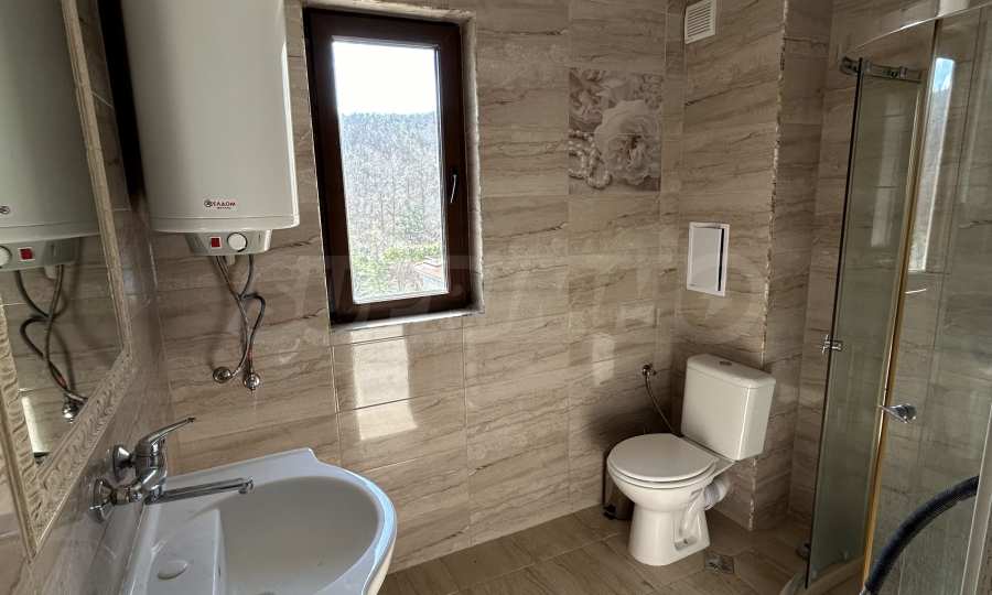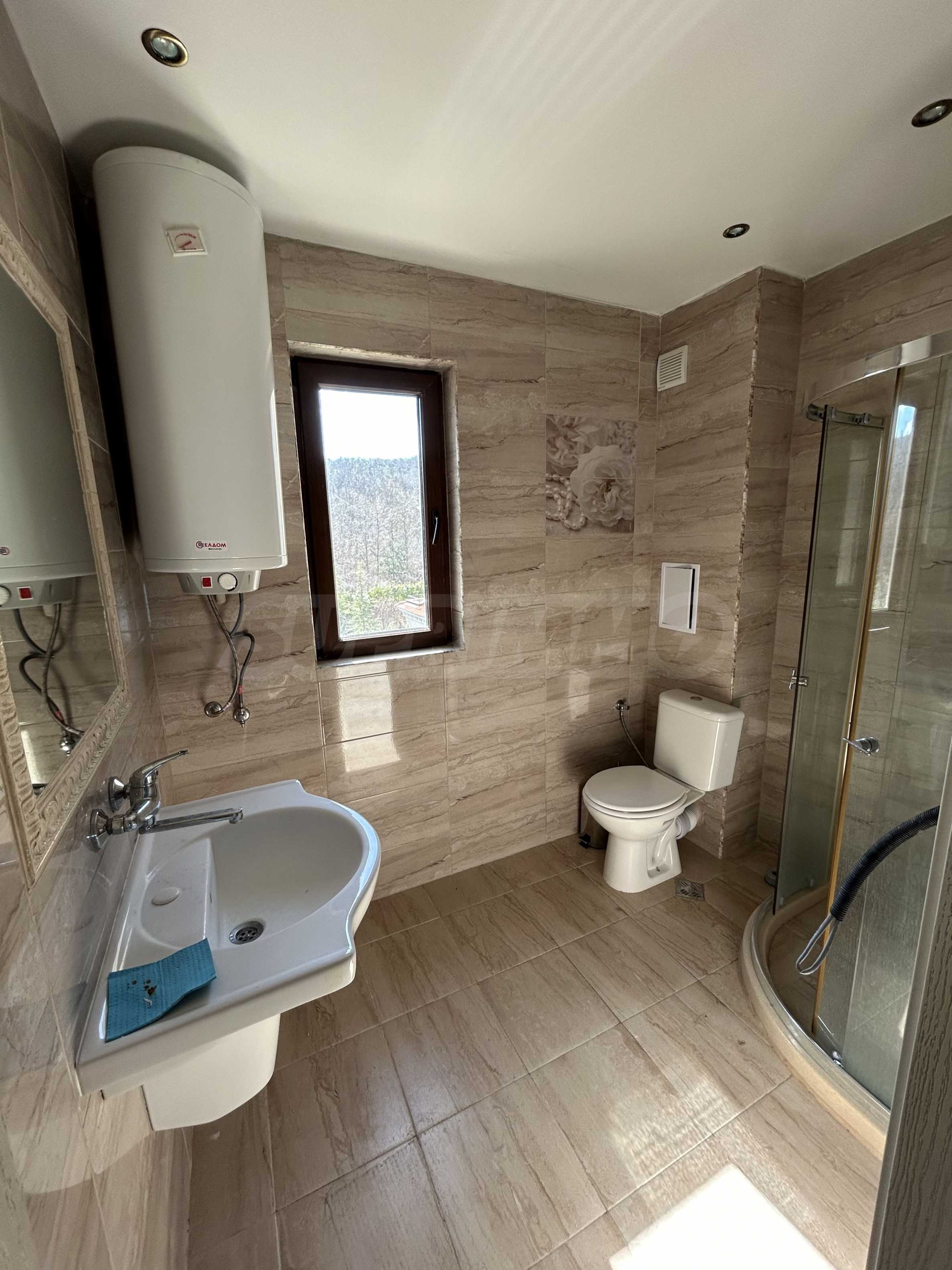 - Badezimmer – Boden – Terrakotta, Wände – Fayence, Duscharmatur, Monoblock, Waschbecken, Duschkabine und Warmwasserbereiter.
