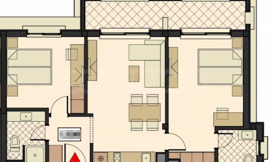 Die Dreizimmerwohnung liegt im 3. OG und verfügt über eine Fläche von 93,22 qm. und funktionale Aufteilung der Räumlichkeiten: Eingangshalle, 2 Badezimmer mit WC, 2 Schlafzimmer, Wohnzimmer mit Küche und eine geräumige Terrasse mit herrlichem Blick auf das Meer und die Dünen.