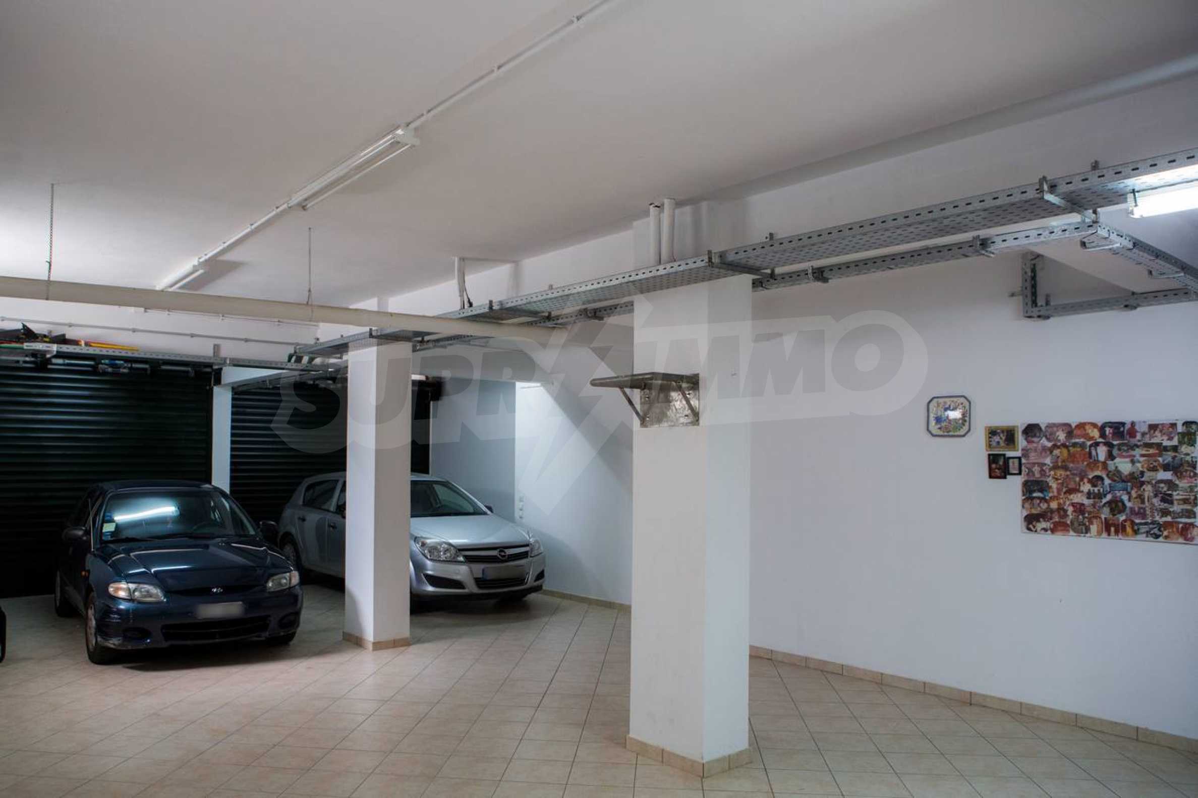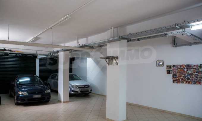 Eine Ebene tiefer befinden sich ein Parkplatz für 4 Autos und ein separates Apartment. Das Apartment besteht aus einer offenen Küche, zwei Schlafzimmern und einem Badezimmer.