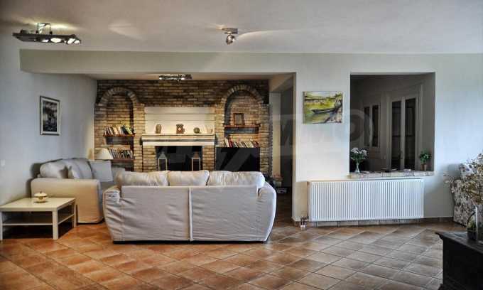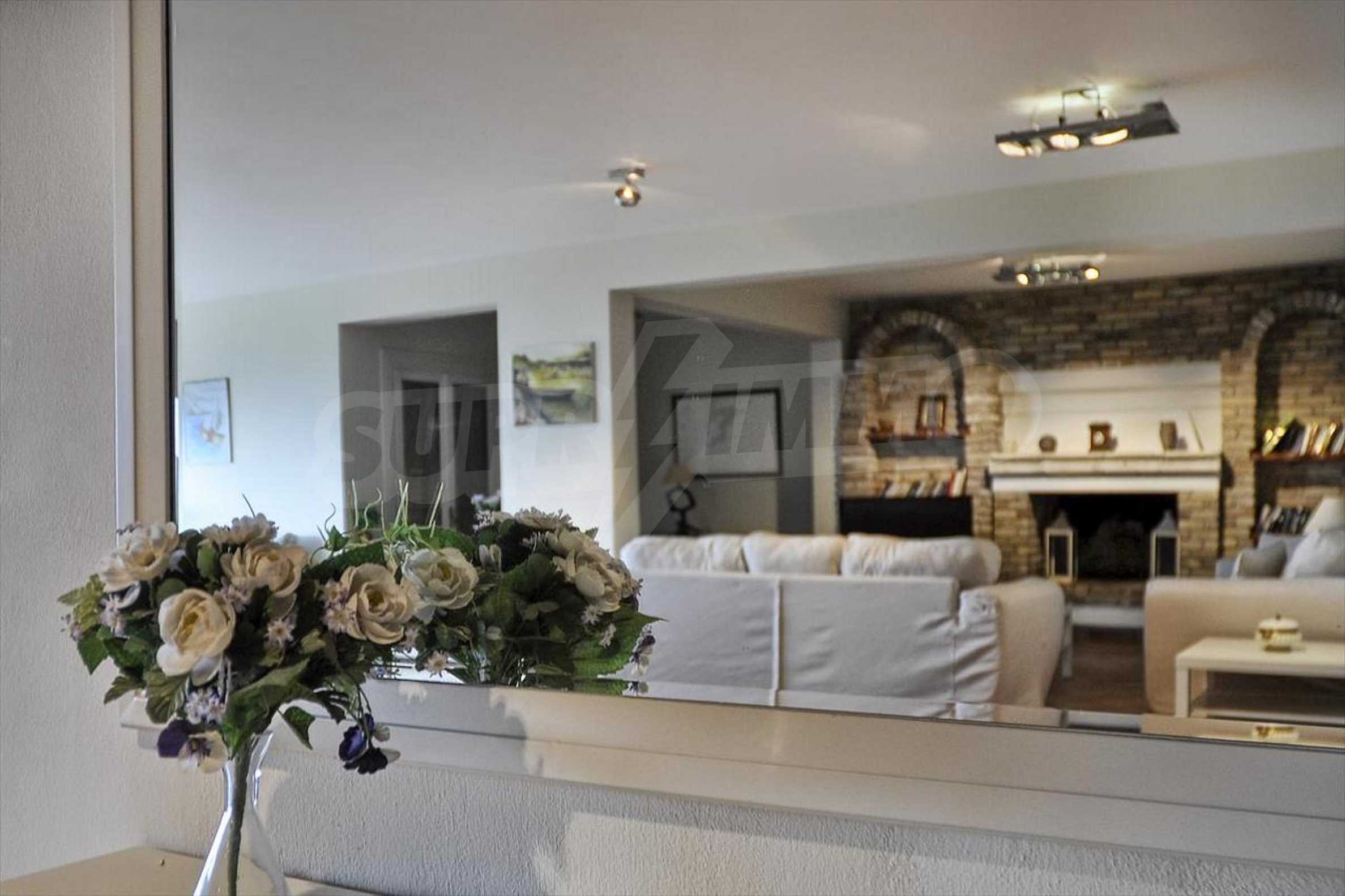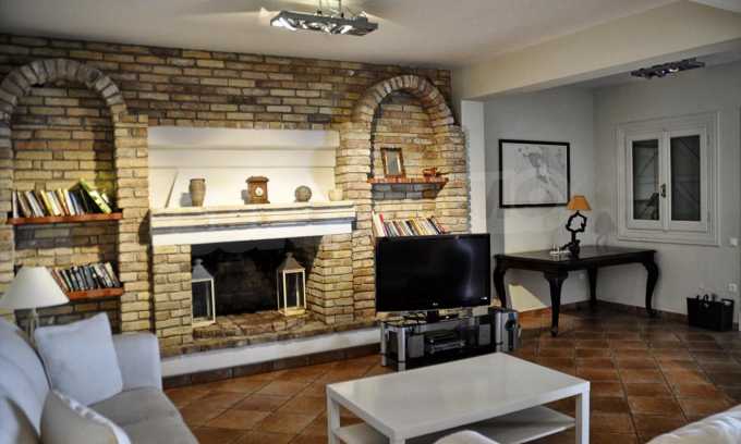 Die erste Etage umfasst eine moderne ausgestattete Küche, ein breites Wohnzimmer mit Ziegelkamin, ein Schlafzimmer und ein Badezimmer.