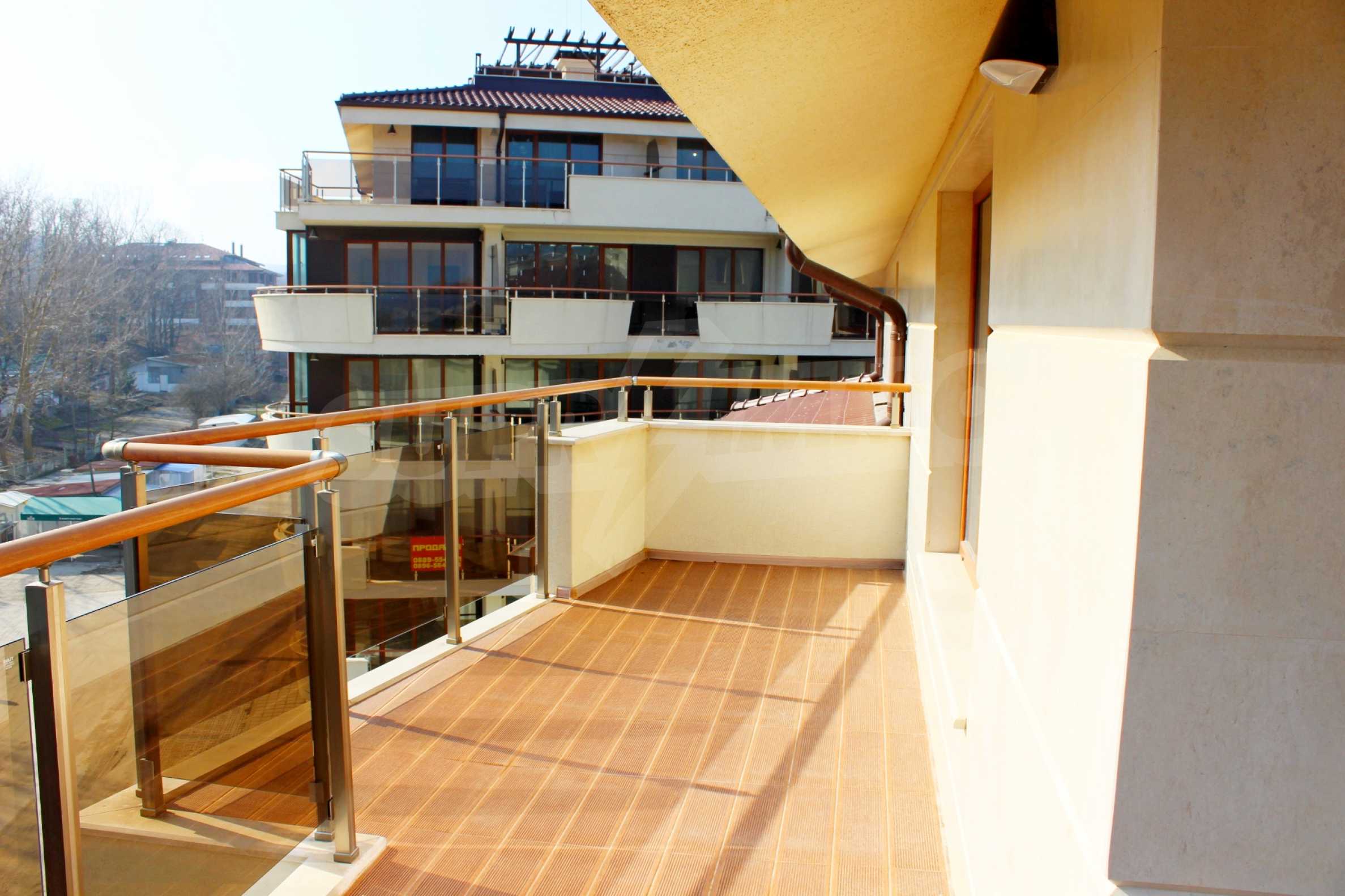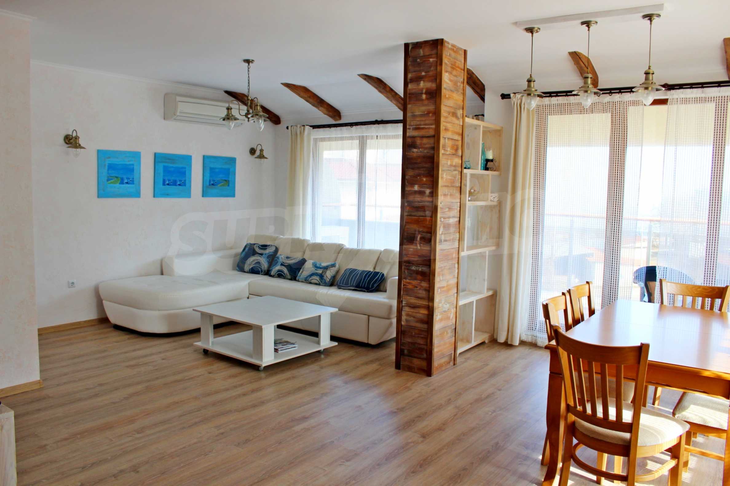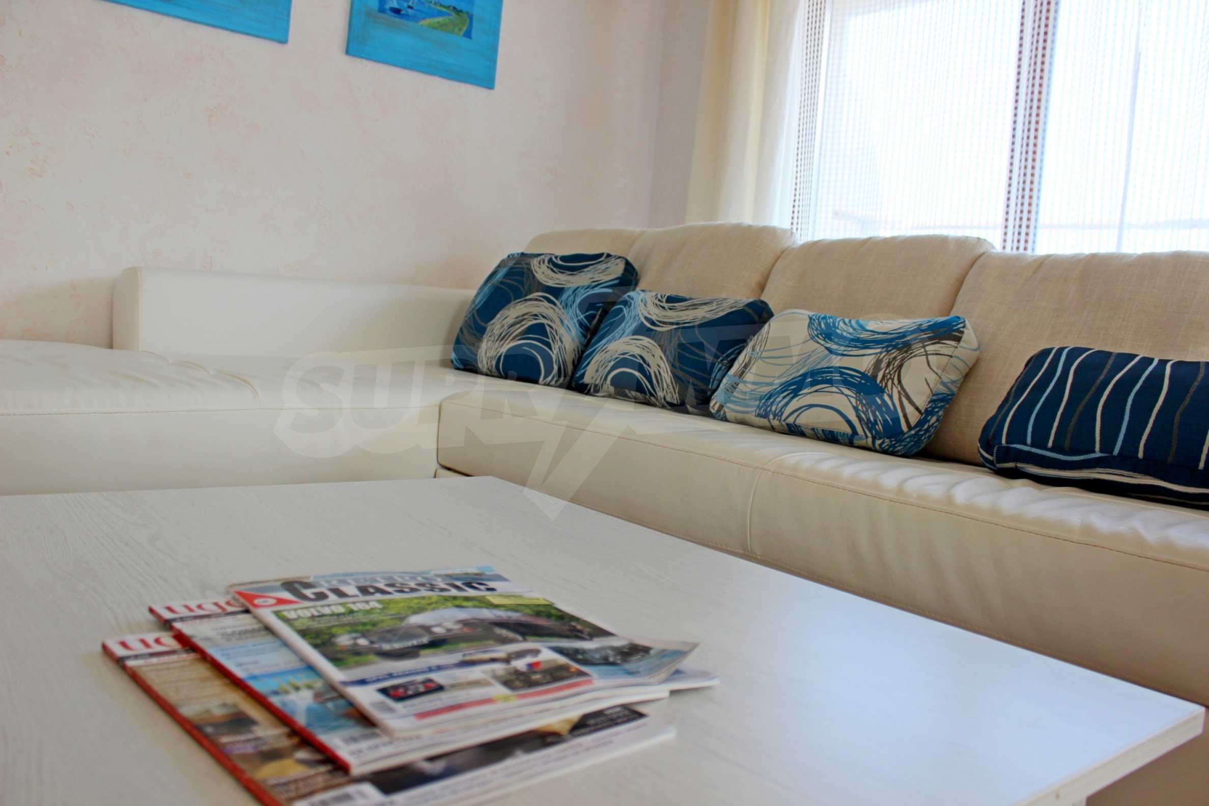 Dekoriert und möbliert Designer, die Wohnung befindet sich im 5. Stock mit Südostausrichtung und hat eine Fläche von 113 qm. Es verfügt über ein unglaublich helles und geräumiges Wohnzimmer mit einem Küchenbereich mit herrlichem Meerblick. Vom Wohnzimmer aus haben Sie Zugang zu einer großen Terrasse mit Blick auf den Strand und das Meer, auf der Sie Ihren morgendlichen Kaffee oder Tee und den schönen Meerblick genießen können. Das Schlafzimmer ist nach Nordwesten ausgerichtet und liegt zum Innenhof des Komplexes, was Ruhe und Frieden garantiert. Das Apartment bietet außerdem ein luxuriös ausgestattetes Badezimmer mit WC sowie eine Gepäckaufbewahrung.
