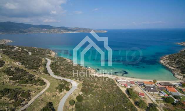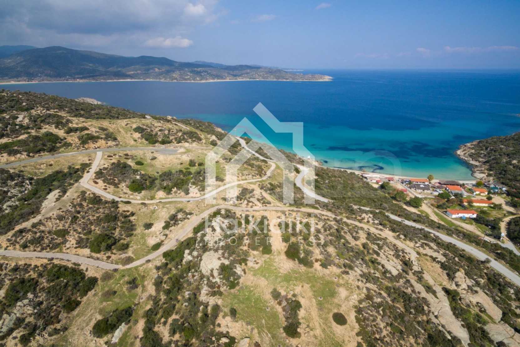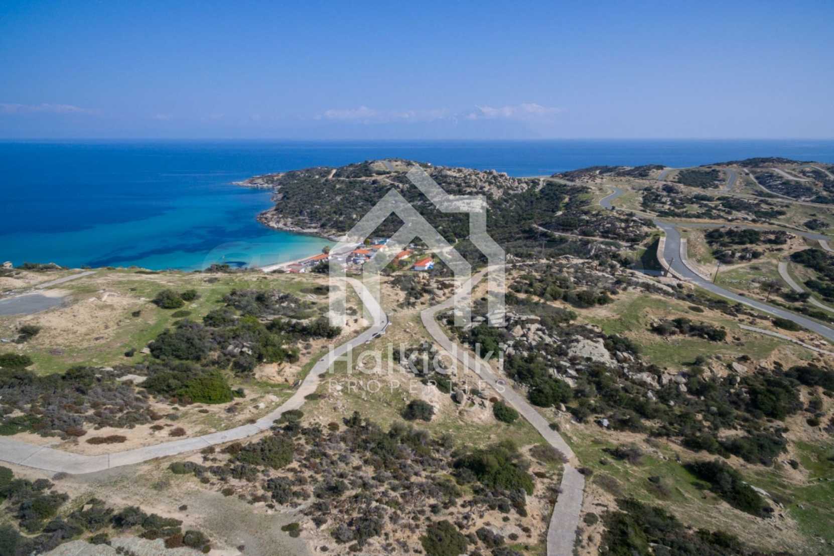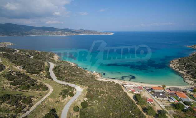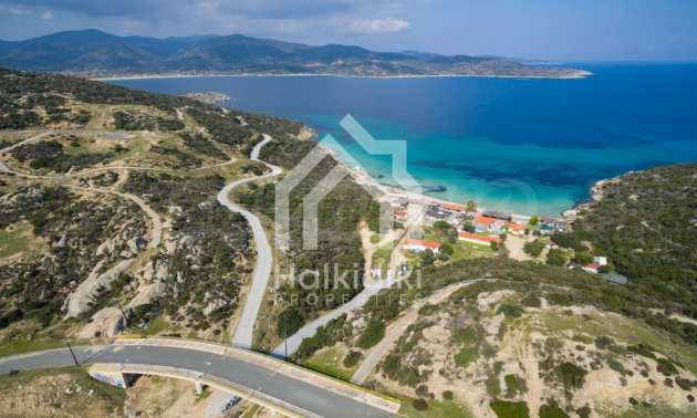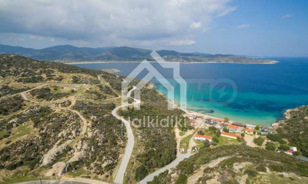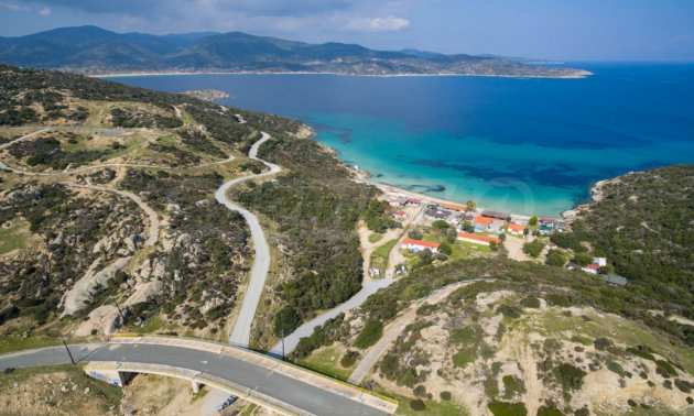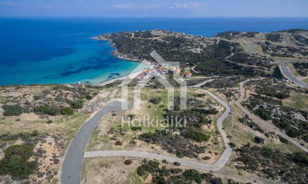 Ecke, schräges Grundstück, 500 m², in Sithonia, Chalkidiki mit unverbauter Sicht und mit östlicher Ausrichtung. Das Grundstück ist nur 100m entfernt. Das Grundstück ist komplett und bebaubar (120m² können bebaut werden). Das Anwesen ist perfekt für den Bau einer Villa.