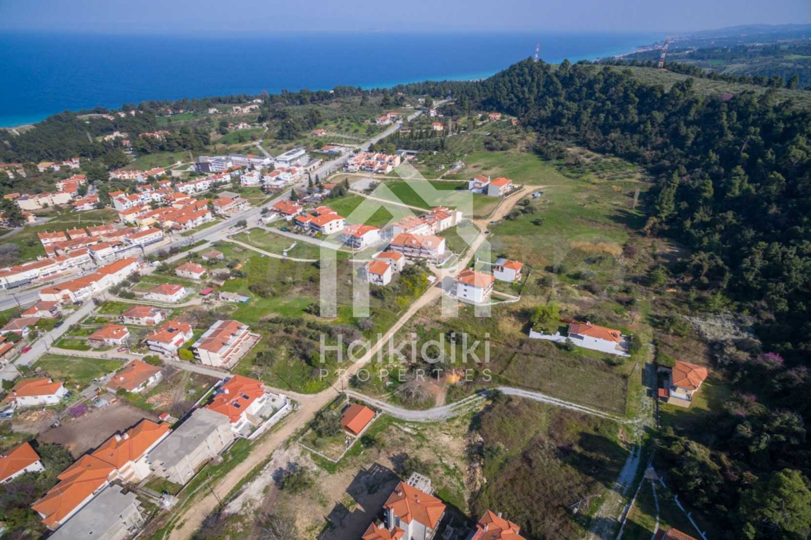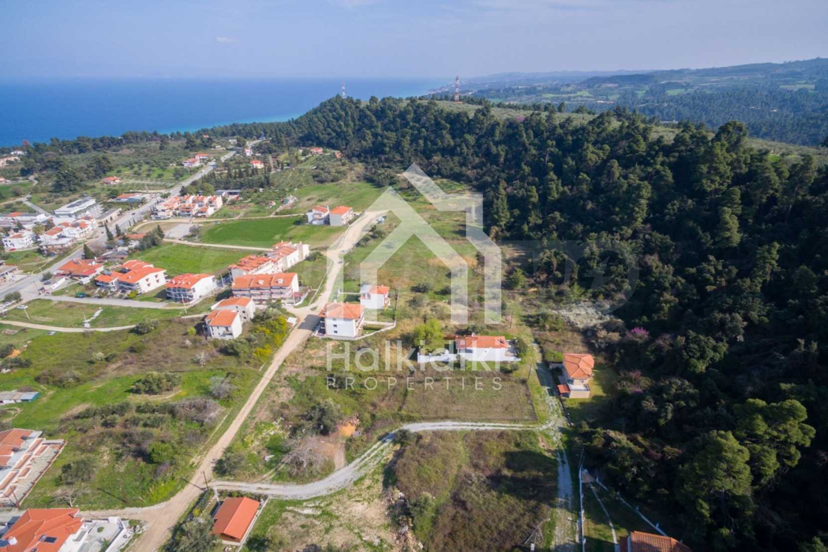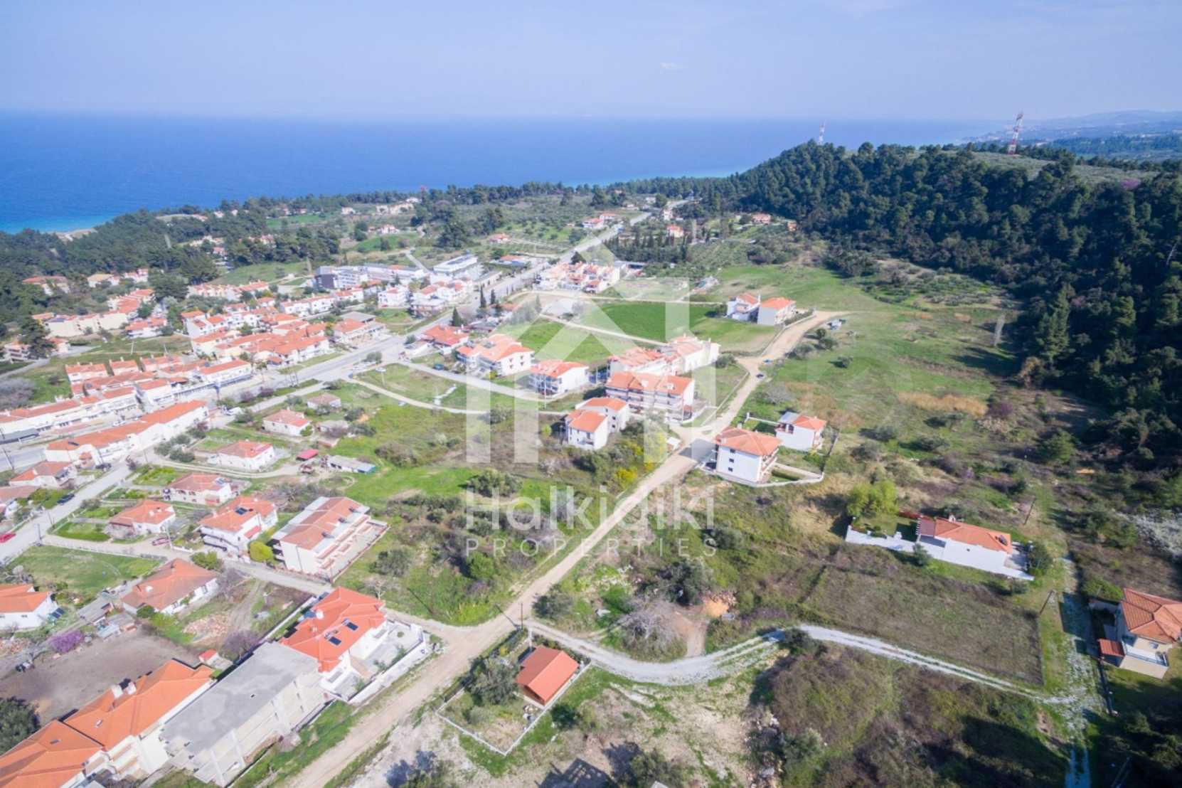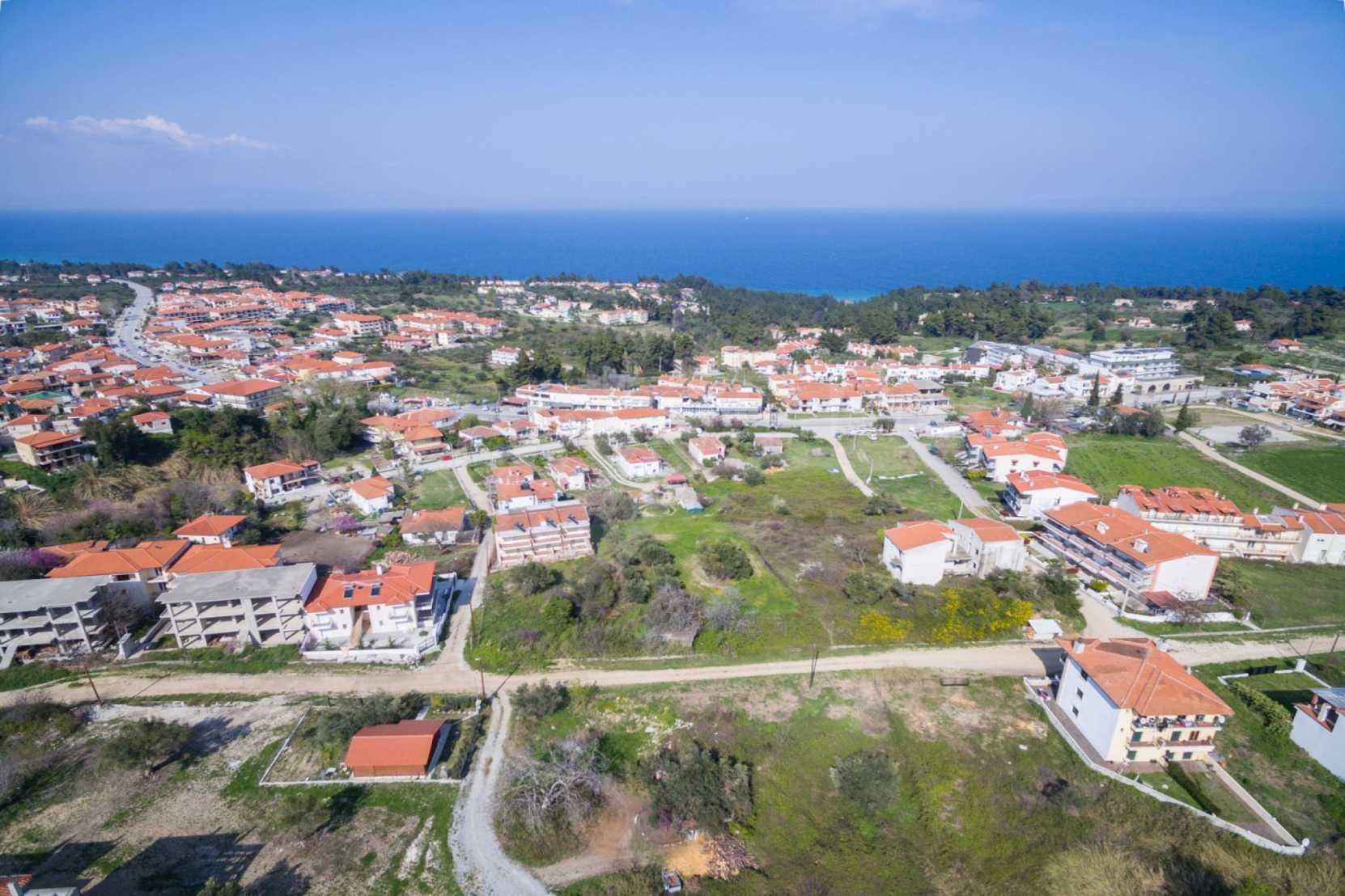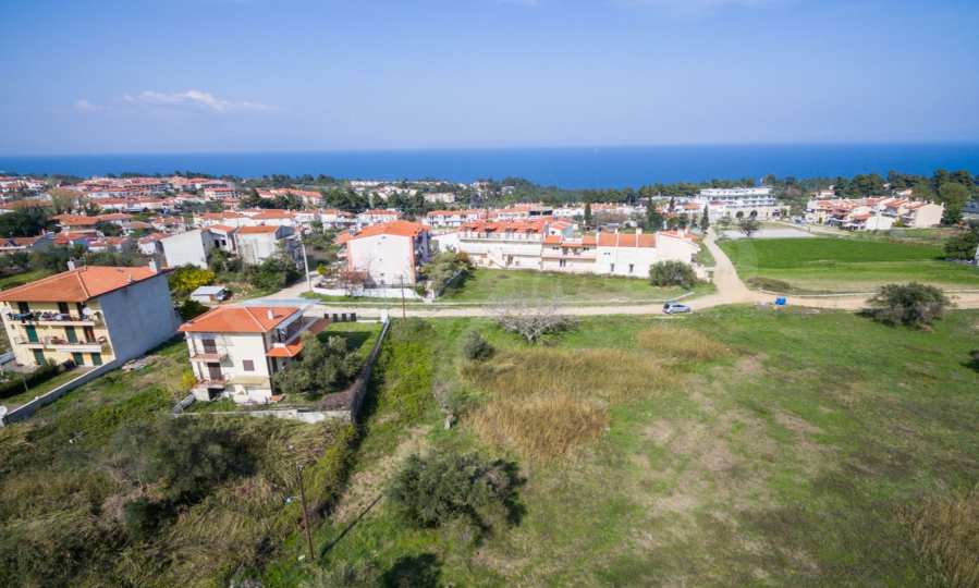 Flaches Grundstück, 398 m², in Kassandra, Chalkidiki mit unverbauter Sicht und mit östlicher Ausrichtung. Das Grundstück ist 1,6 km entfernt. vom Strand entfernt und 600 m. Das Grundstück ist komplett bebaubar und der Baufaktor beträgt 0,6 (240 m² können bebaut werden). Das Anwesen ist perfekt für den Bau einer Villa oder eines Einfamilienhauses.