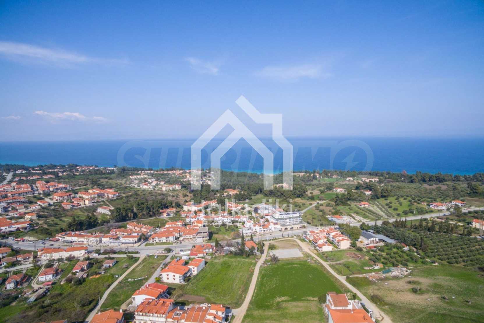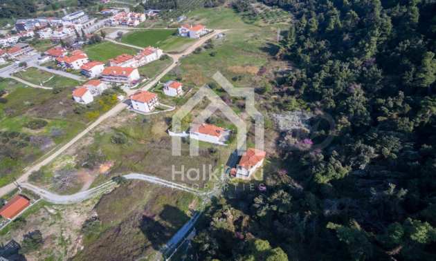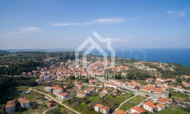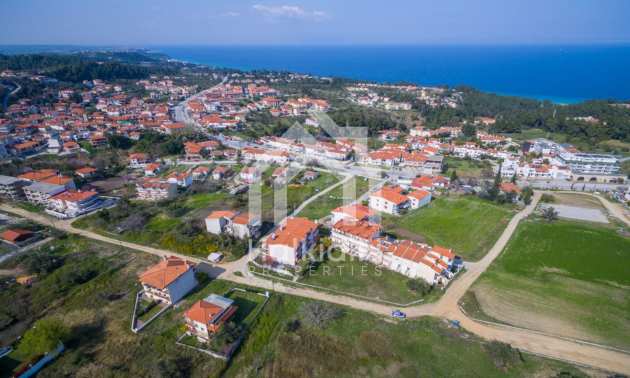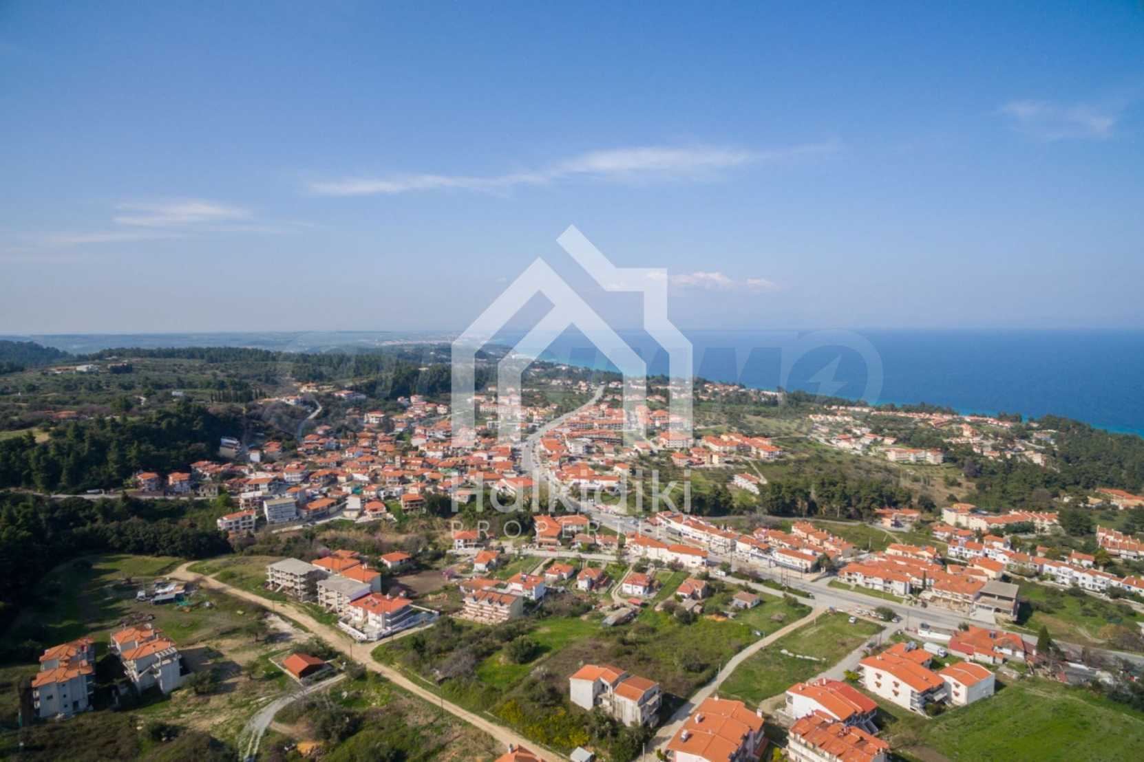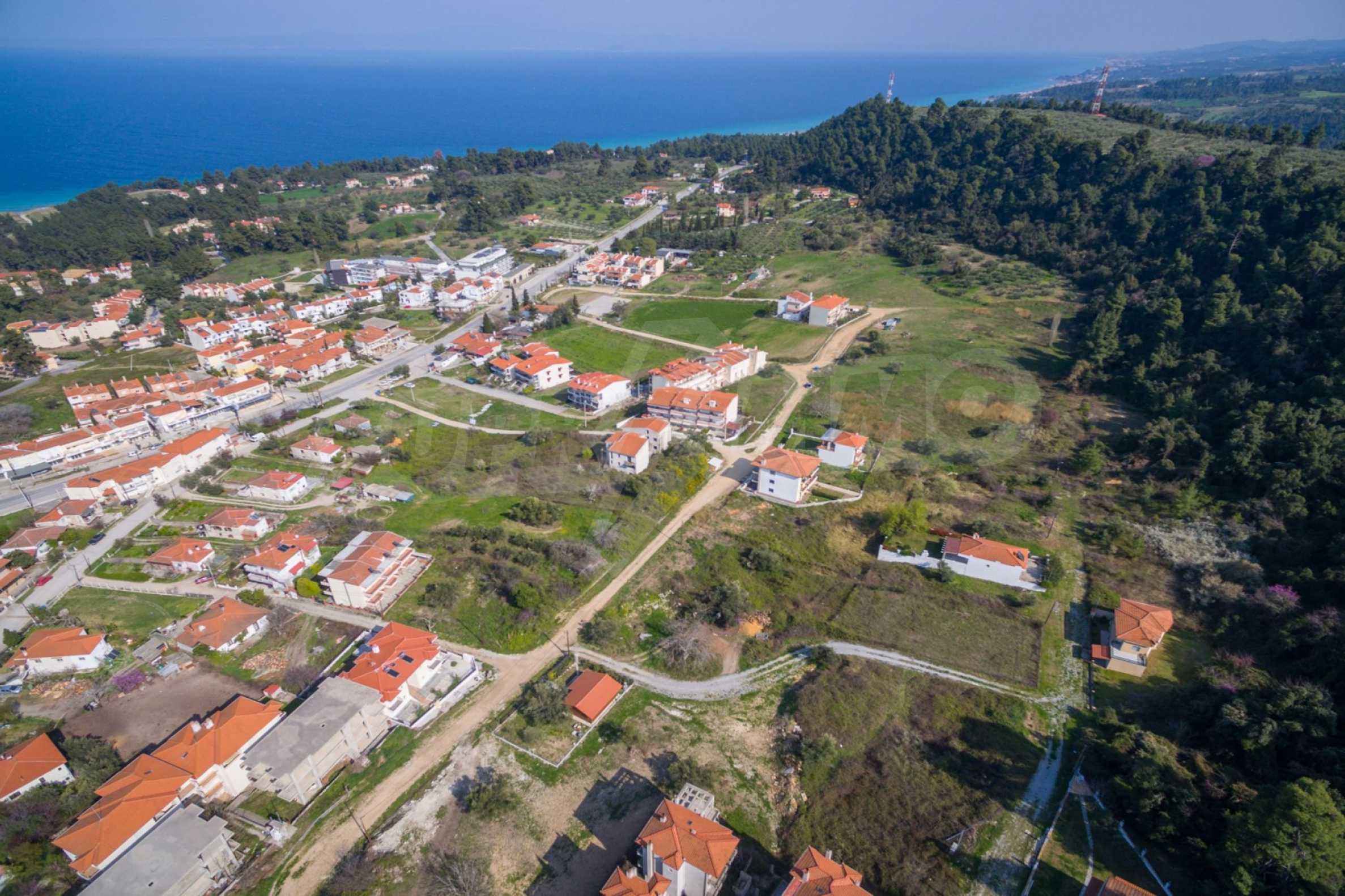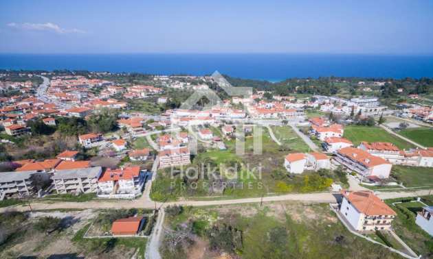 Flaches Grundstück, 398 m², in Kassandra, Chalkidiki mit unverbauter Sicht und mit östlicher Ausrichtung. Das Grundstück ist 1,6 km entfernt. vom Strand entfernt und 600 m. Das Grundstück ist komplett bebaubar und der Baufaktor beträgt 0,6 (240 m² können bebaut werden). Das Anwesen ist perfekt für den Bau einer Villa oder eines Einfamilienhauses.