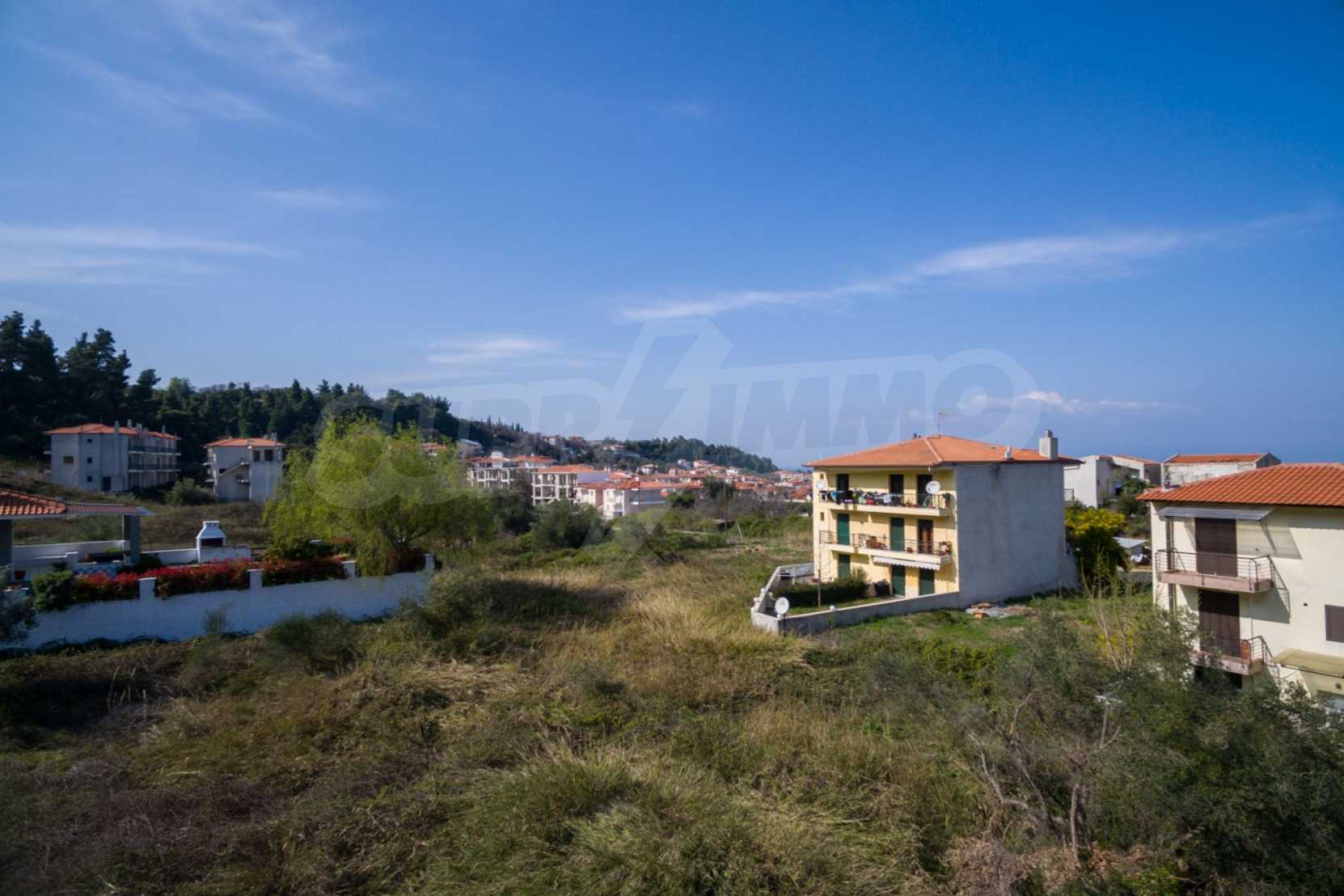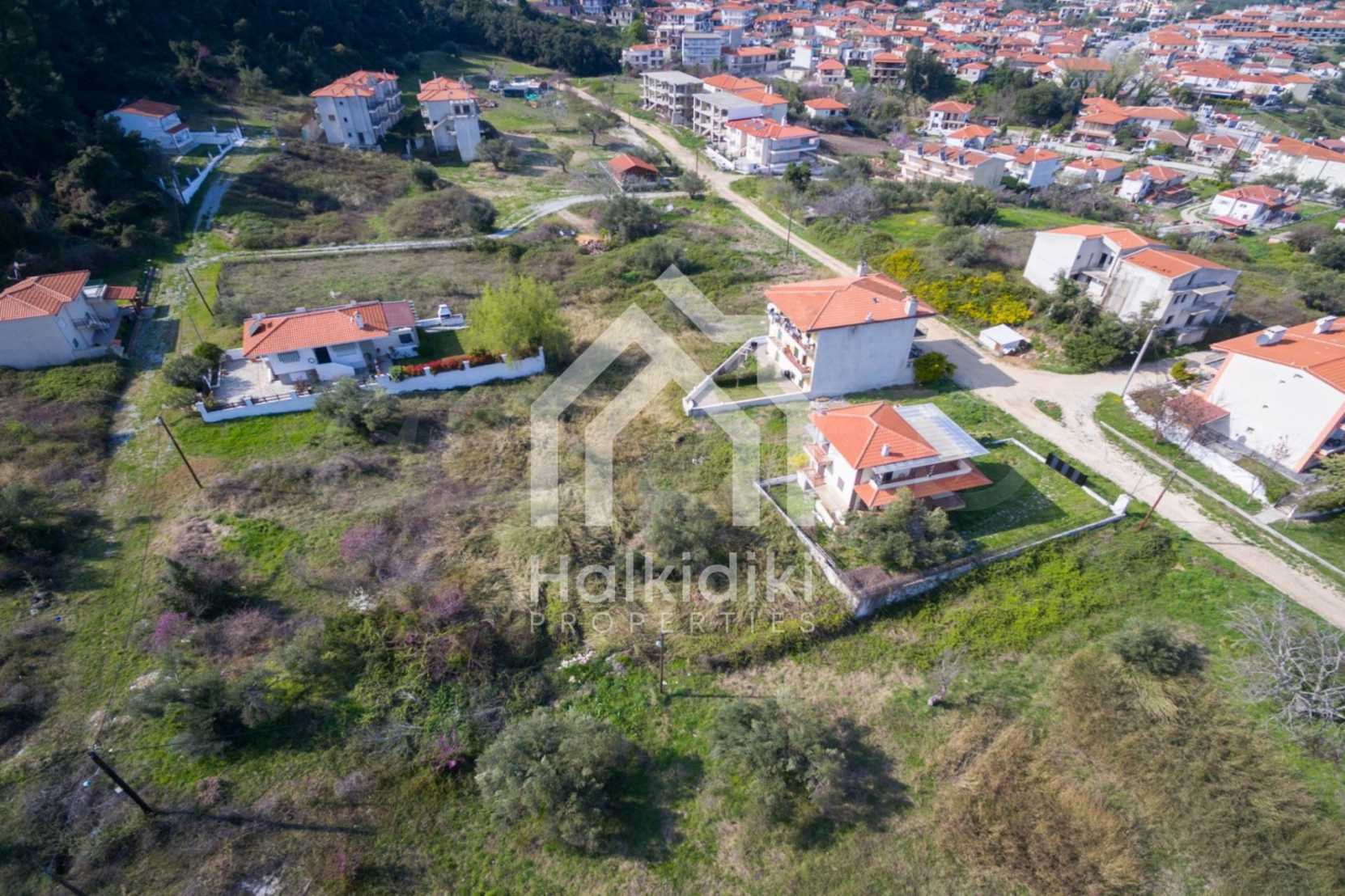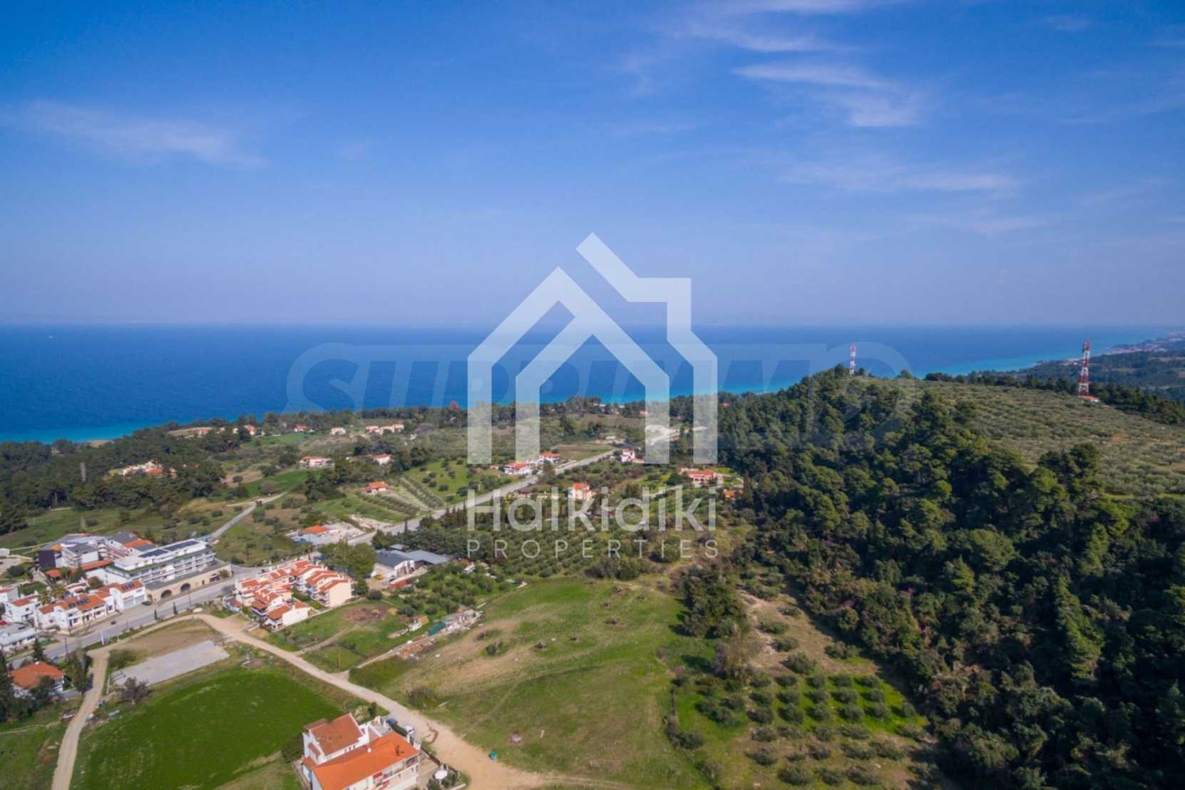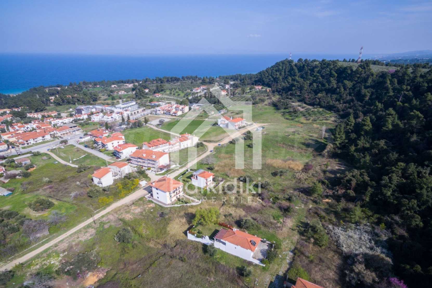 Abgeschrägtes Grundstück, 354 m², in Kassandra, Chalkidiki mit freiem Blick und mit östlicher Ausrichtung. Das Grundstück ist 600 m groß. Das eingezäunte Grundstück ist komplett bebaubar und der Baufaktor beträgt 0,6 (212 m² können bebaut werden).