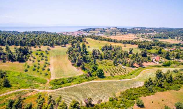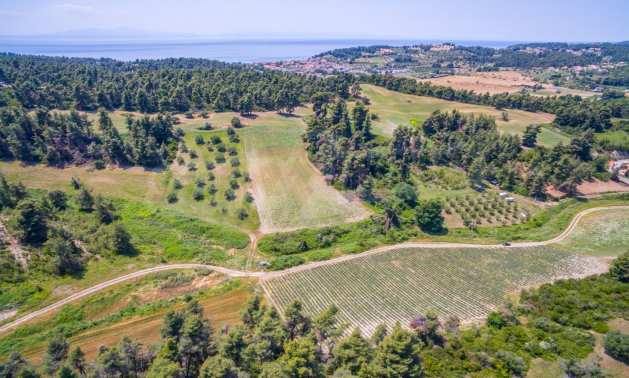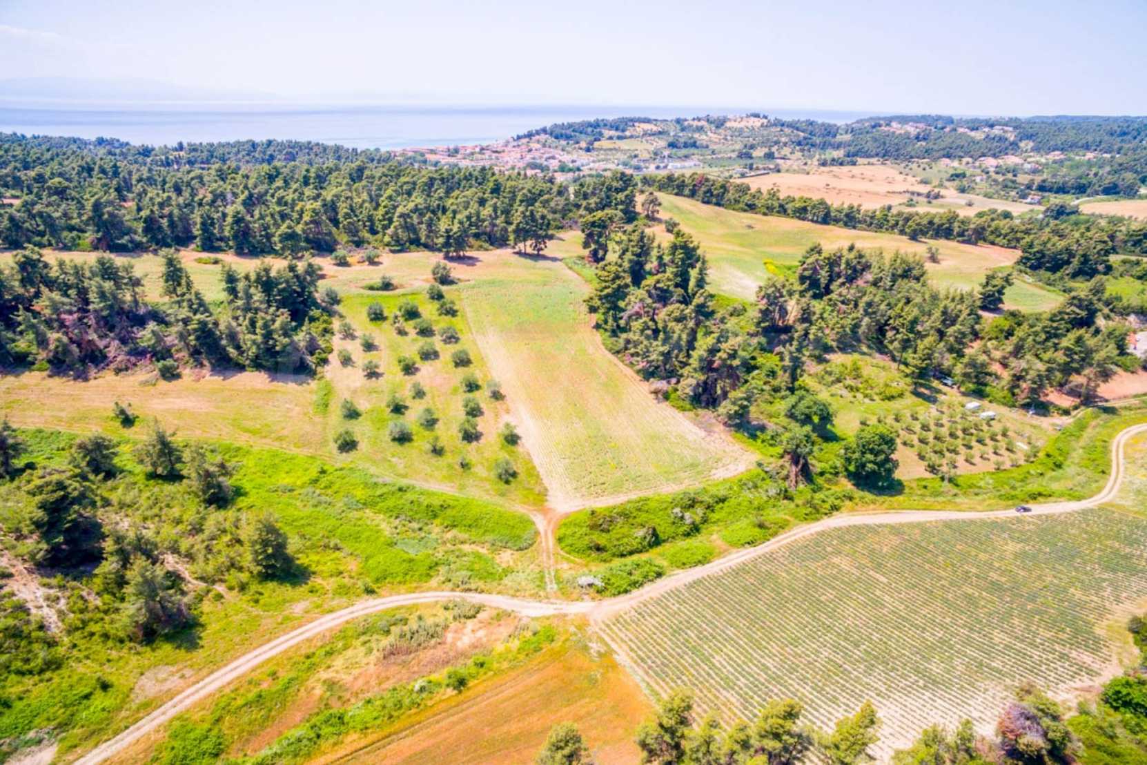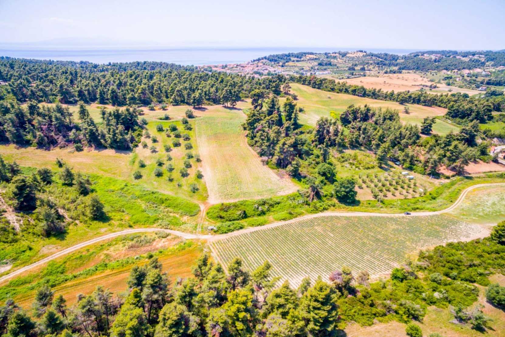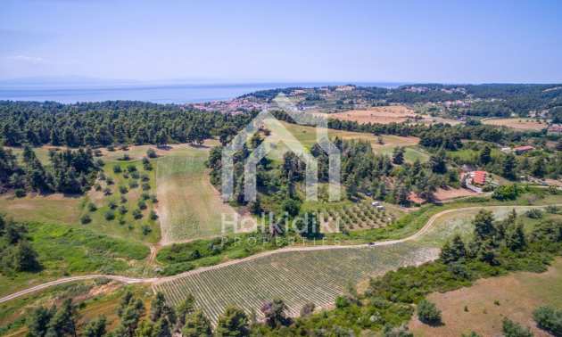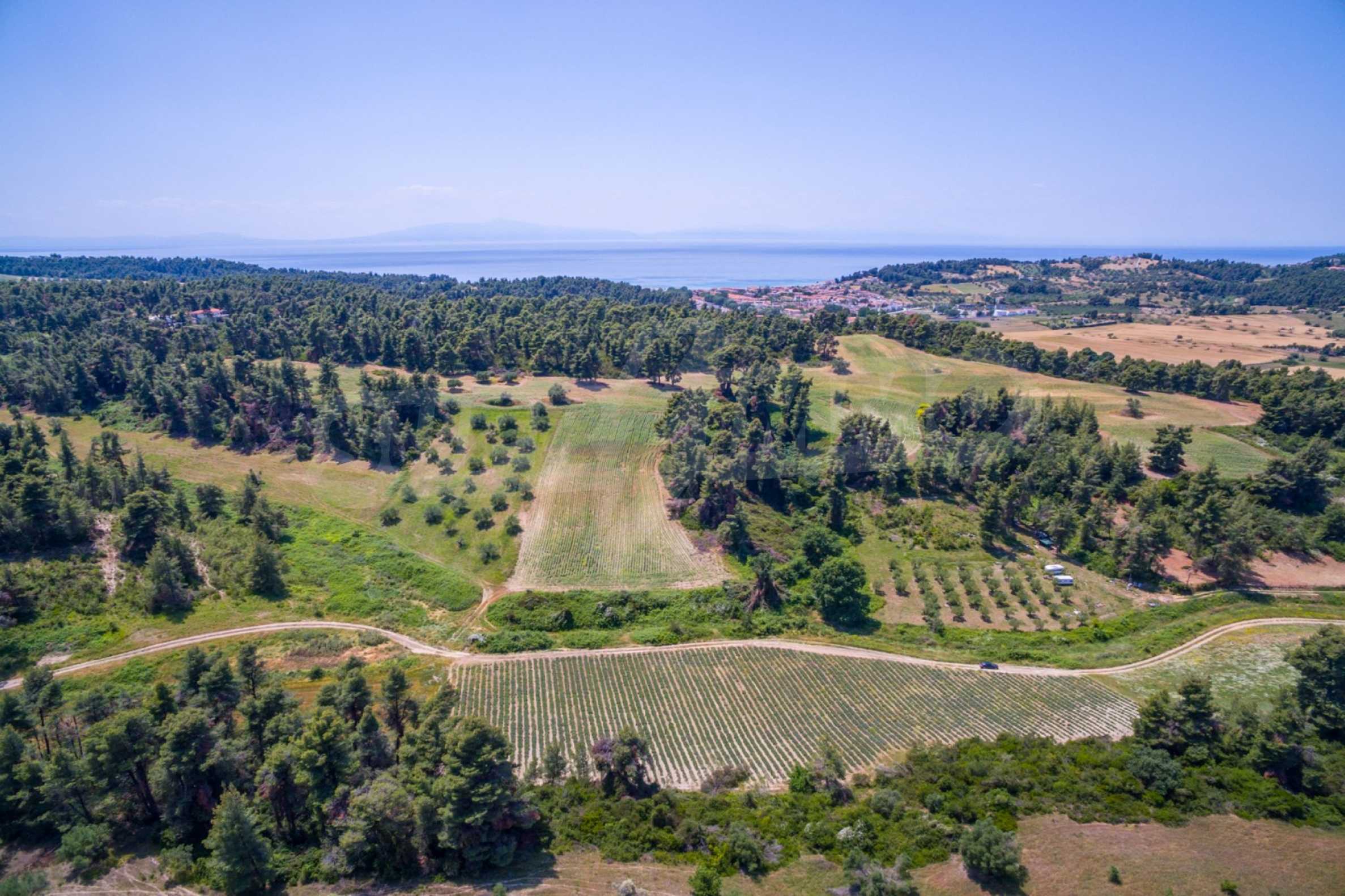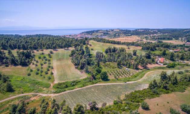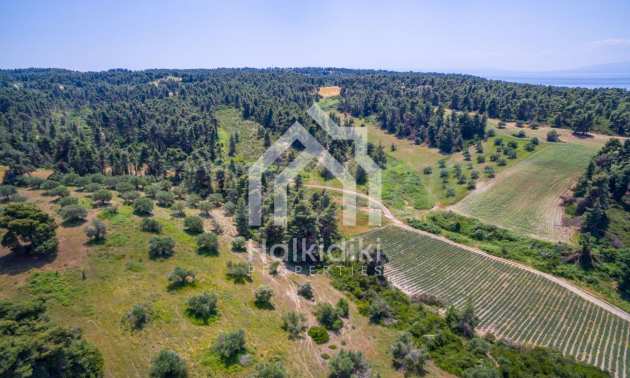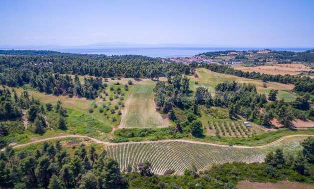 Amphitheaterfeld, 18.780 m², in Kassandra, Chalkidiki, mit unverbauter Sicht und mit östlicher Ausrichtung. Das Grundstück ist 2 km entfernt. weg von einem schönen Strand und vom Zentrum des Dorfes. Das Feld, das komplett und bebaubar ist (800 m² können gebaut werden), ist in vier Äquivalente unterteilt.