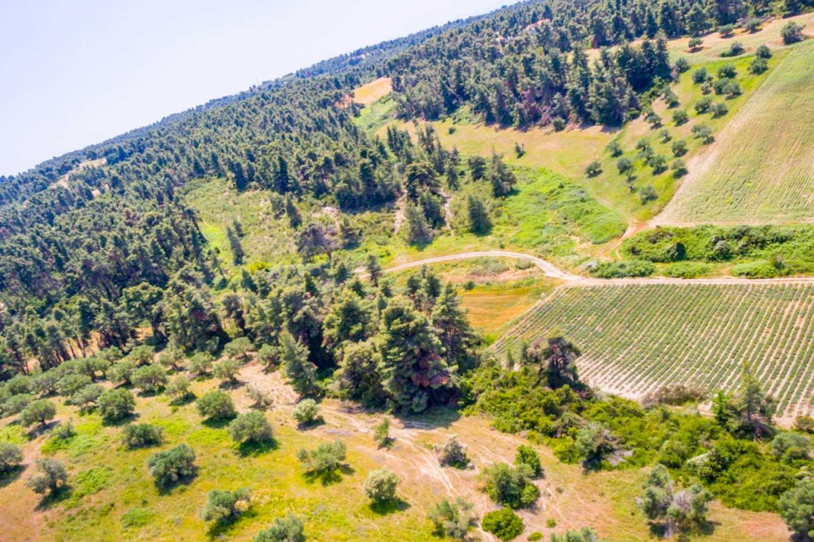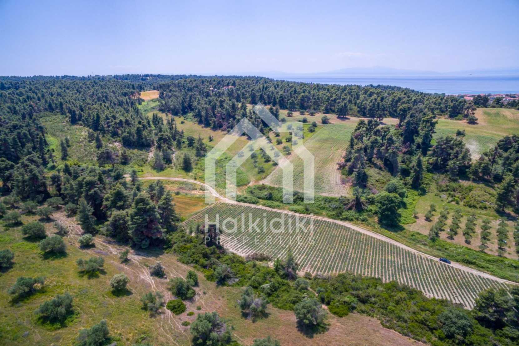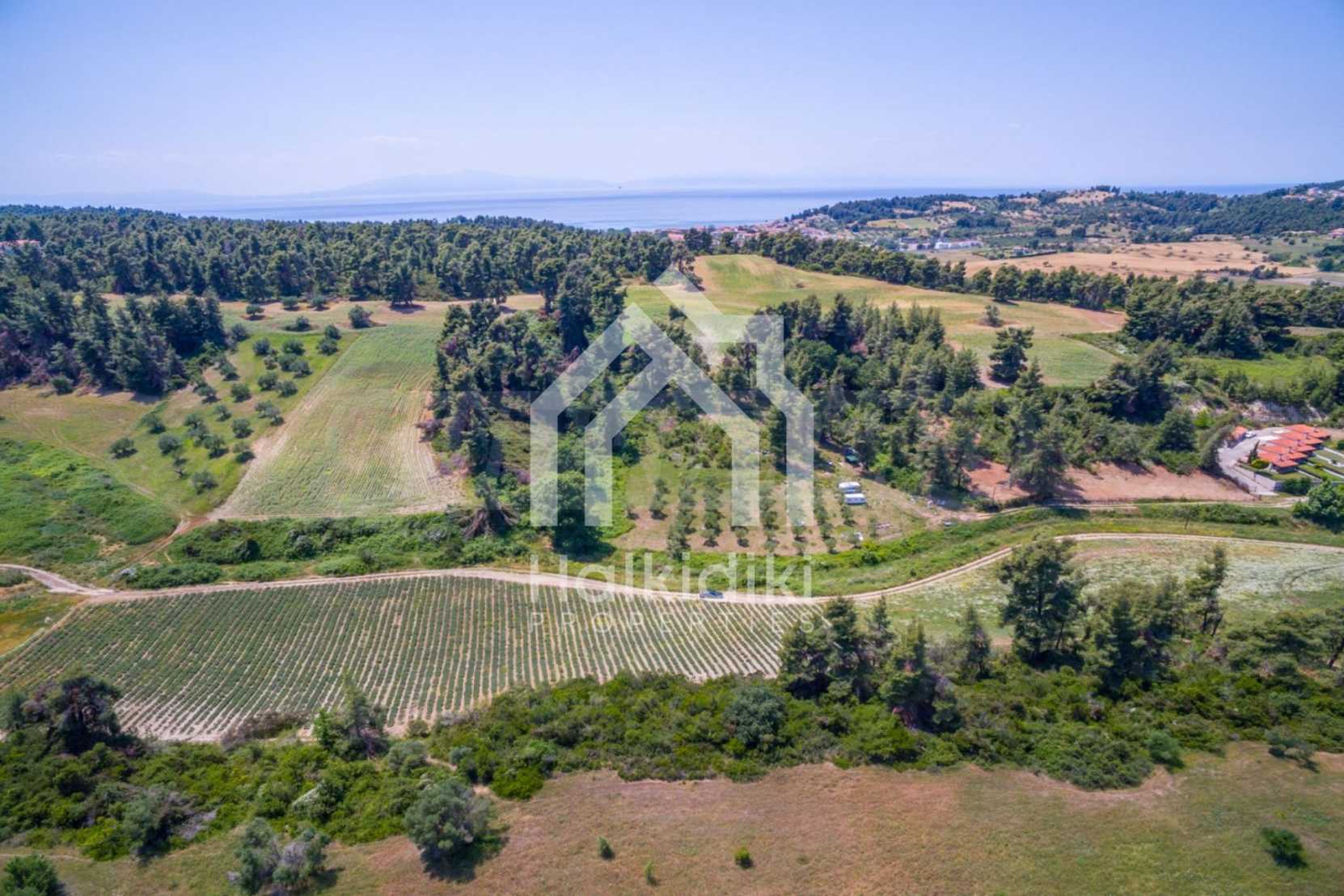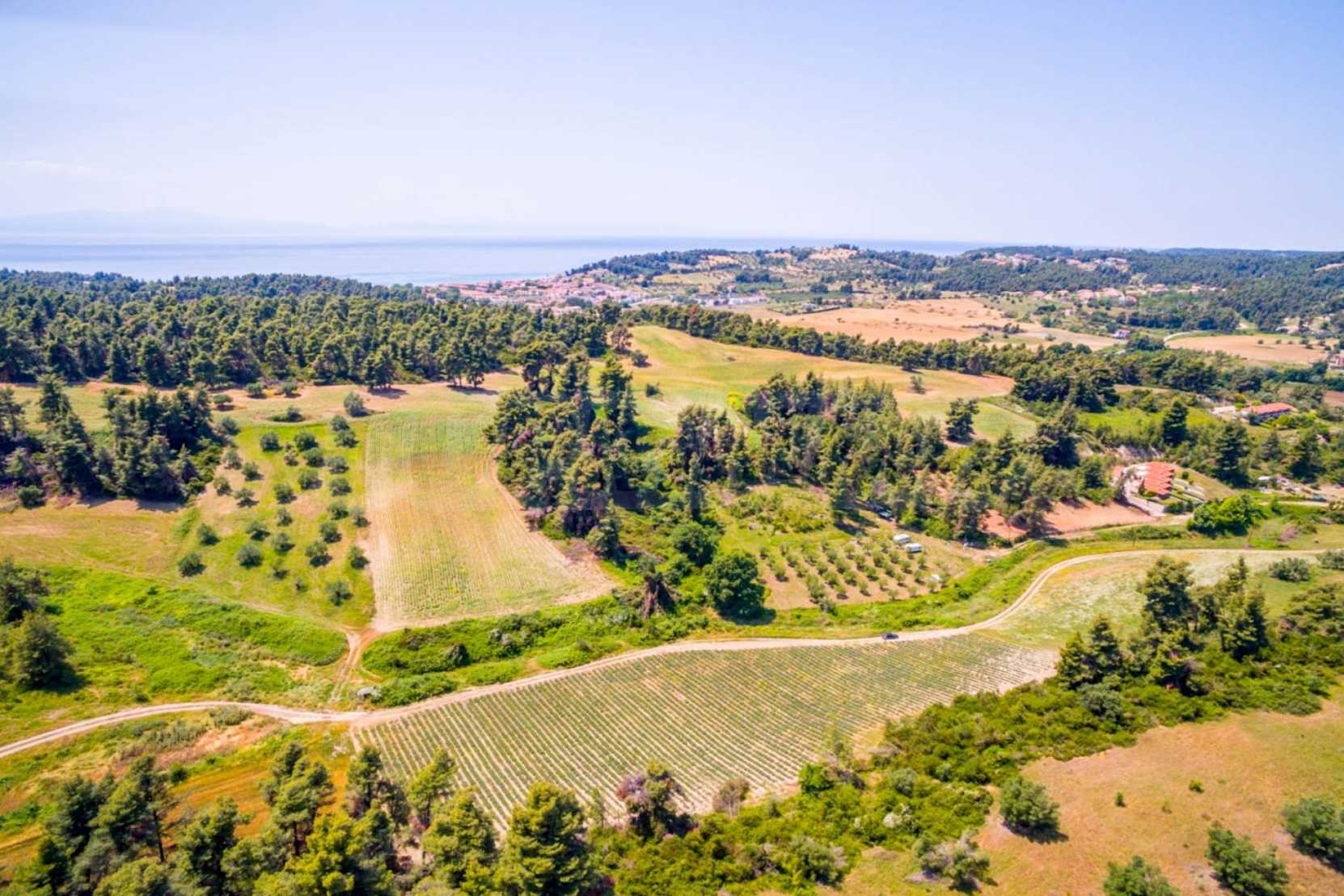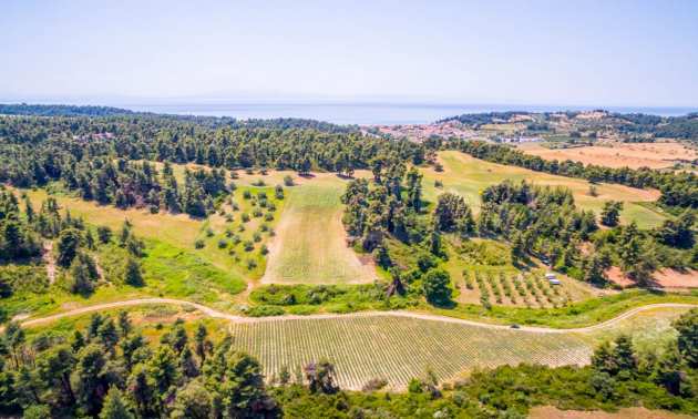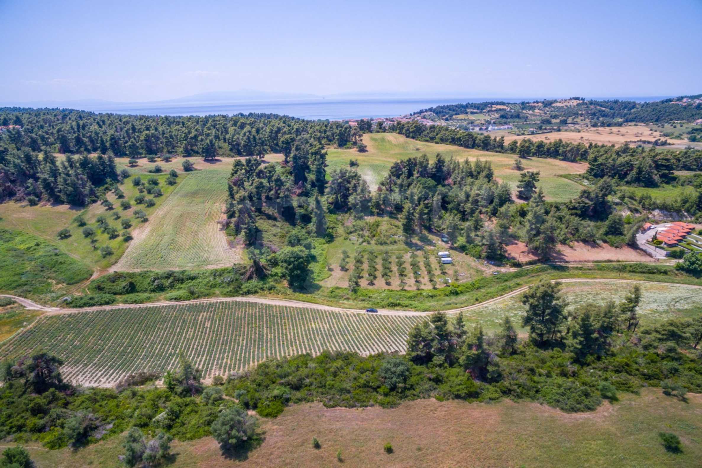 Amphitheaterfeld, 18.780 m², in Kassandra, Chalkidiki, mit unverbauter Sicht und mit östlicher Ausrichtung. Das Grundstück ist 2 km entfernt. weg von einem schönen Strand und vom Zentrum des Dorfes. Das Feld, das komplett und bebaubar ist (800 m² können gebaut werden), ist in vier Äquivalente unterteilt.
