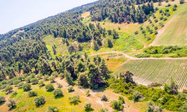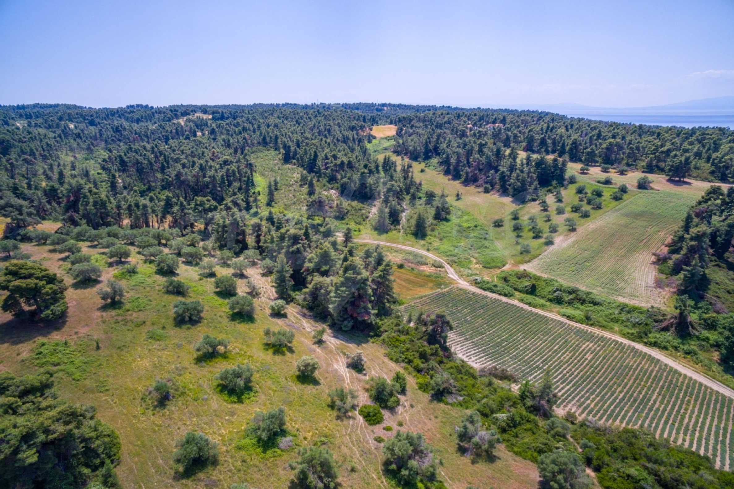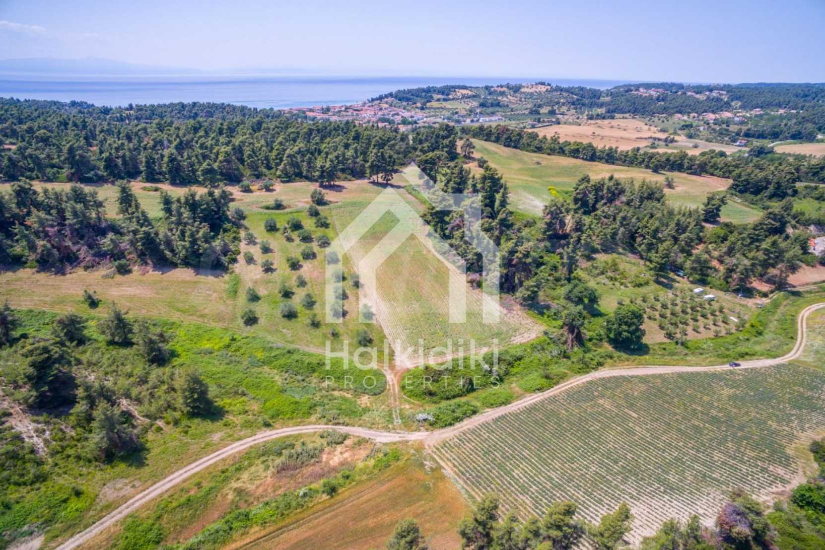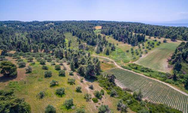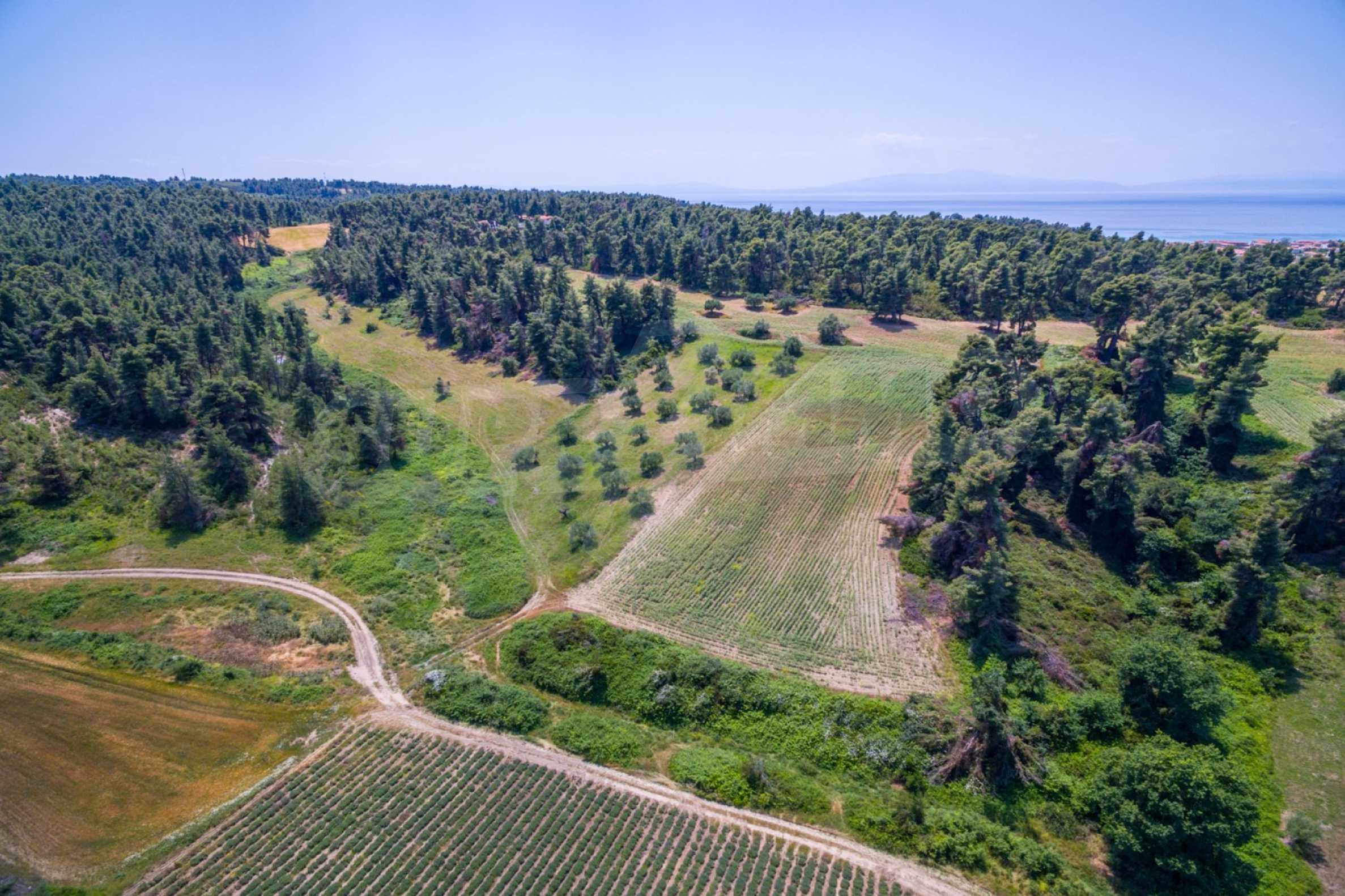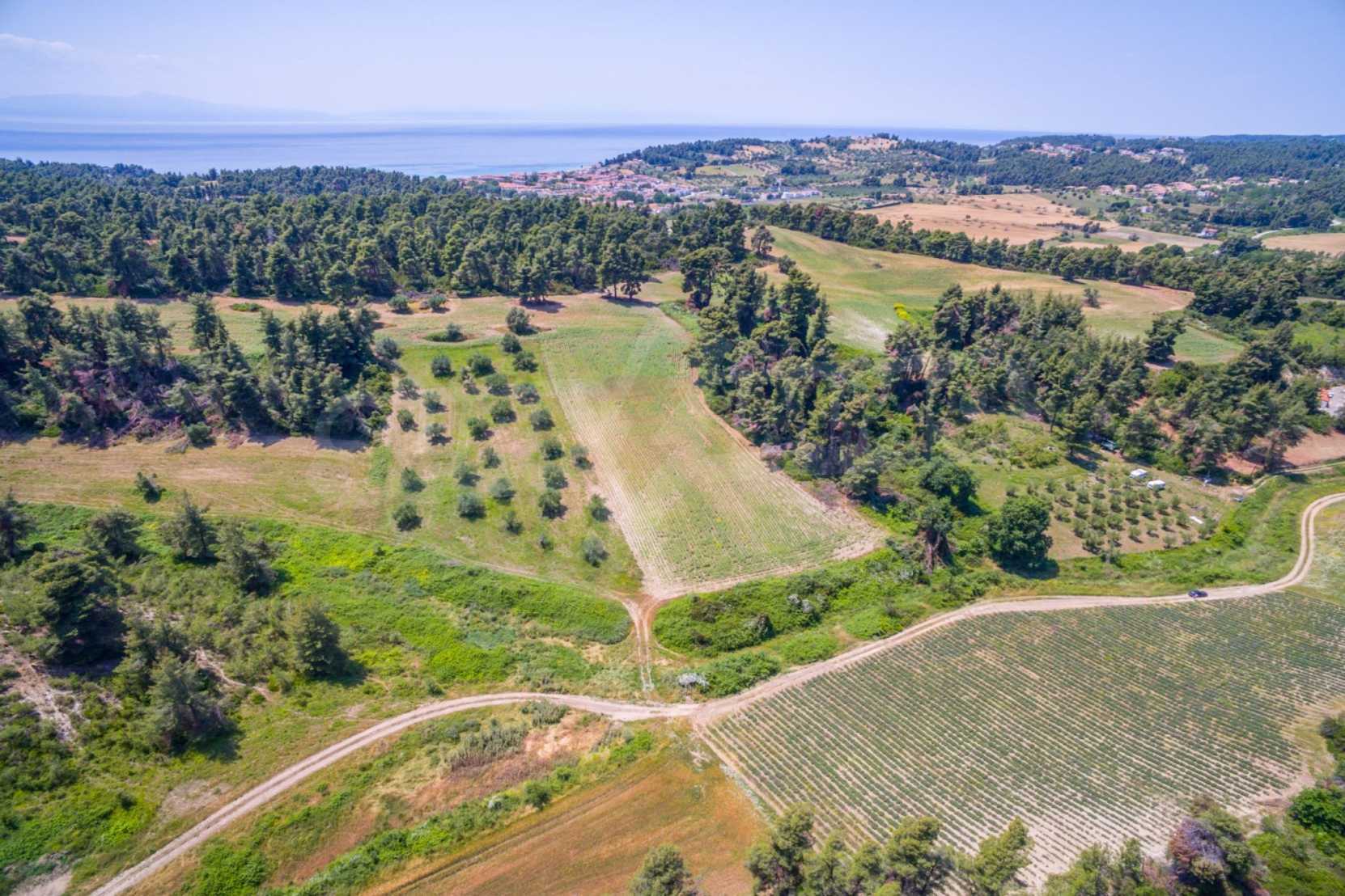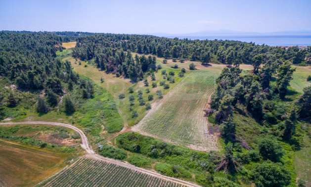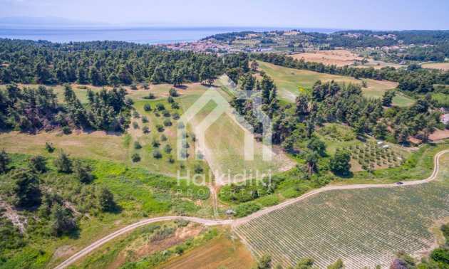 Amphitheaterfeld, 18.780 m², in Kassandra, Chalkidiki, mit unverbauter Sicht und mit östlicher Ausrichtung. Das Grundstück ist 2 km entfernt. weg von einem schönen Strand und vom Zentrum des Dorfes. Das Feld, das komplett und bebaubar ist (800 m² können gebaut werden), ist in vier Äquivalente unterteilt.
