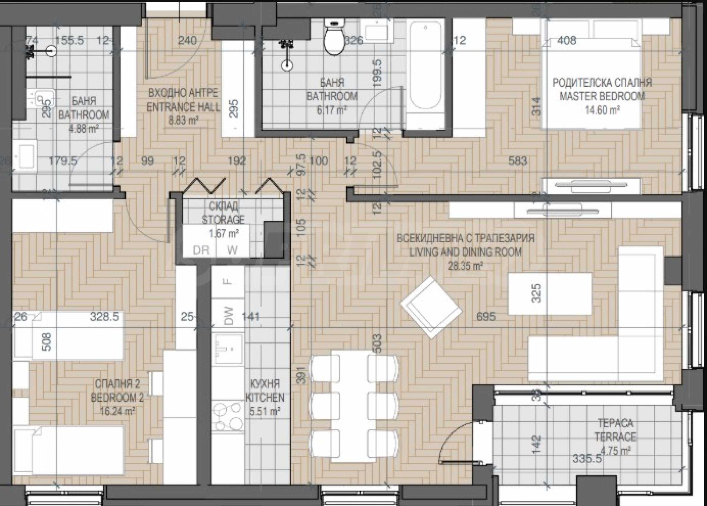 Wir präsentieren eine Dreizimmerwohnung in einem neuen Luxusgebäude. Die Wohnung hat eine Fläche von 128,56 qm und besteht aus: zwei Schlafzimmern, einer Küchenzeile, einem Wohnzimmer mit Esszimmer, zwei Badezimmern mit WC und einem Abstellraum (Speisekammer). Die Wohnung befindet sich im 2. Stock eines 15-stöckigen Luxusgebäudes, Teil eines neuen Wohnkomplexes mit Einzelhandelsflächen und einem SPA im Zentrum von Plovdiv.