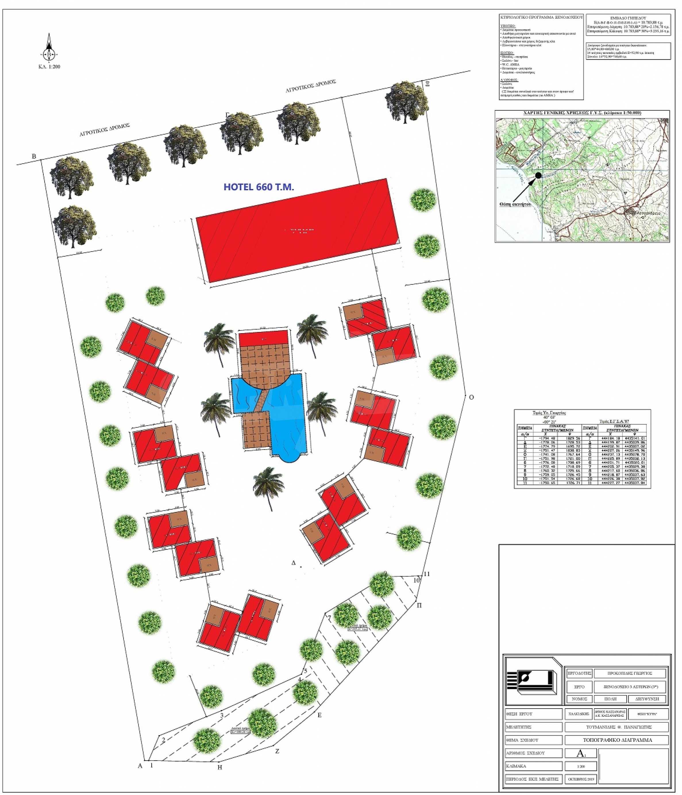 Für das Hotel wurde ein vorläufiges Projekt vorbereitet, einschließlich eines Hauptgebäudes mit einer Fläche von 660 m². Mit 22 Doppelzimmern, Lobby, Rezeption, Restaurant, Personal- und Hauswirtschaftsräumen, 14 Häusern Junior Suite mit einer Fläche von 52,90 m². jeweils und ein Pool von 150 qm. Die 14 Häuser können eine Fläche von bis zu 80 qm haben. Gesamtfläche jedes oder verschiedene Quadrate jedes Hauses separat nach den Wünschen und Ansichten des Kunden anzuwenden.