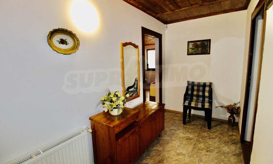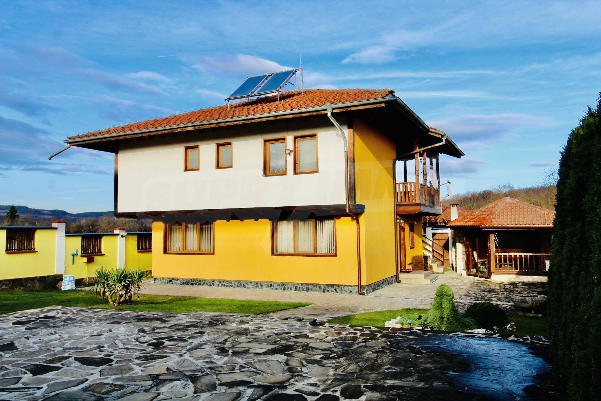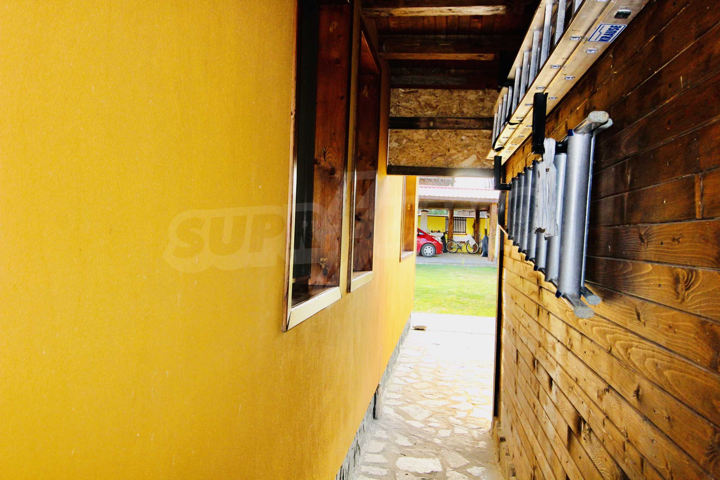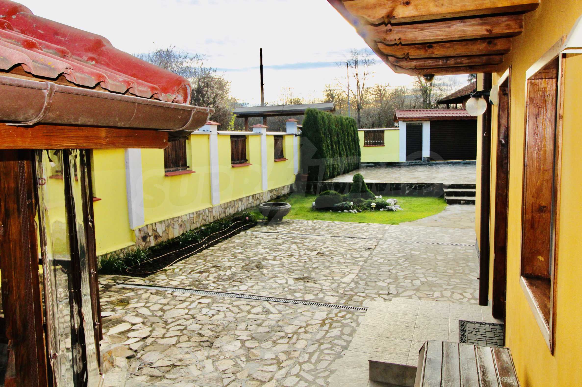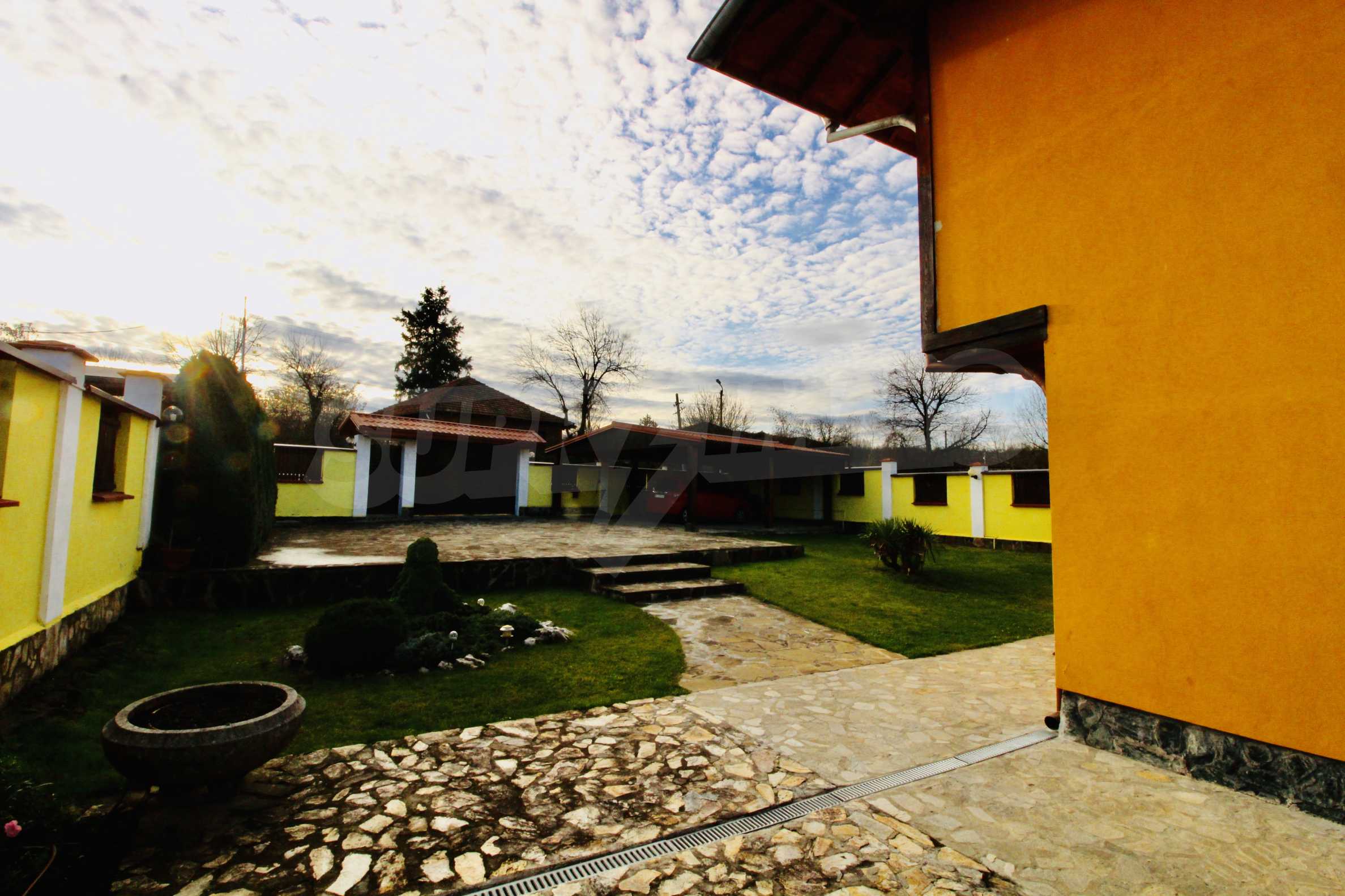 Auf der ersten Ebene gibt es eine Küche, ein großes Esszimmer mit Wohnzimmer und Kamin, ein Schlafzimmer mit Bad und WC. Auf der zweiten Etage befinden sich drei Schlafzimmer mit drei Bädern und Toiletten, eine große Terrasse. Die beiden Etagen haben separate Eingänge und können unabhängig voneinander bewohnt werden.Im Hof gibt es eine Sommerküche und einen Grill mit Backofen. Es gibt einen separaten Heizraum mit Pelletsheizung, der das gesamte Gebäude versorgt.