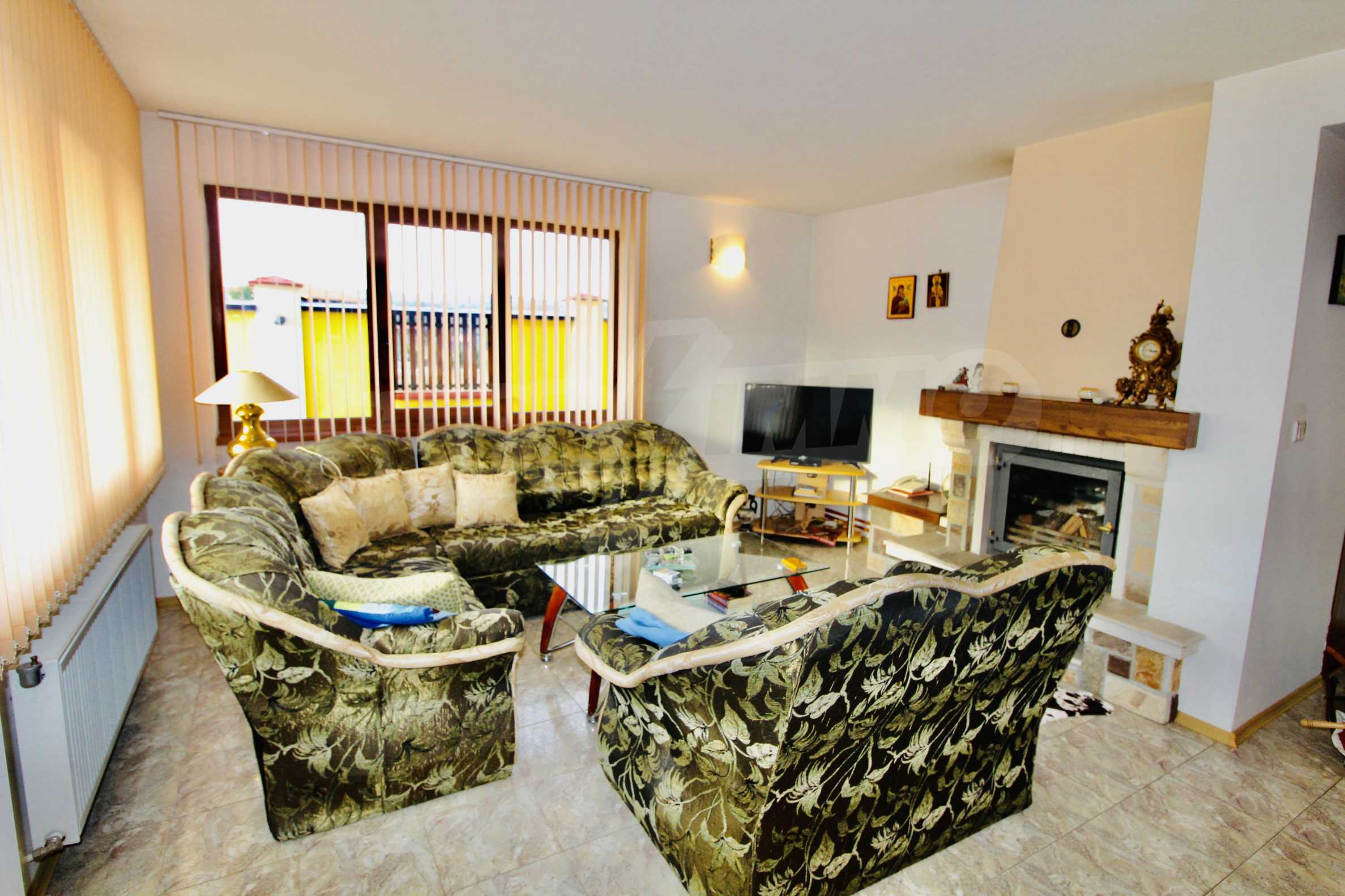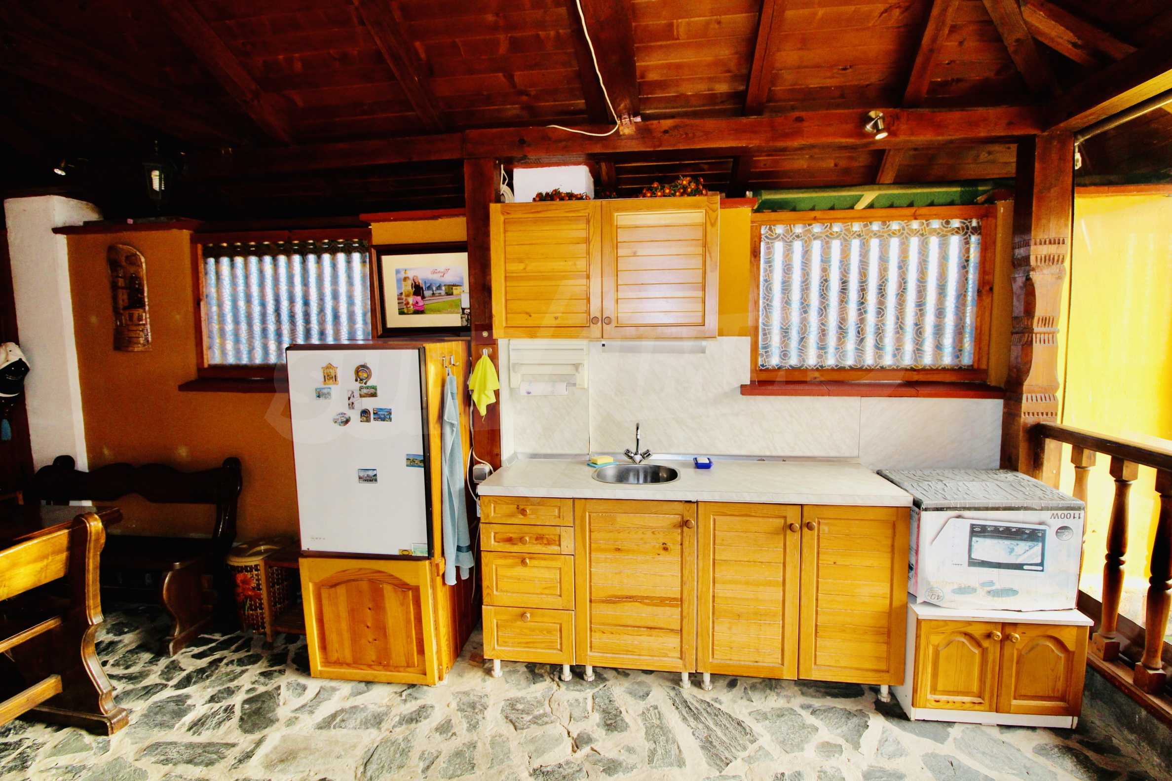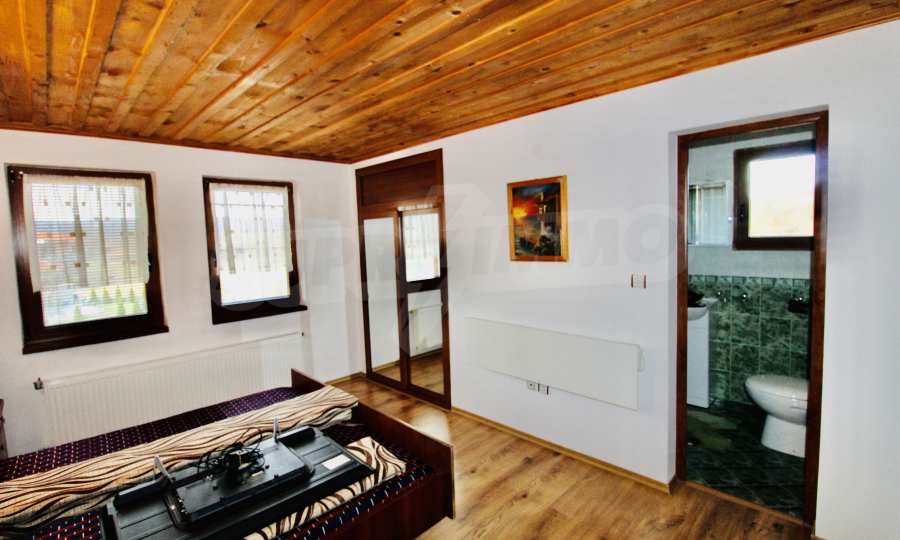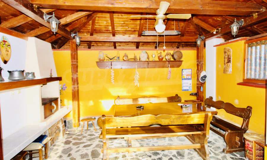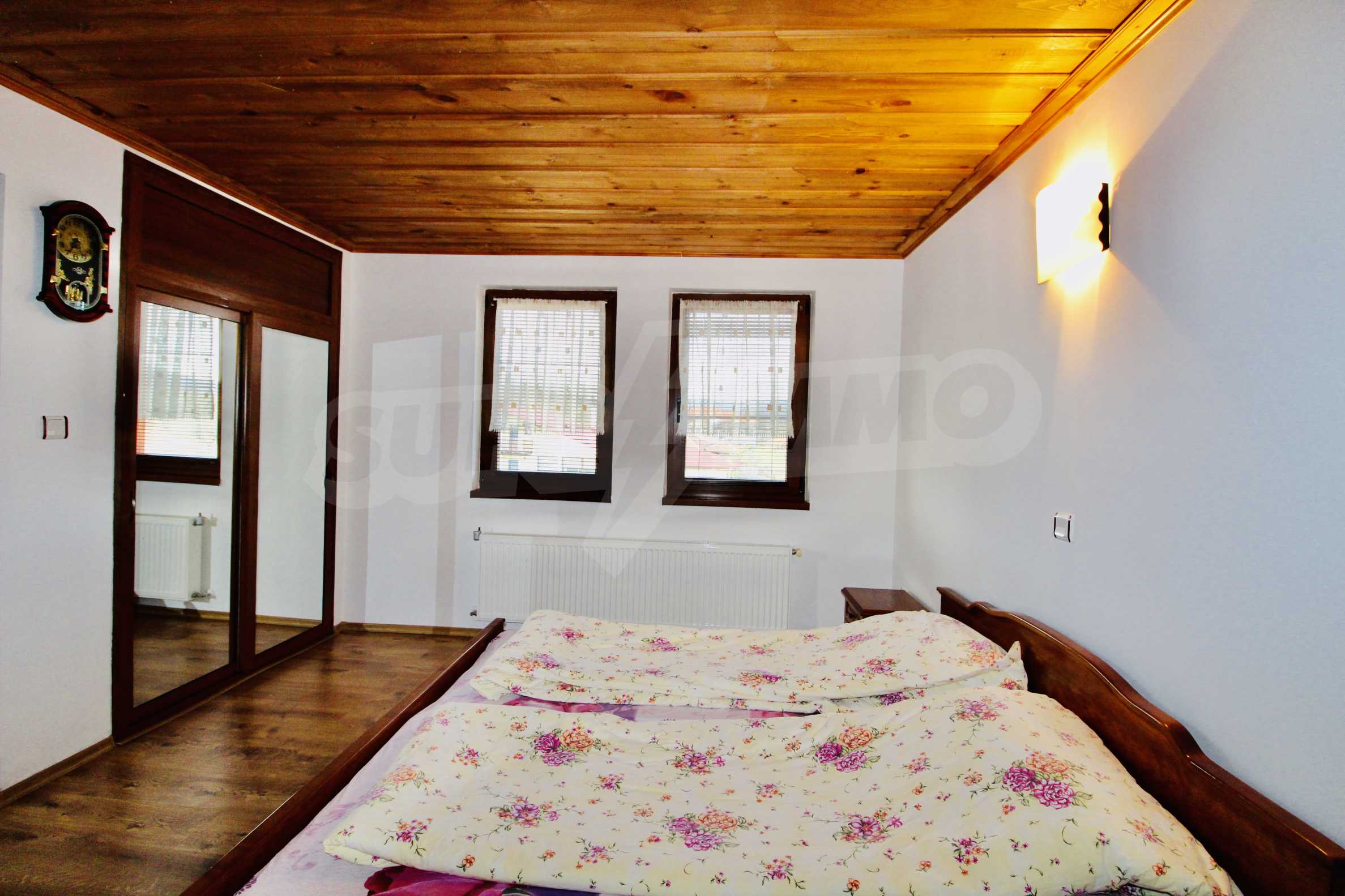 Auf der ersten Ebene gibt es eine Küche, ein großes Esszimmer mit Wohnzimmer und Kamin, ein Schlafzimmer mit Bad und WC. Auf der zweiten Etage befinden sich drei Schlafzimmer mit drei Bädern und Toiletten, eine große Terrasse. Die beiden Etagen haben separate Eingänge und können unabhängig voneinander bewohnt werden.Im Hof gibt es eine Sommerküche und einen Grill mit Backofen. Es gibt einen separaten Heizraum mit Pelletsheizung, der das gesamte Gebäude versorgt.