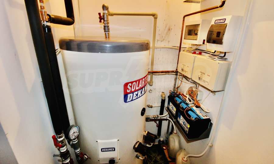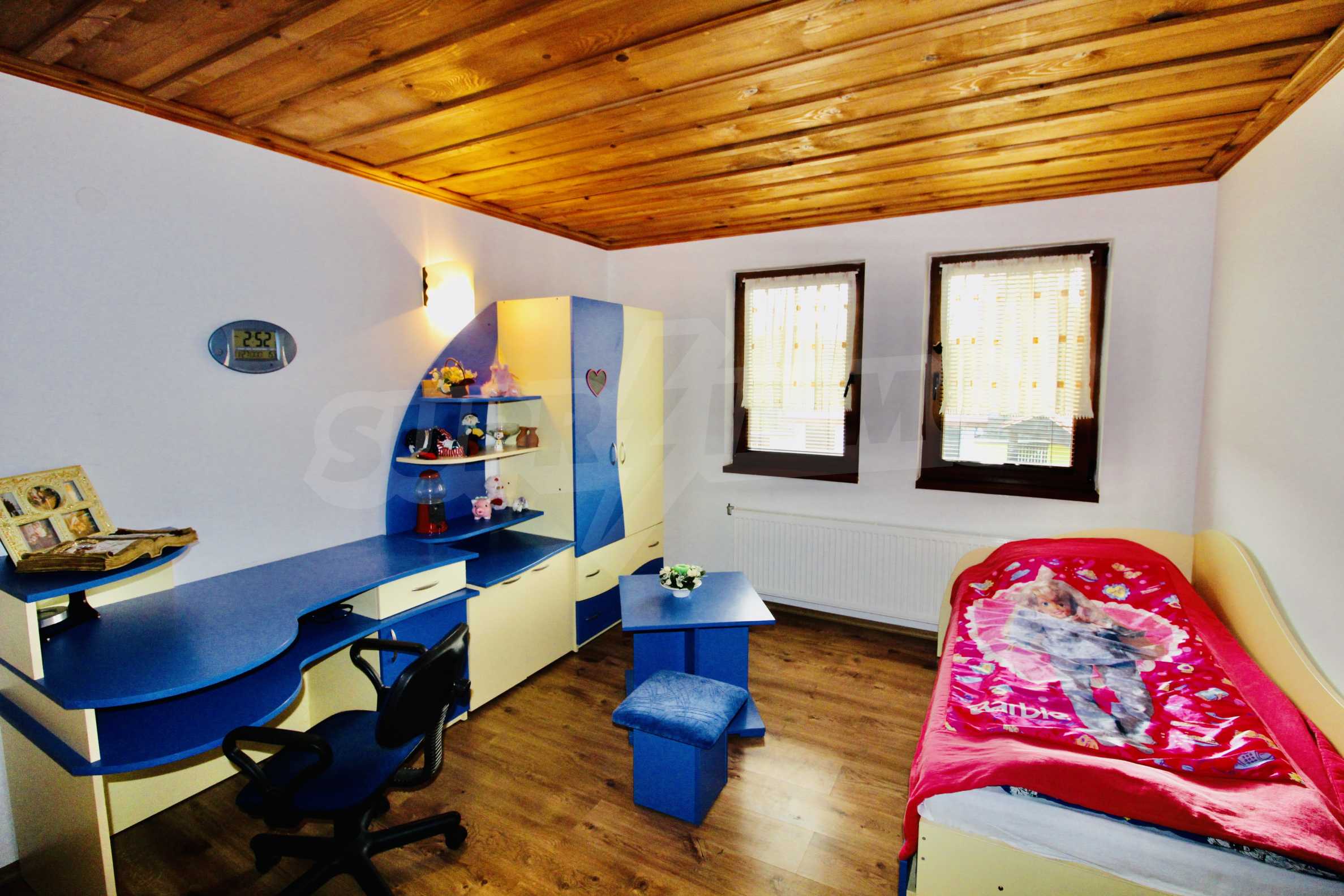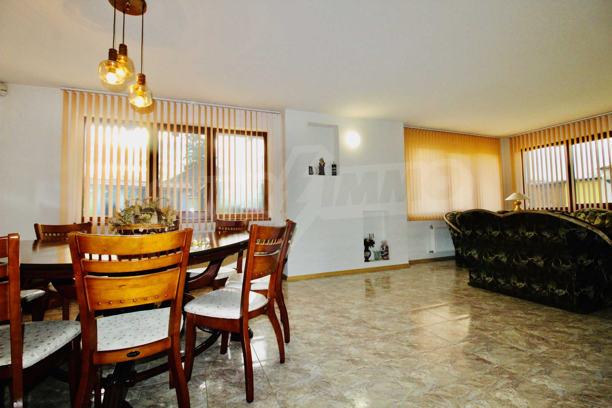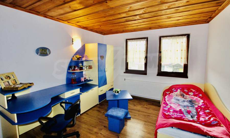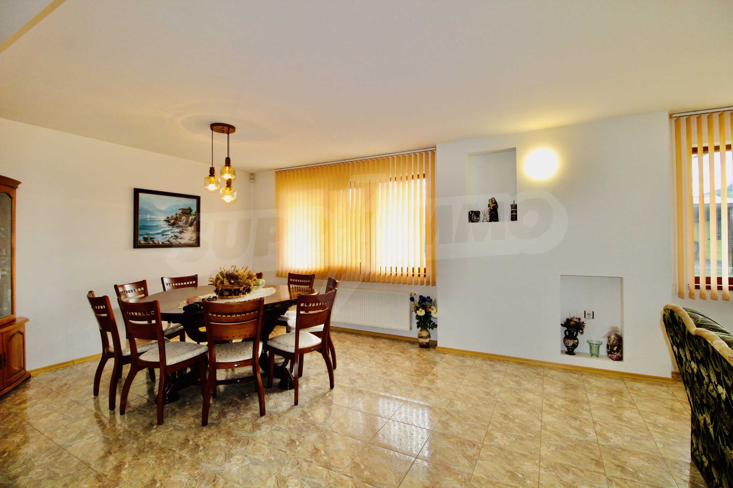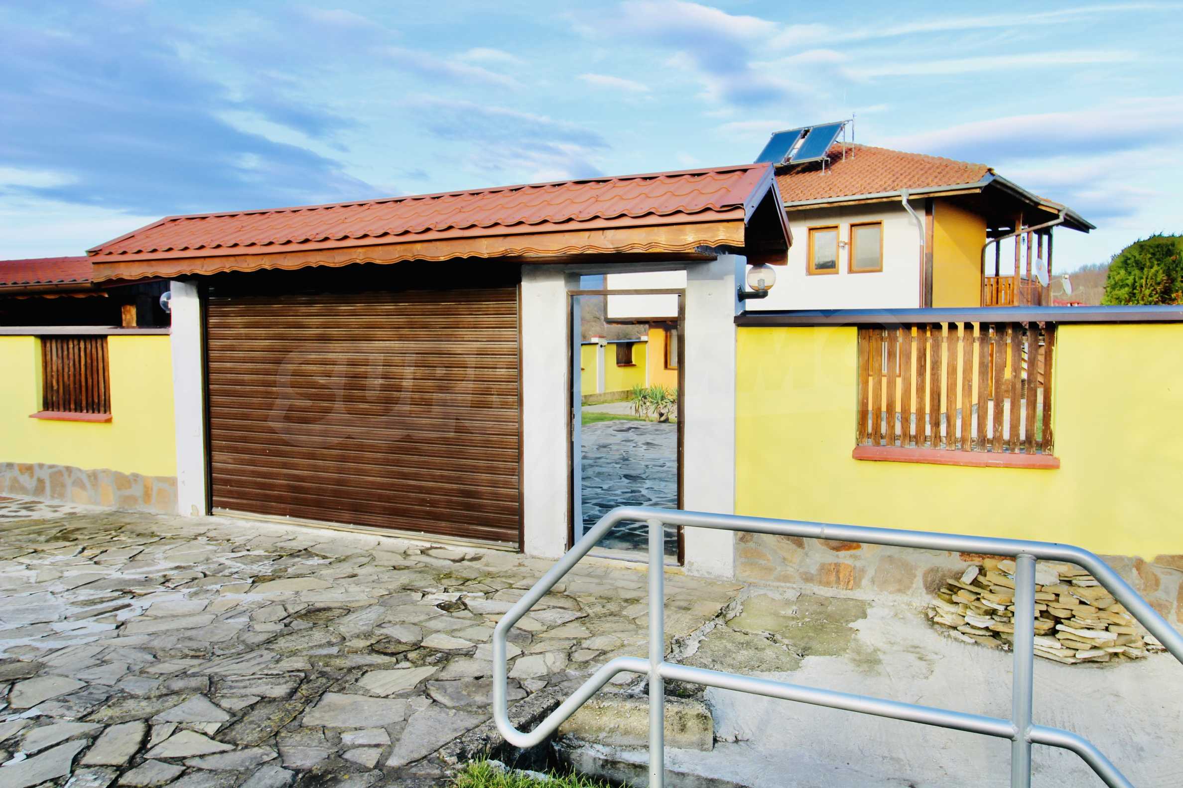 Auf der ersten Ebene gibt es eine Küche, ein großes Esszimmer mit Wohnzimmer und Kamin, ein Schlafzimmer mit Bad und WC. Auf der zweiten Etage befinden sich drei Schlafzimmer mit drei Bädern und Toiletten, eine große Terrasse. Die beiden Etagen haben separate Eingänge und können unabhängig voneinander bewohnt werden.Im Hof gibt es eine Sommerküche und einen Grill mit Backofen. Es gibt einen separaten Heizraum mit Pelletsheizung, der das gesamte Gebäude versorgt.