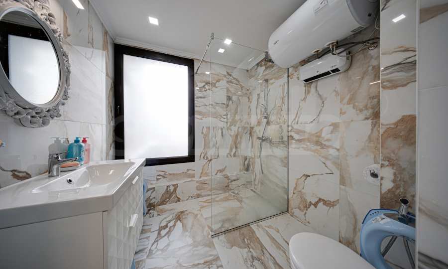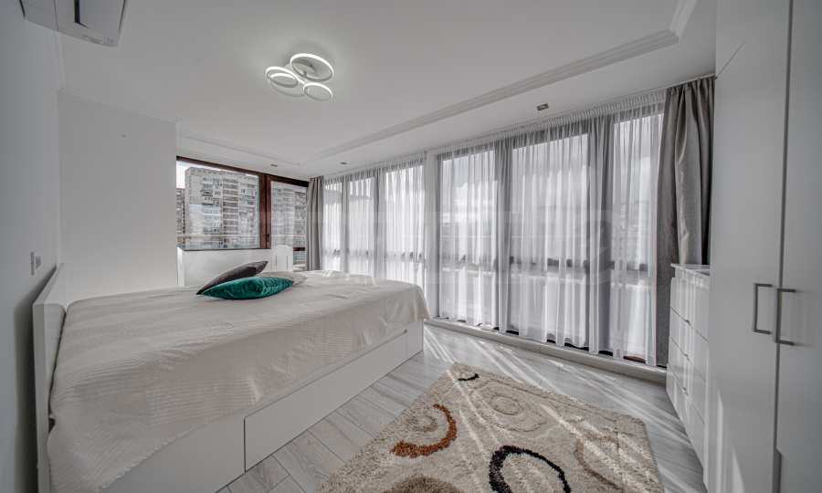 Die Wohnung befindet sich im letzten sechsten und siebten Stockwerk eines Gebäudes mit gepflegten Gemeinschaftsbereichen. Die Ausrichtung erfolgt nach Süden/Osten. Die Immobilie wird mit Materialien der höchsten Klasse fertiggestellt angeboten: