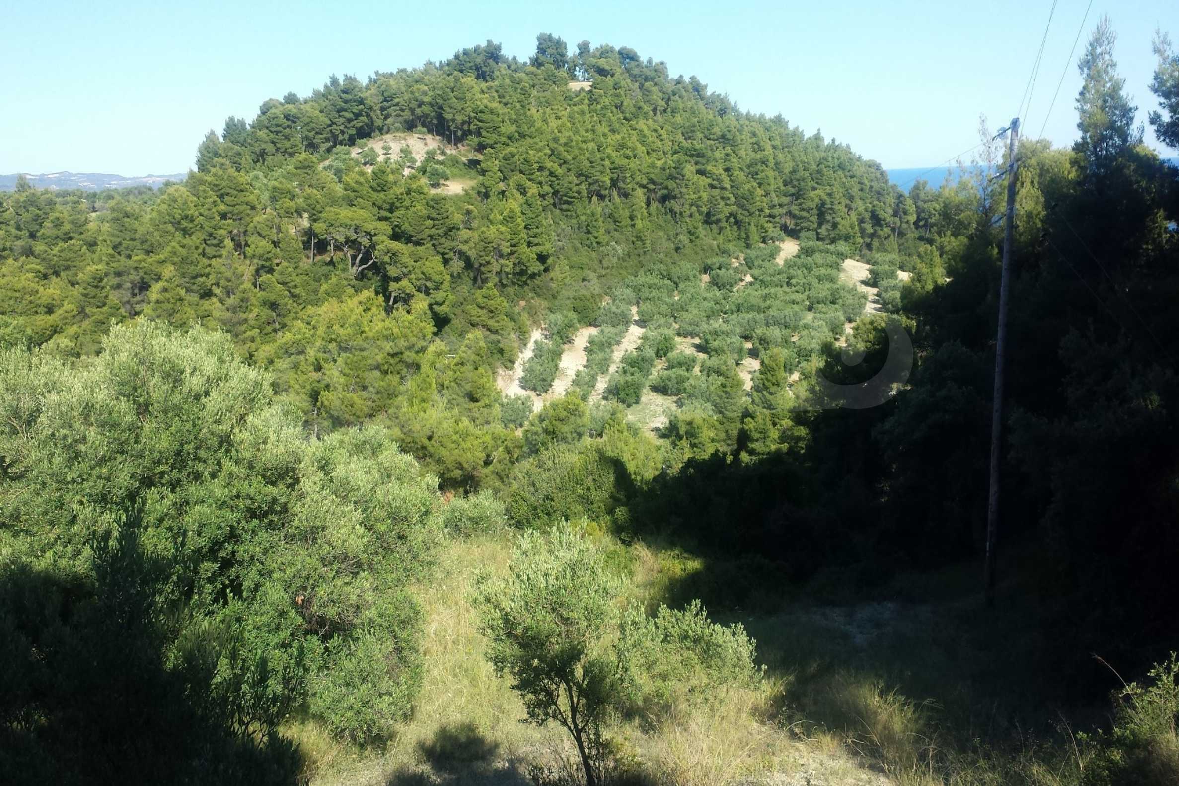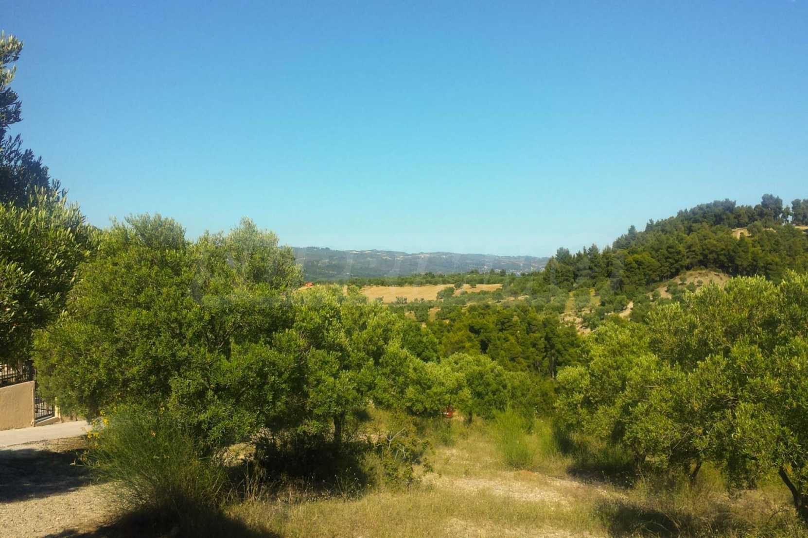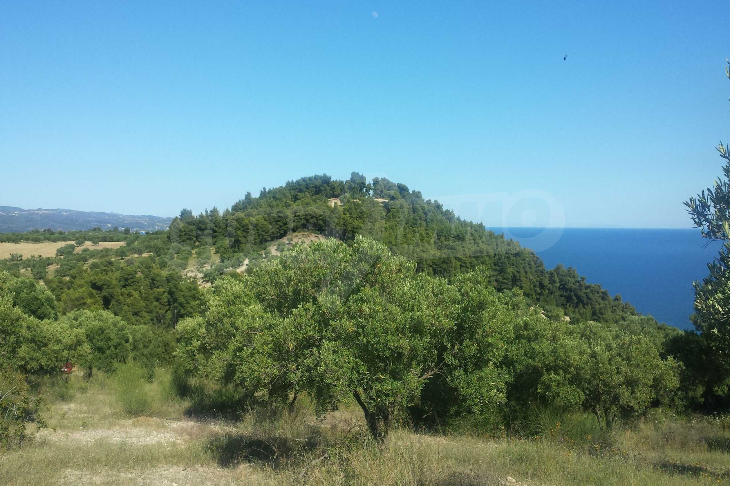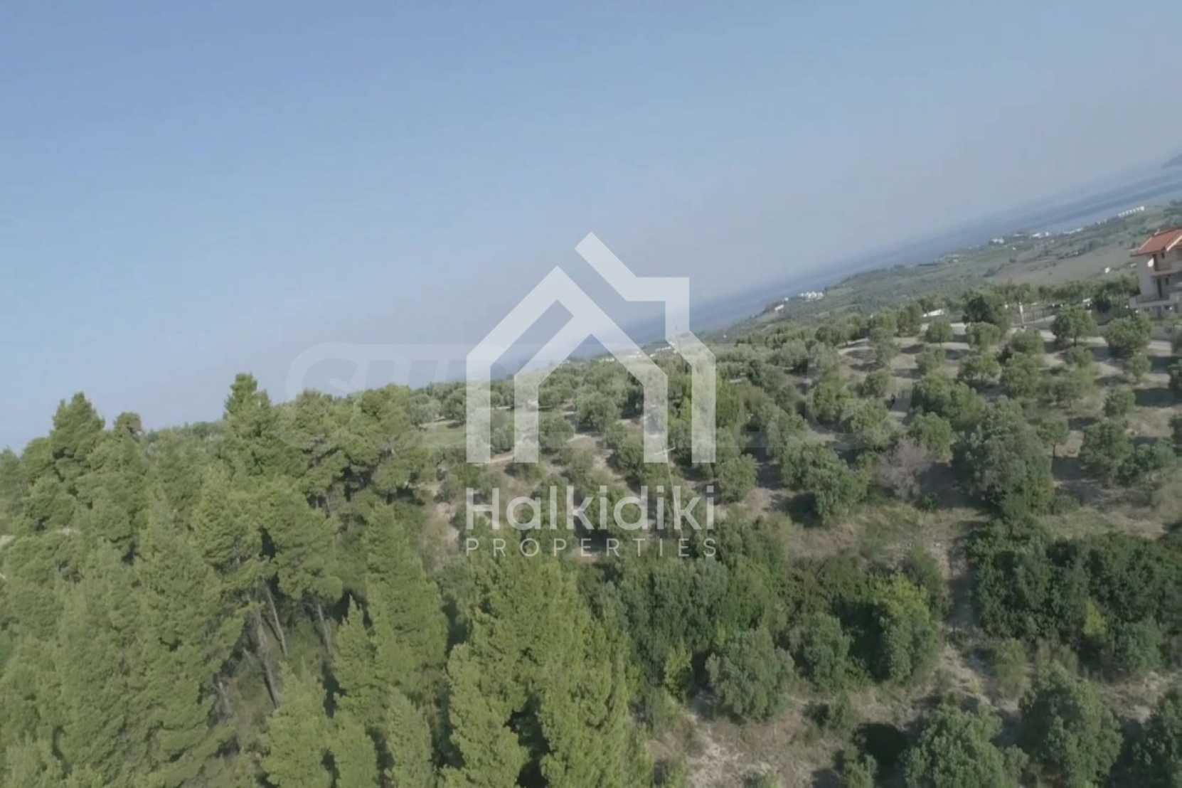 Ausgezeichnetes Panoramafeld, 9427 mÂІ in Kassandra, Chalkidiki. Es hat einen großen offenen Raum, ist amphitheatralisch und hat freien Blick auf die Berge und das Meer. Es liegt außerhalb des Dorfes, nur 450 m vom Strand und 700 m vom Dorfzentrum entfernt. Es ist auch komplett, baubar und perfekt für den professionellen Gebrauch und für den Bau einer Villa. Darüber hinaus hat das Feld einen großen Olivenhain im Inneren.