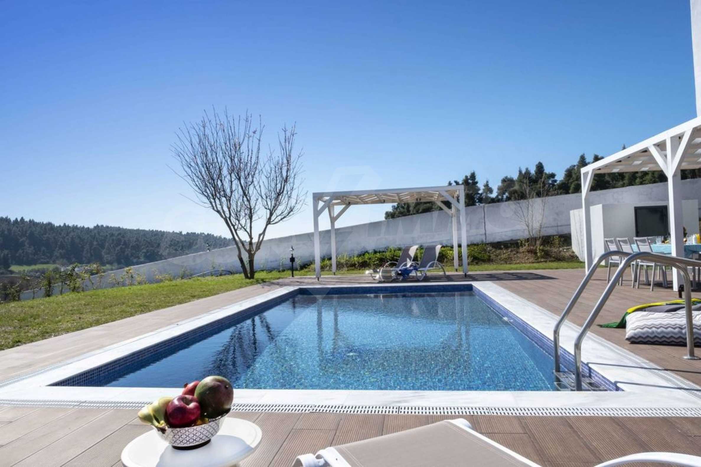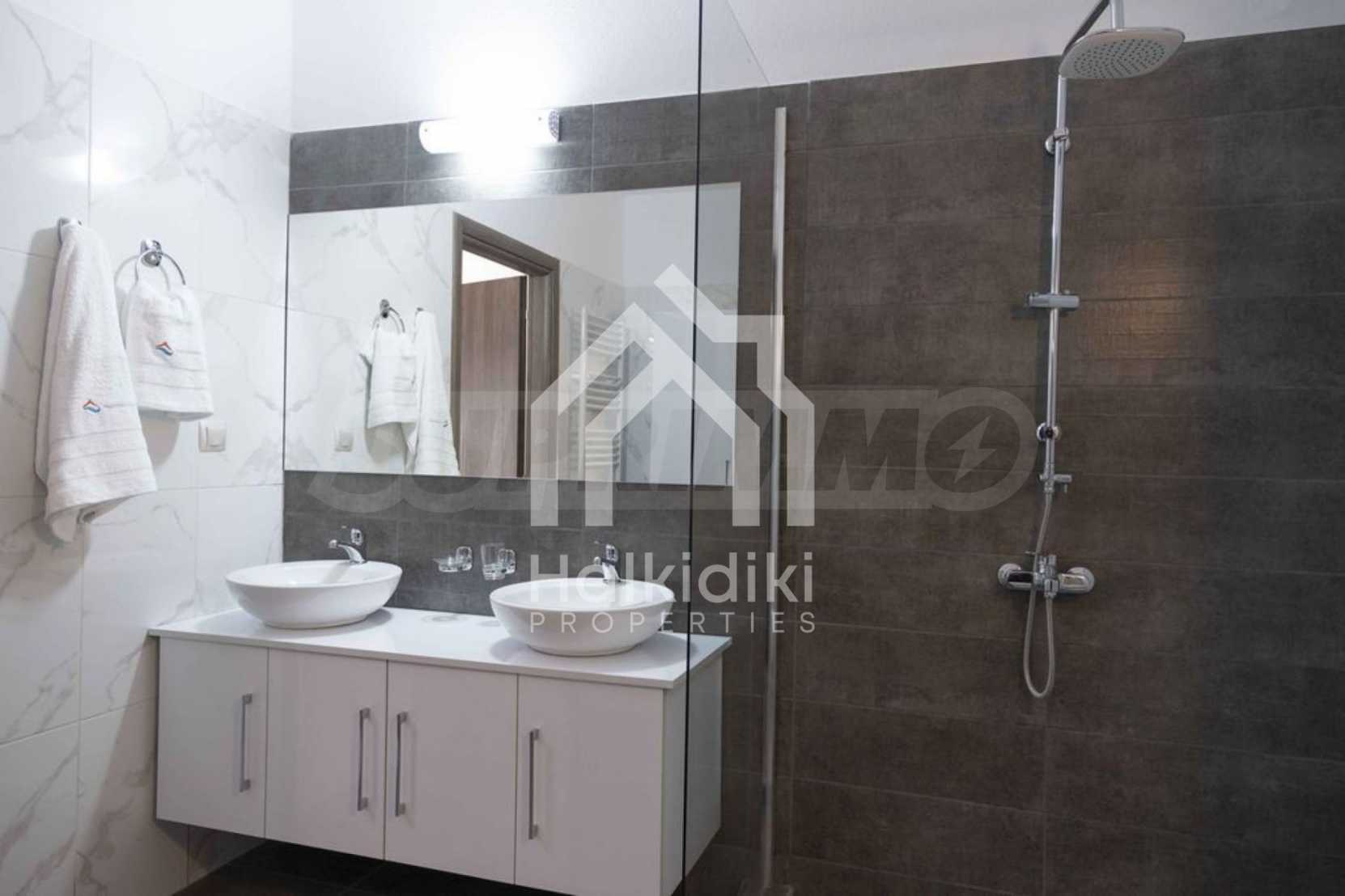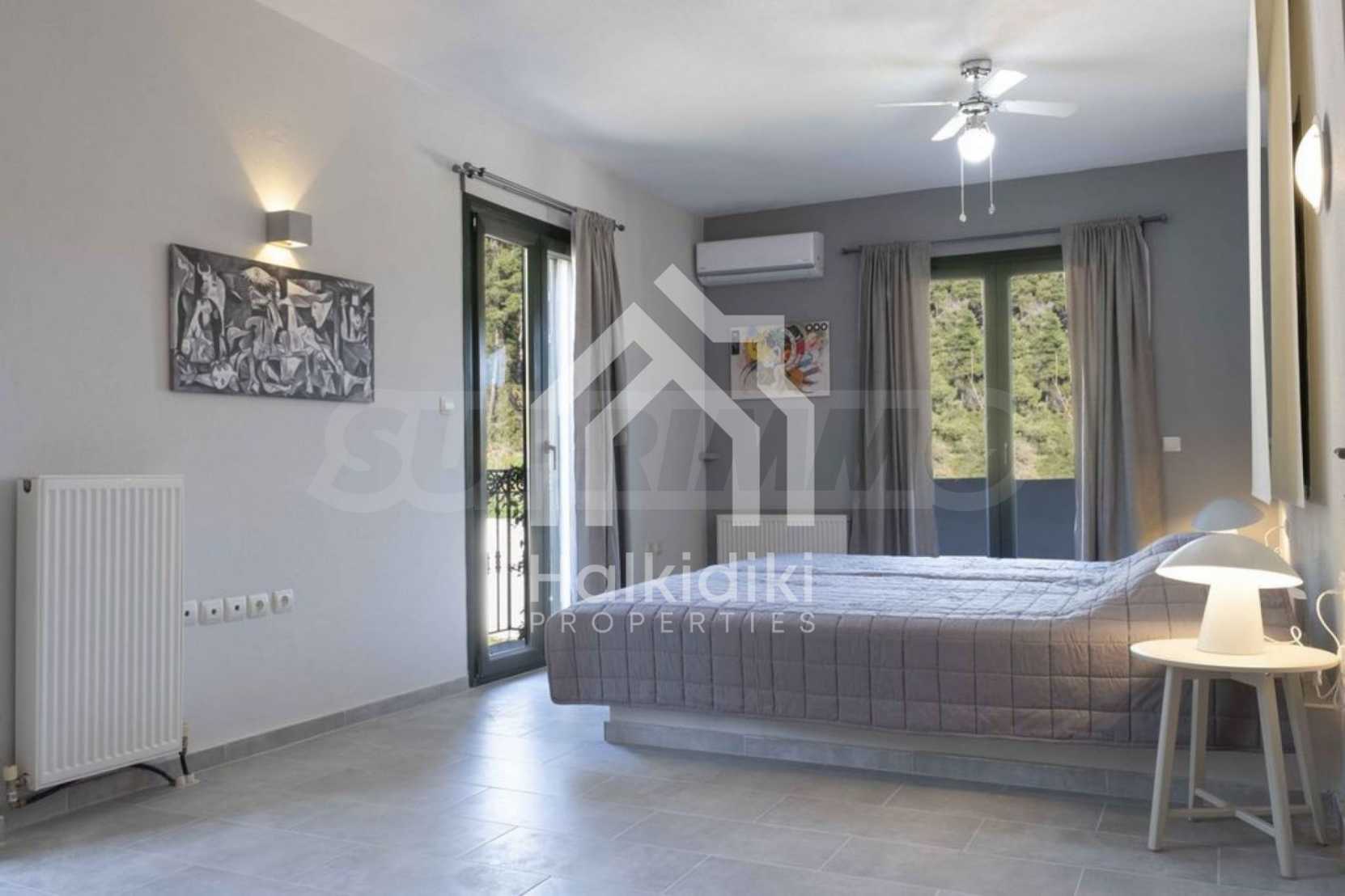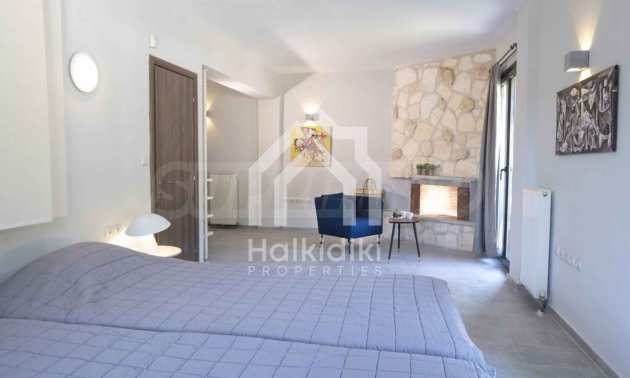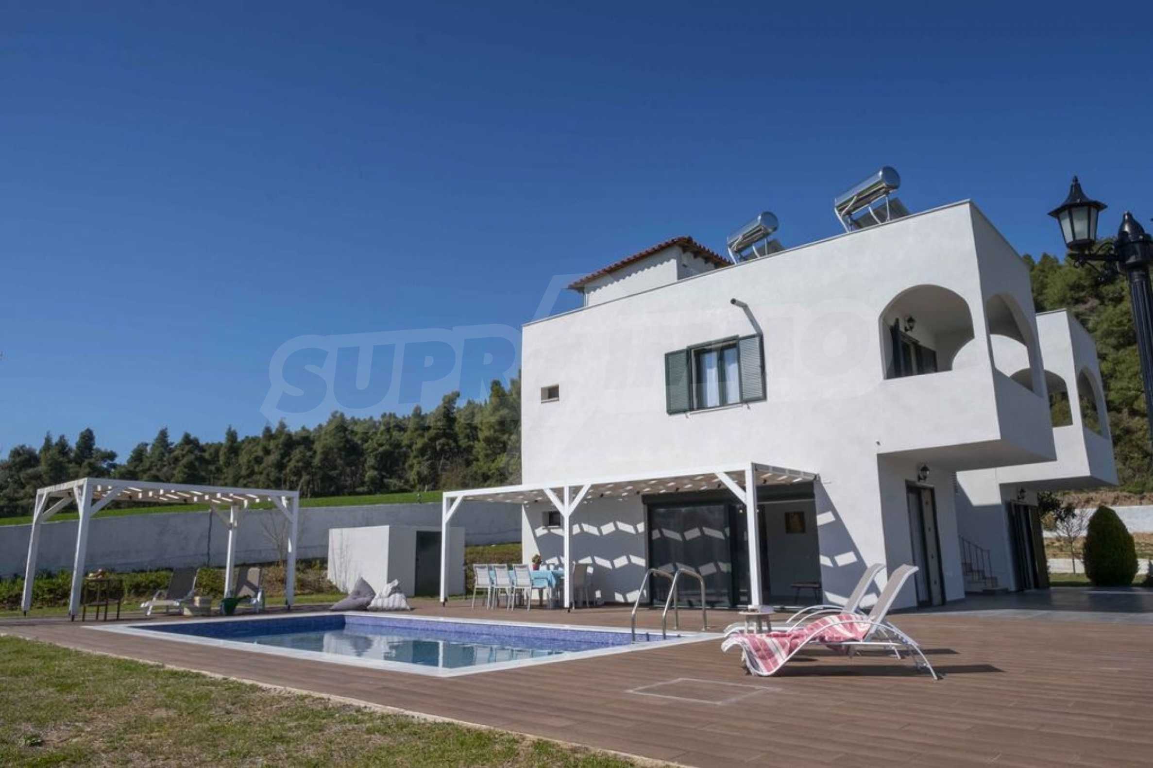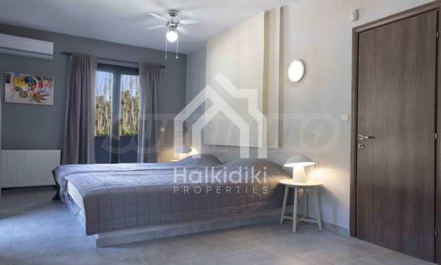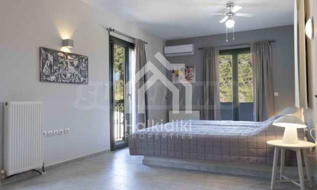 Luxuriöse Villa, 220 m², in Kassandra, Chalkidiki, in einem mit Kiefern bewachsenen Gebiet und fünf Minuten vom Strand entfernt. Es ist in zwei Ebenen aufgeteilt und besteht aus einem mit der Küche verbundenen Wohnzimmer, vier Schlafzimmern, drei Bädern und einem Abstellraum. Es verfügt über einen 5.000 m großen Garten mit automatisierter Bewässerung, Aluminiumschreinerei, Heizkessel, Kiosk, Außenpool und Satellitenantenne. Das Anwesen ist perfekt für eine Investition und ist voll möbliert.