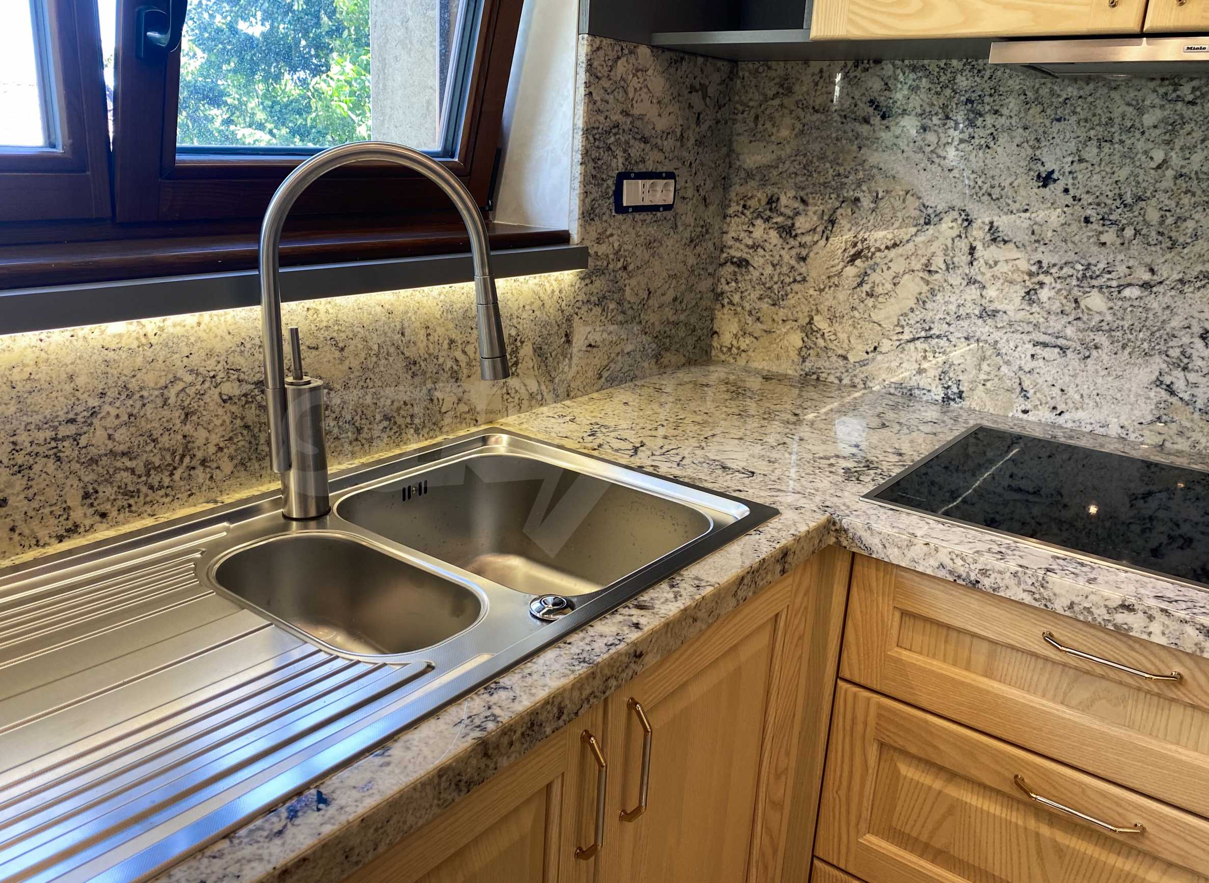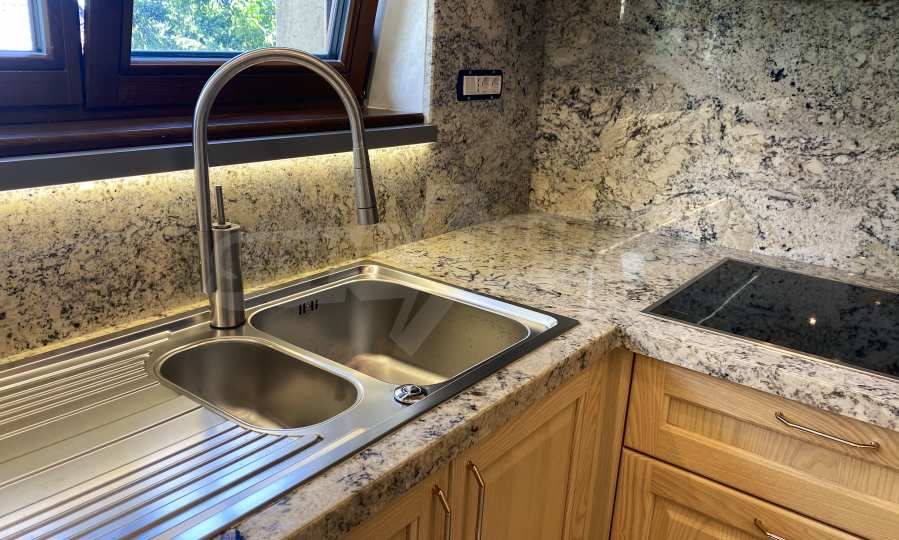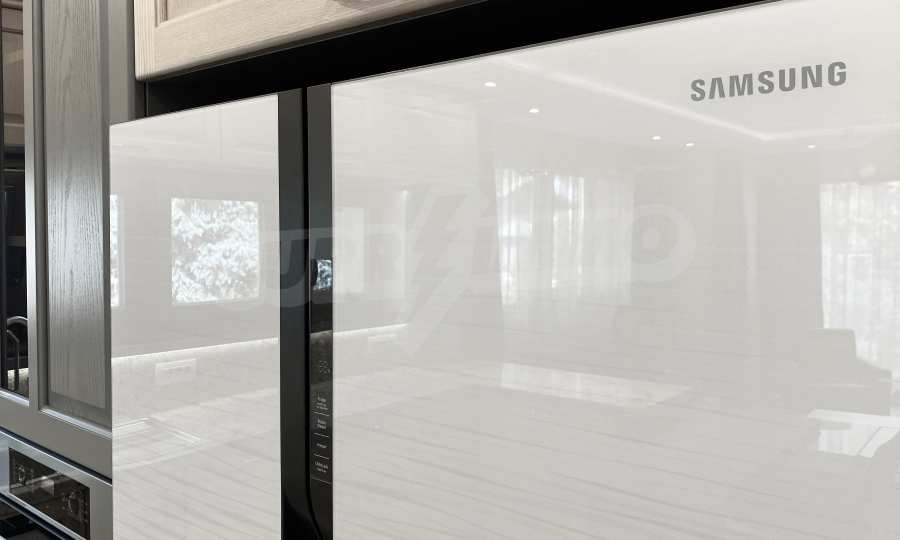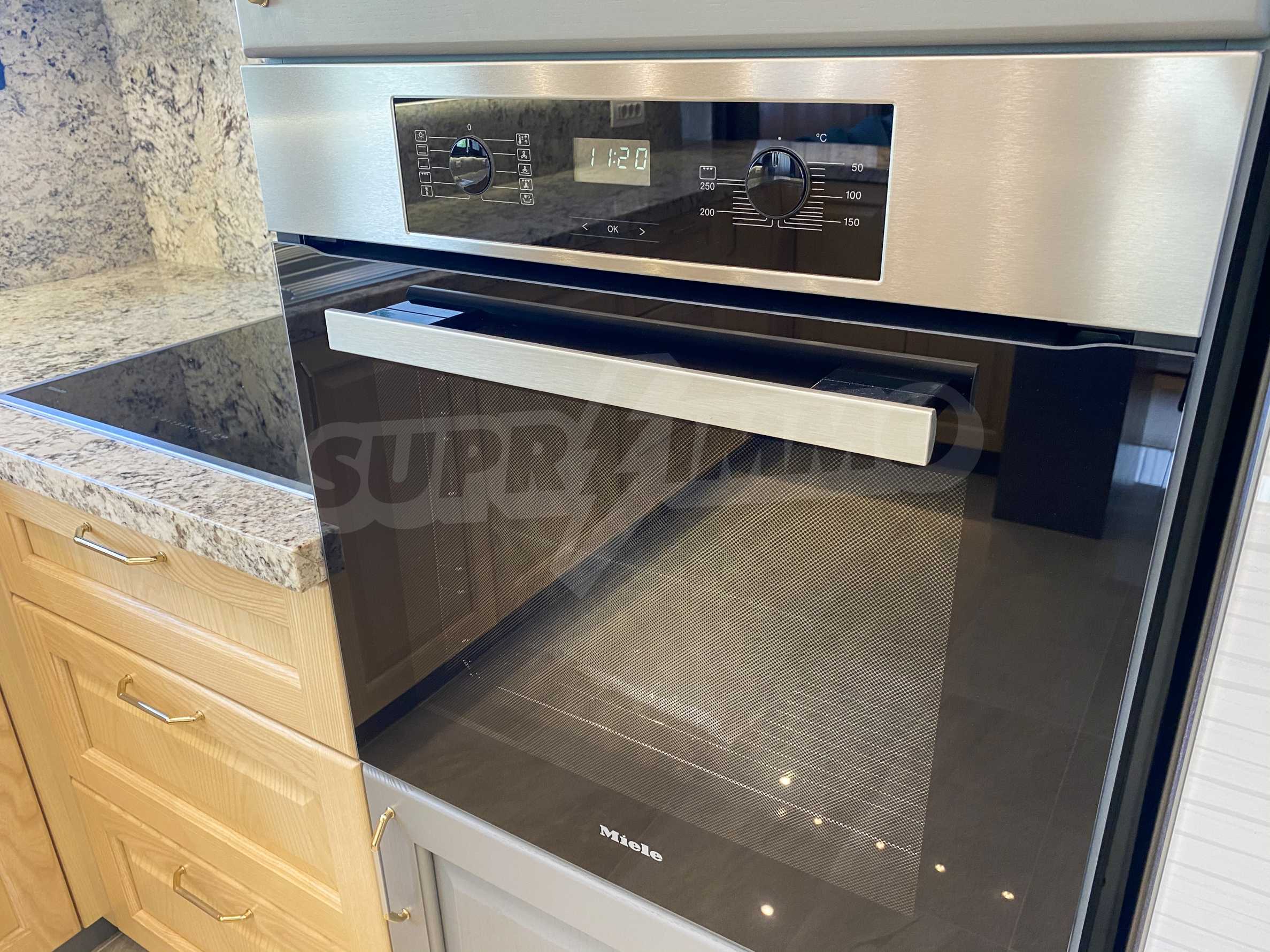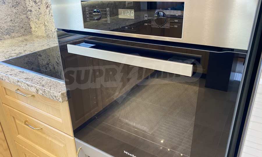 Die Küche ist mit hochwertigen Geräten ausgestattet: Samsung-Doppelkühlschrank, Miele-Küchengeräten, Franke-Wasseraufbereitungssystem.