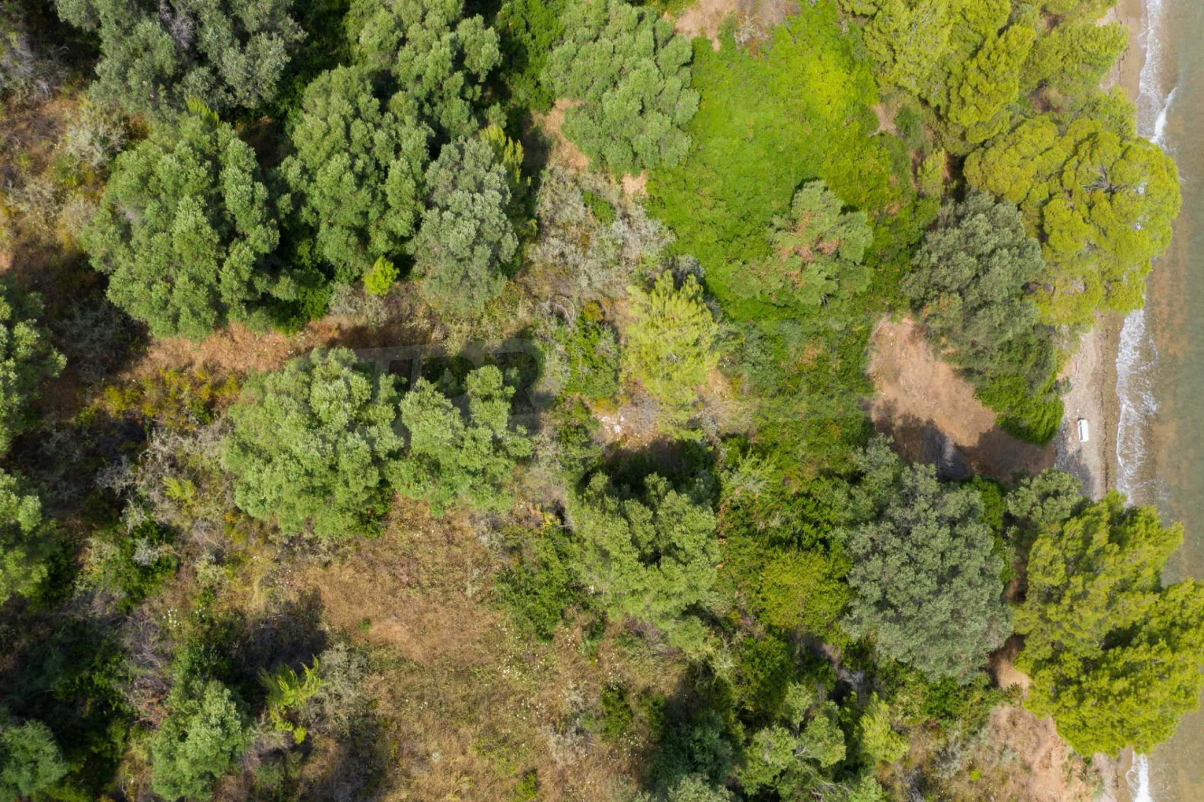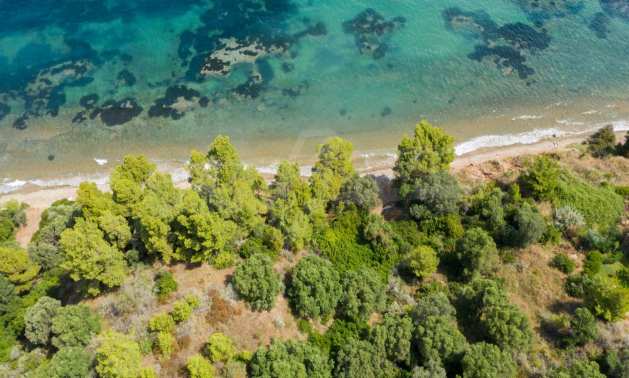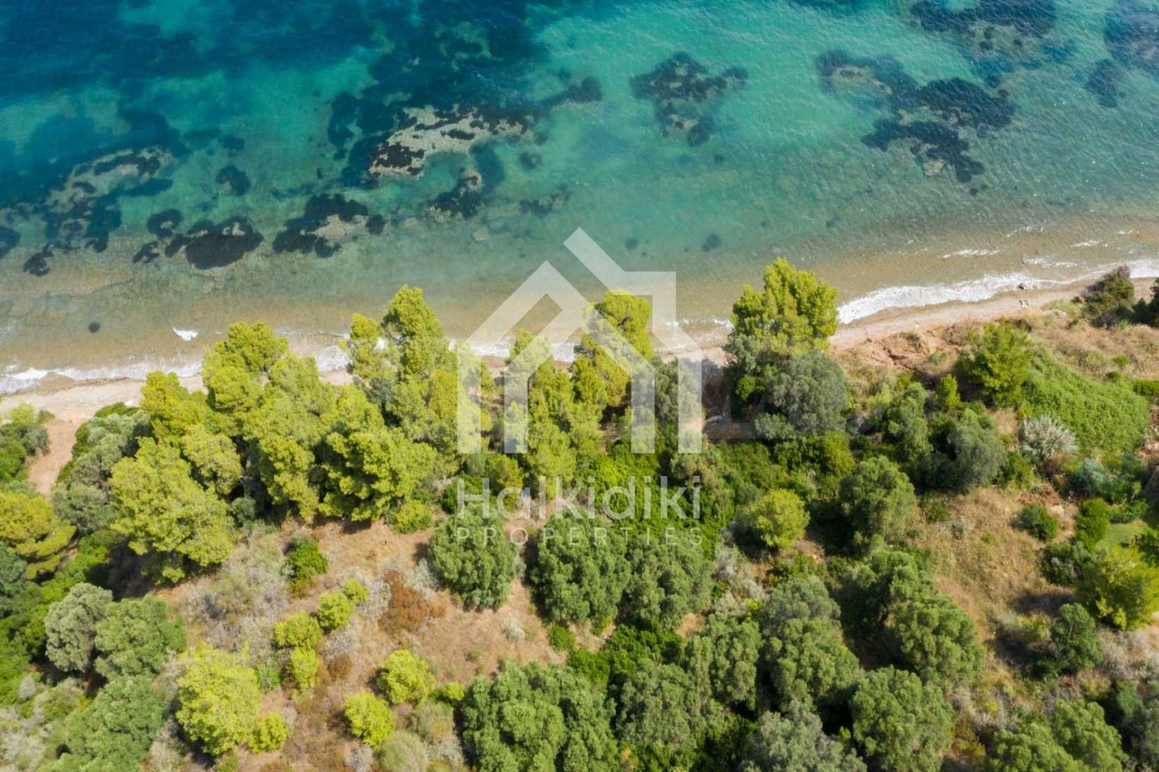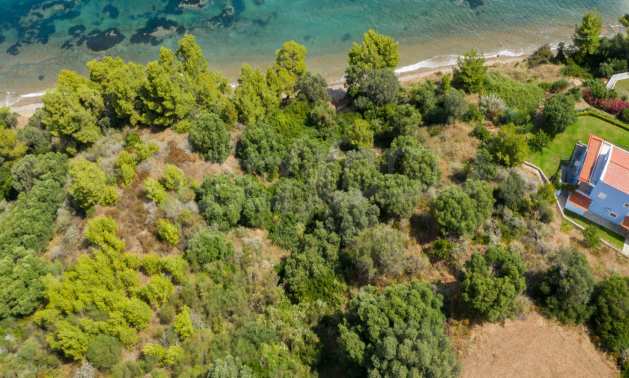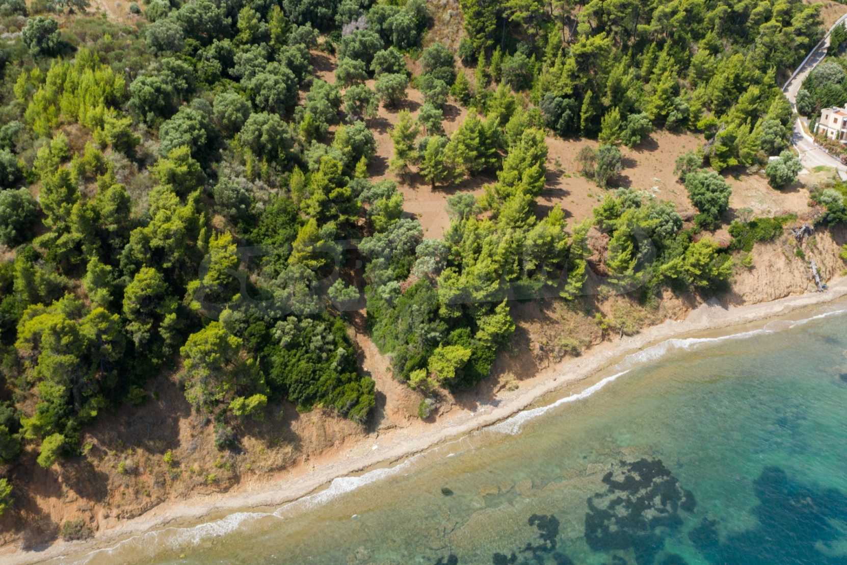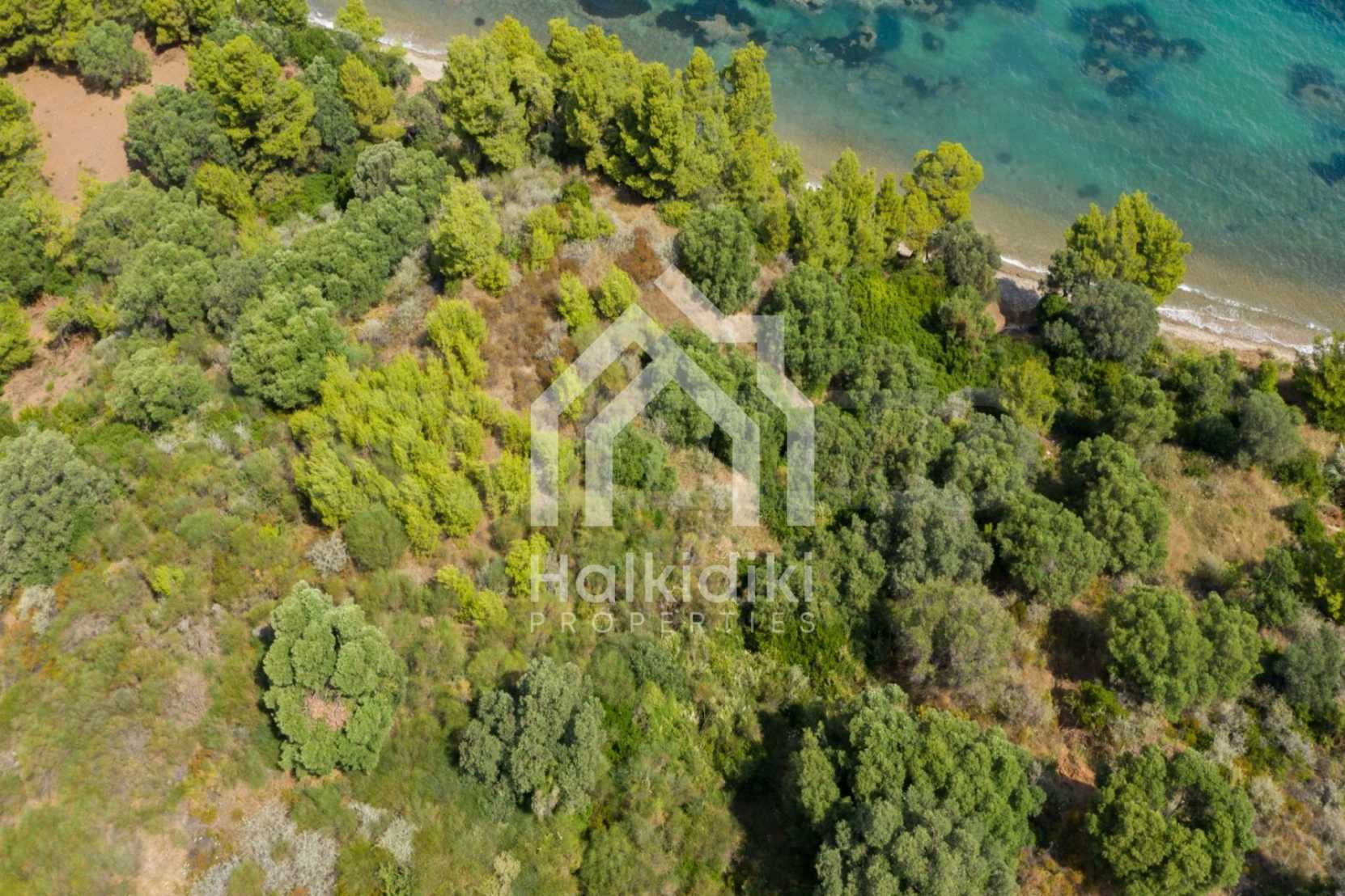 Einzigartiges Amphitheaterfeld, 9.750 m², in Kassandra, Chalkidiki. Es liegt vor einem wunderschönen Sandstrand und außerhalb des Dorfes. Es ist nur wenige Meter vom Meer und 3.600 Meter vom Dorfzentrum entfernt. Es hat eine wundervolle natürliche Schönheit und einen ungehinderten permanenten Meerblick mit südlicher Ausrichtung. Es ist vollständig und baubar und aufgrund seiner Größe ideal für den Bau von Häusern, für die professionelle Nutzung, aber auch für den Bau einer Villa.