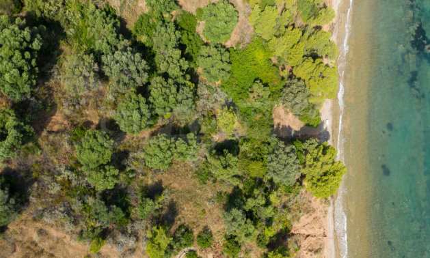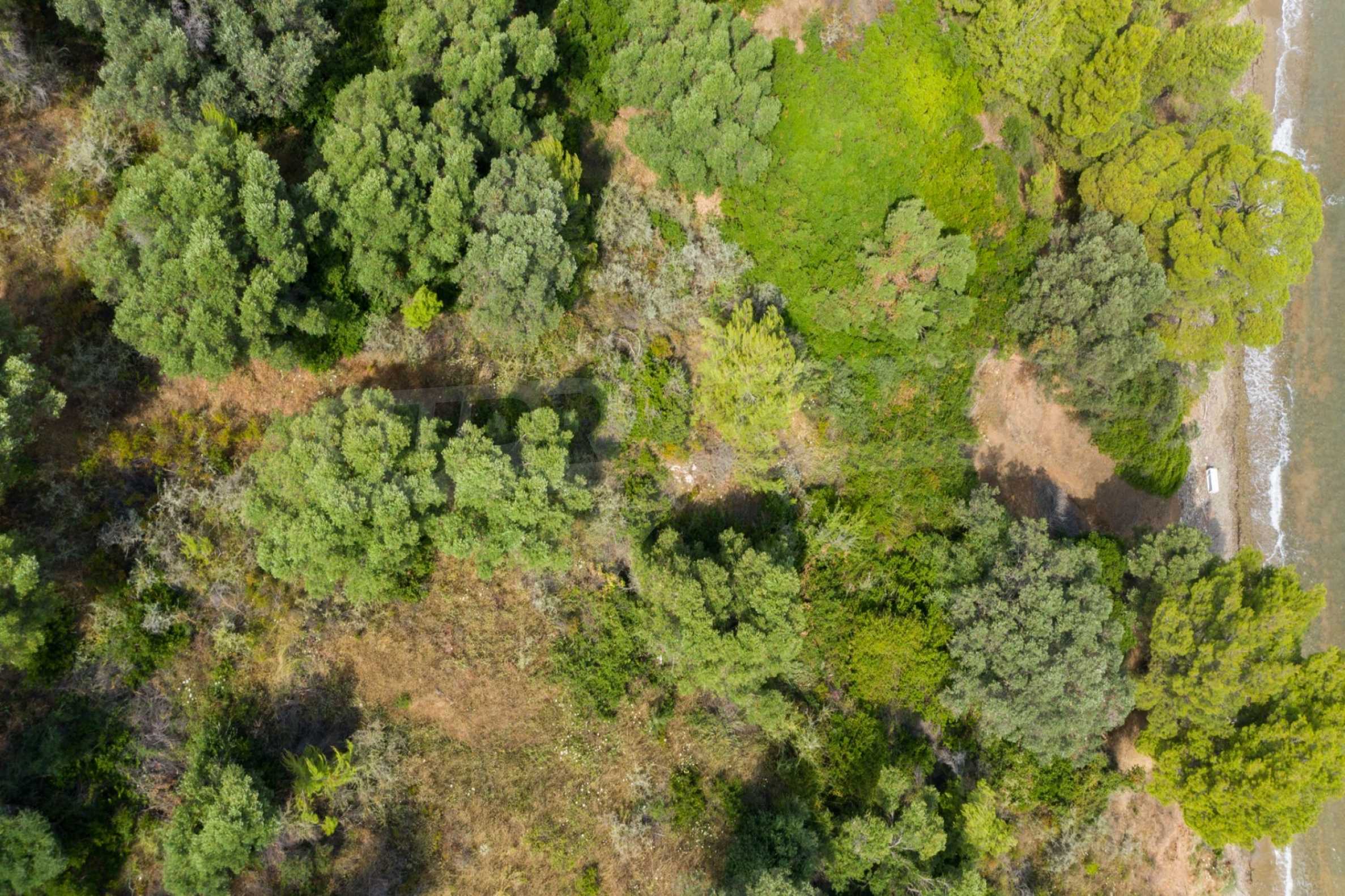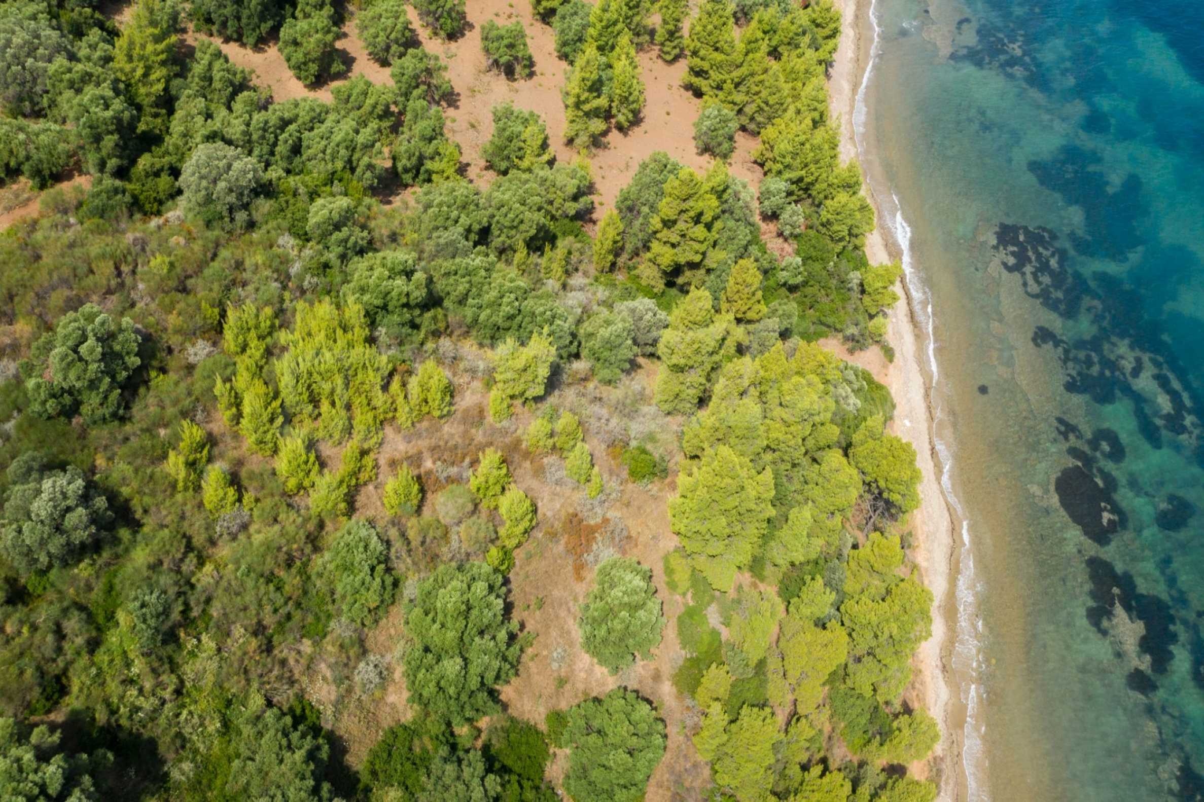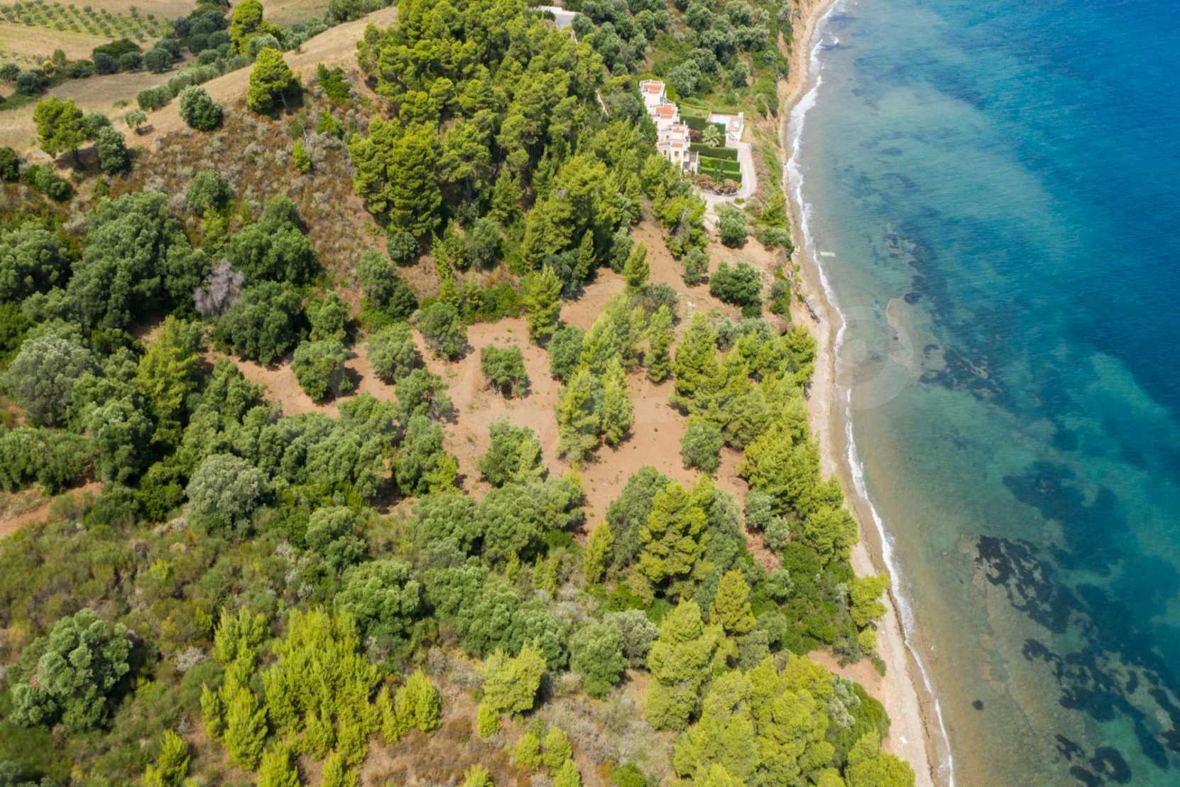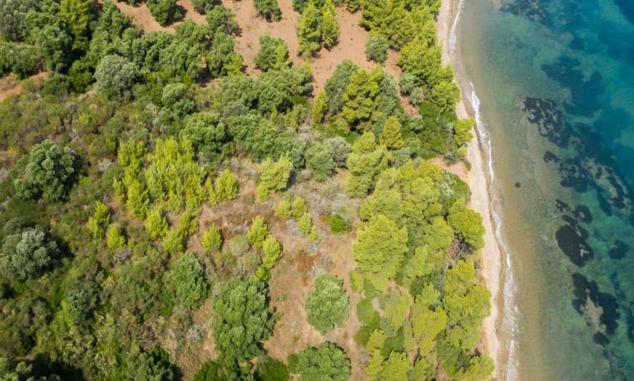 Einzigartiges Amphitheaterfeld, 9.750 m², in Kassandra, Chalkidiki. Es liegt vor einem wunderschönen Sandstrand und außerhalb des Dorfes. Es ist nur wenige Meter vom Meer und 3.600 Meter vom Dorfzentrum entfernt. Es hat eine wundervolle natürliche Schönheit und einen ungehinderten permanenten Meerblick mit südlicher Ausrichtung. Es ist vollständig und baubar und aufgrund seiner Größe ideal für den Bau von Häusern, für die professionelle Nutzung, aber auch für den Bau einer Villa.