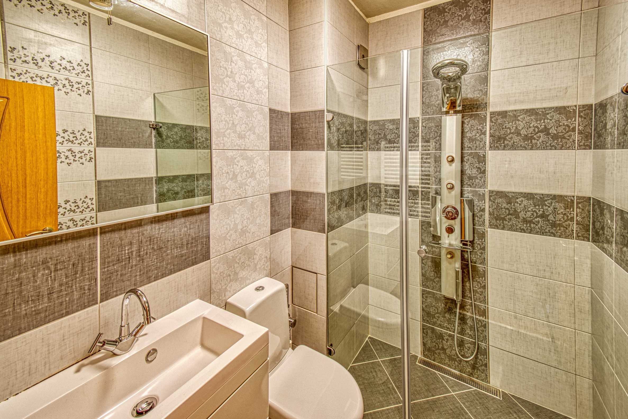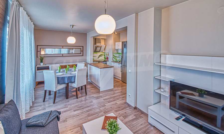 Es besteht aus einer Eingangshalle, einem Ankleidezimmer, einem Wohnzimmer mit Schlafsofa, einem Esszimmer und einer Küchenzeile, einem Schlafzimmer mit Kleiderschrank, einem modernen Badezimmer mit Hydromassage-Dusche.