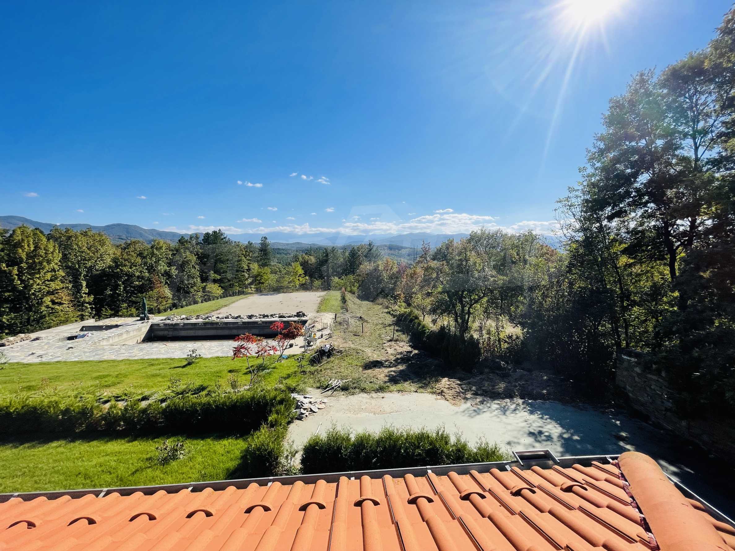 Die überdachten Terrassen liegen nach Süden – mit Blick auf das Panorama des Balkangebirges. Es ist vorgesehen, dass dieser Raum mit direkter Verbindung zum Wohnzimmer in den warmen Jahreszeiten genutzt werden kann. Die Terrassen sind überdacht – mit einem Holztragwerk und einem Ziegeldach.