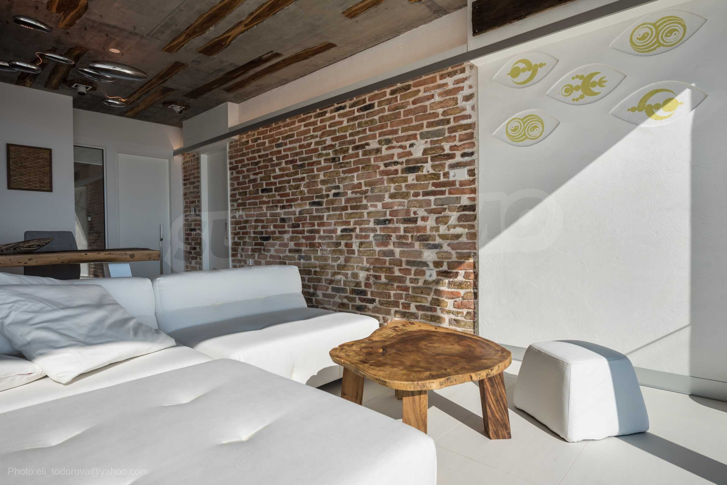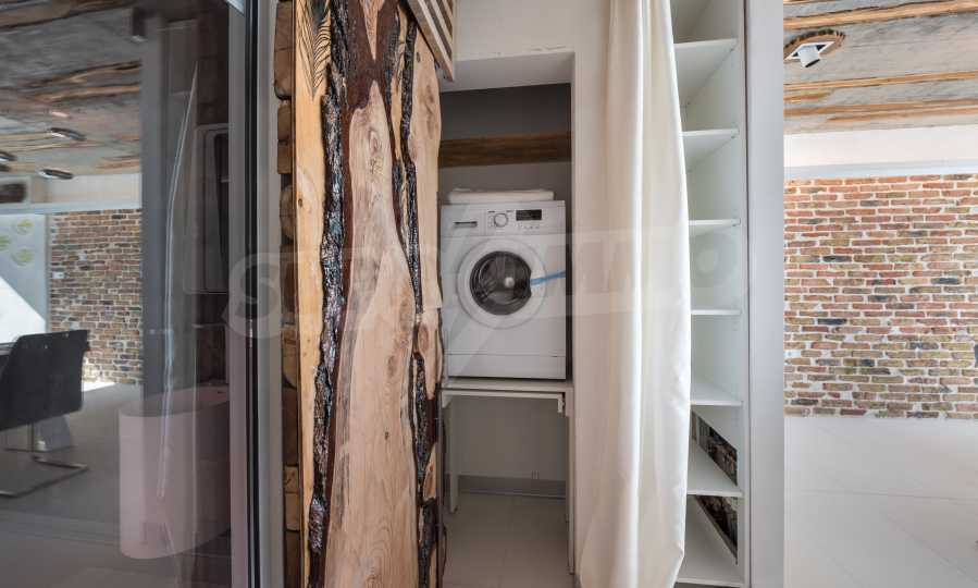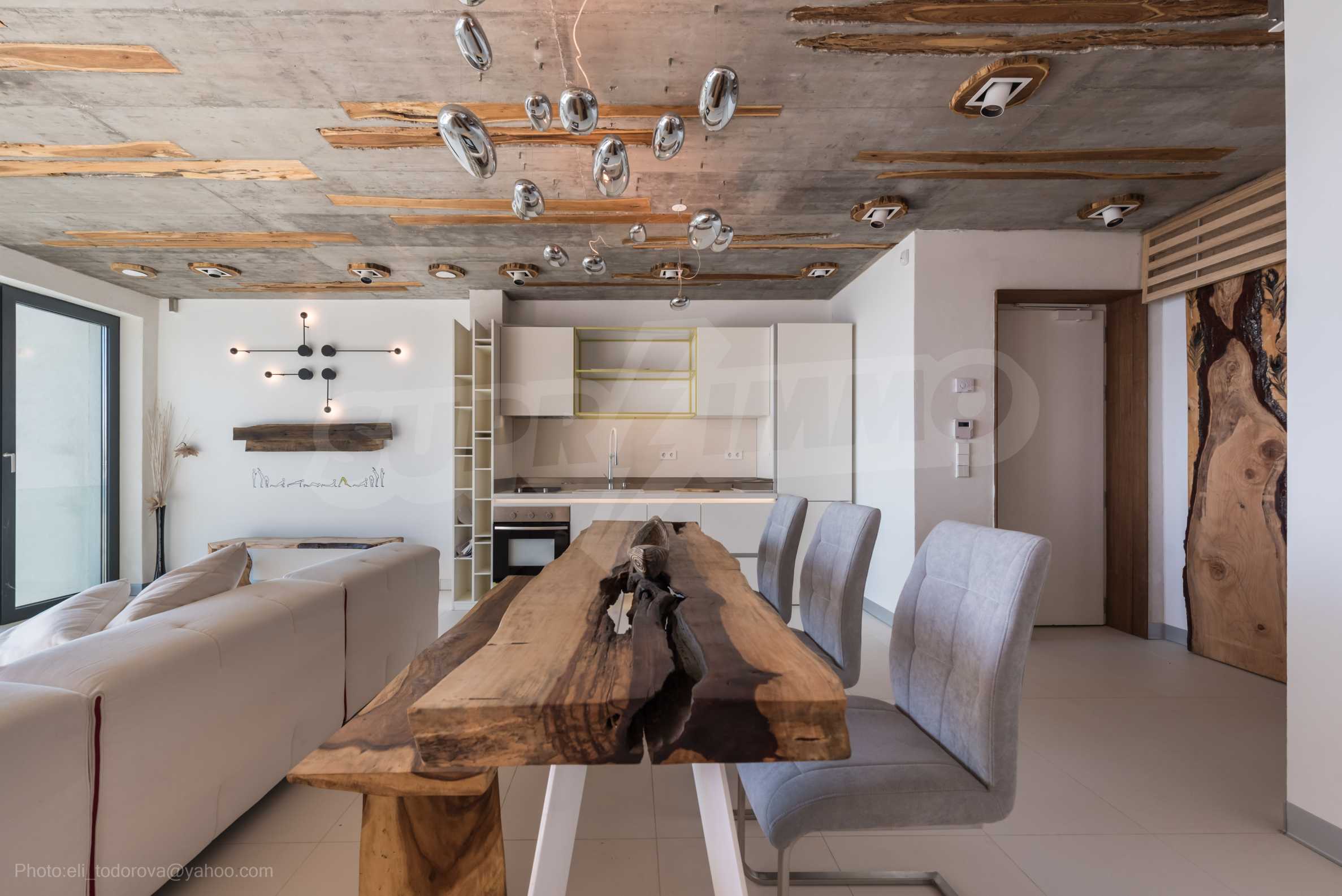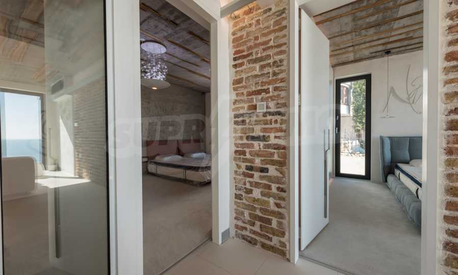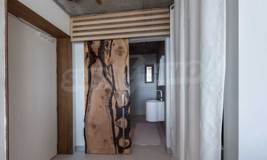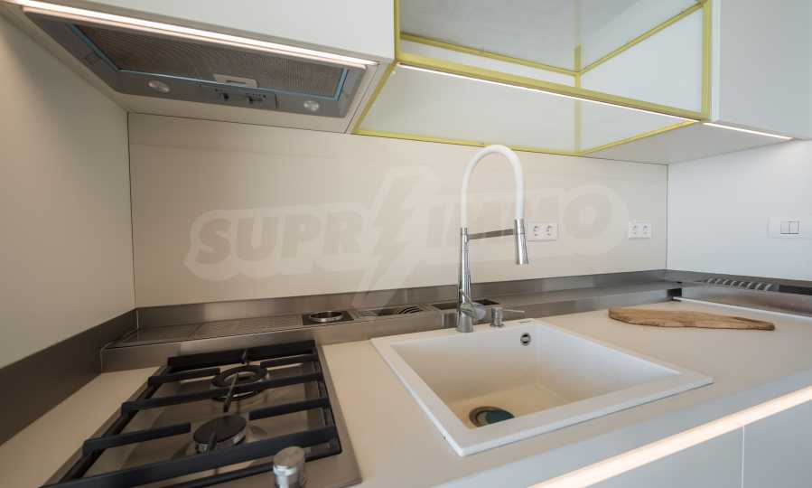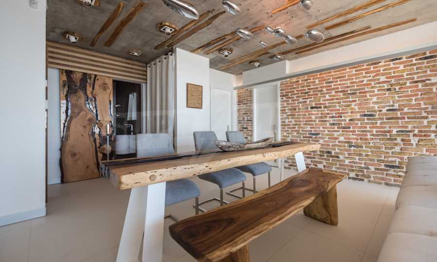 Das Design ist einzigartig - natürlich und modern, herausfordernd und hell und vermittelt die Botschaft von Autonomie, Entspannung und Meeresatmosphäre. In die Betonplatten an der Decke der Wohnung sind Akazienornamente aus natürlichem Beton eingebaut. Die Backsteinmauern und der Beton werden zur natürlichen Dekoration verwendet, da sie zusätzlich behandelt, imprägniert und grundiert werden. Möbel, Küche, Matratzen und Sofas, attraktive Fliesen, Beleuchtungskörper - alle sind von bekannten italienischen Marken. Der Fokus im Speisesaal liegt auf dem extravaganten Tisch, der auf Bestellung aus kostbarem und seltenem Holz aus dem Amazonas gefertigt wird. Das Badezimmer ist durch eine Glastür für viel Sonnenlicht getrennt und alle Badezimmer sind in erstklassiger deutscher Qualität.