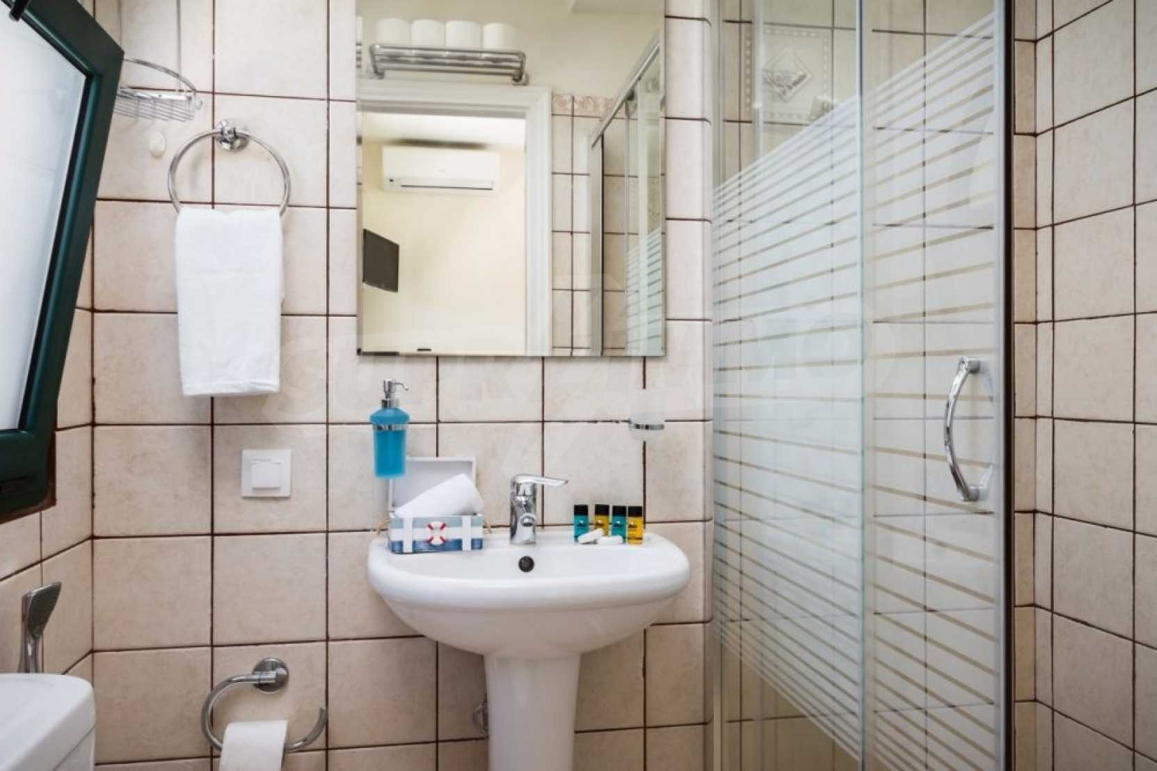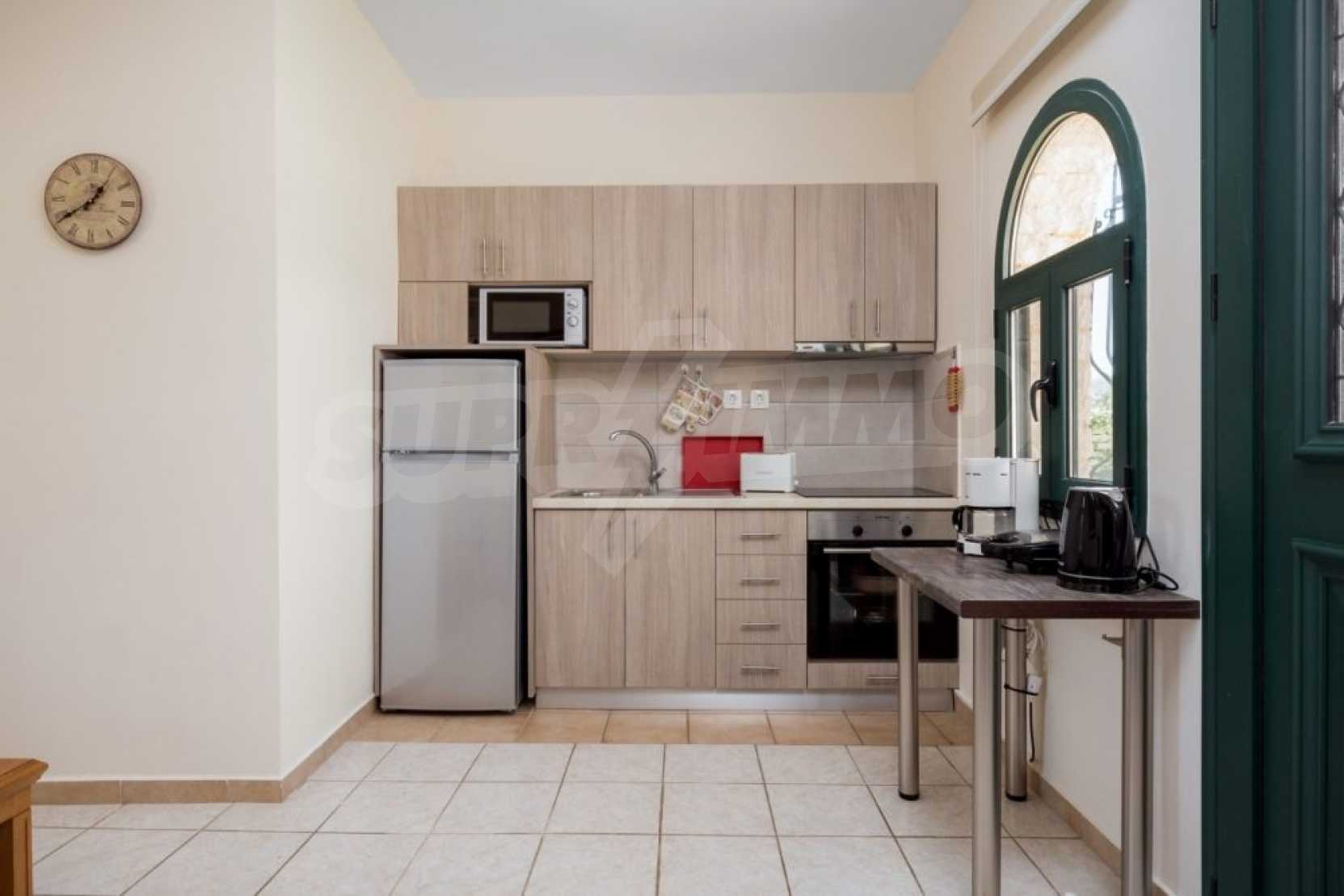 Das zweite Haus verfügt über eine offene Küche/Esszimmer, ein Schlafzimmer mit einem Doppelbett mit Türen, die auf eine Veranda führen, und ein Badezimmer.
