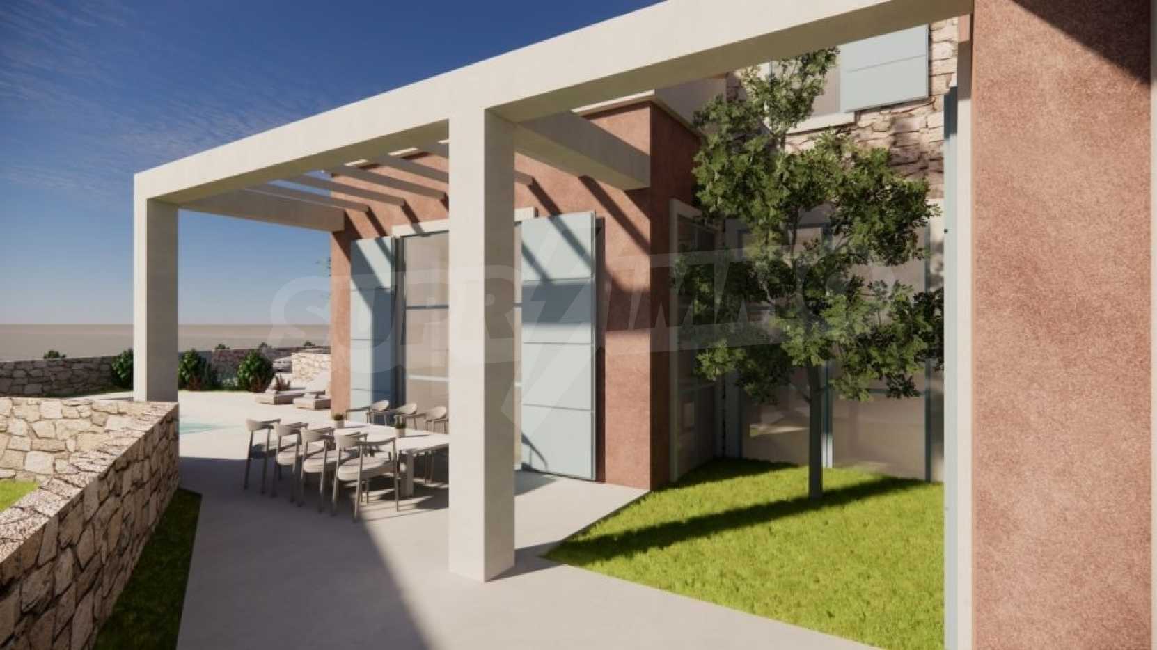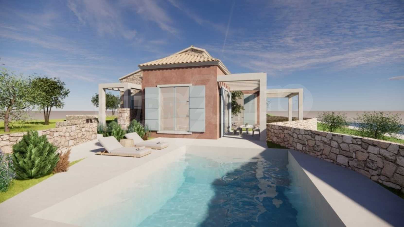 Die Architektur dieses Projekts vereint alle Elemente griechischer Schönheit. Die Elemente aus Stein und Holz in Kombination mit dem weiten Blick auf das Meer und die Landschaft machen diese Villa zu einem Paradies auf Erden.