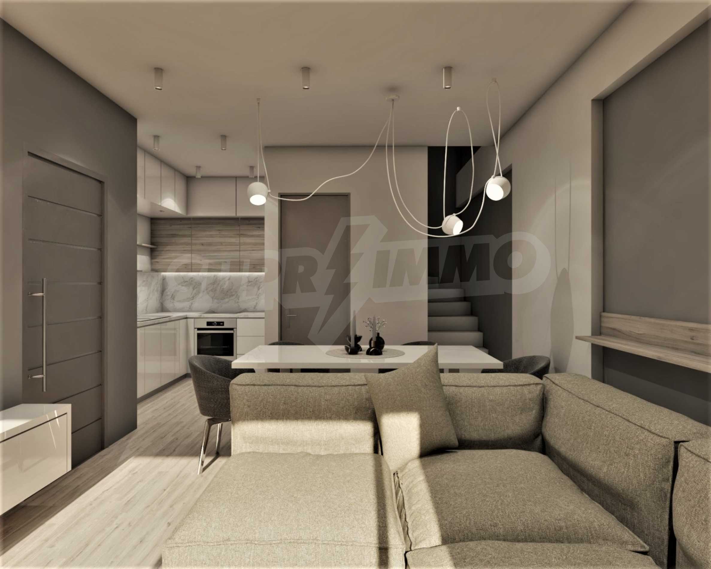 ● 1. Ebene, 1. Stock - Wohnzimmer mit Küche und Essbereich, 1 Badezimmer;