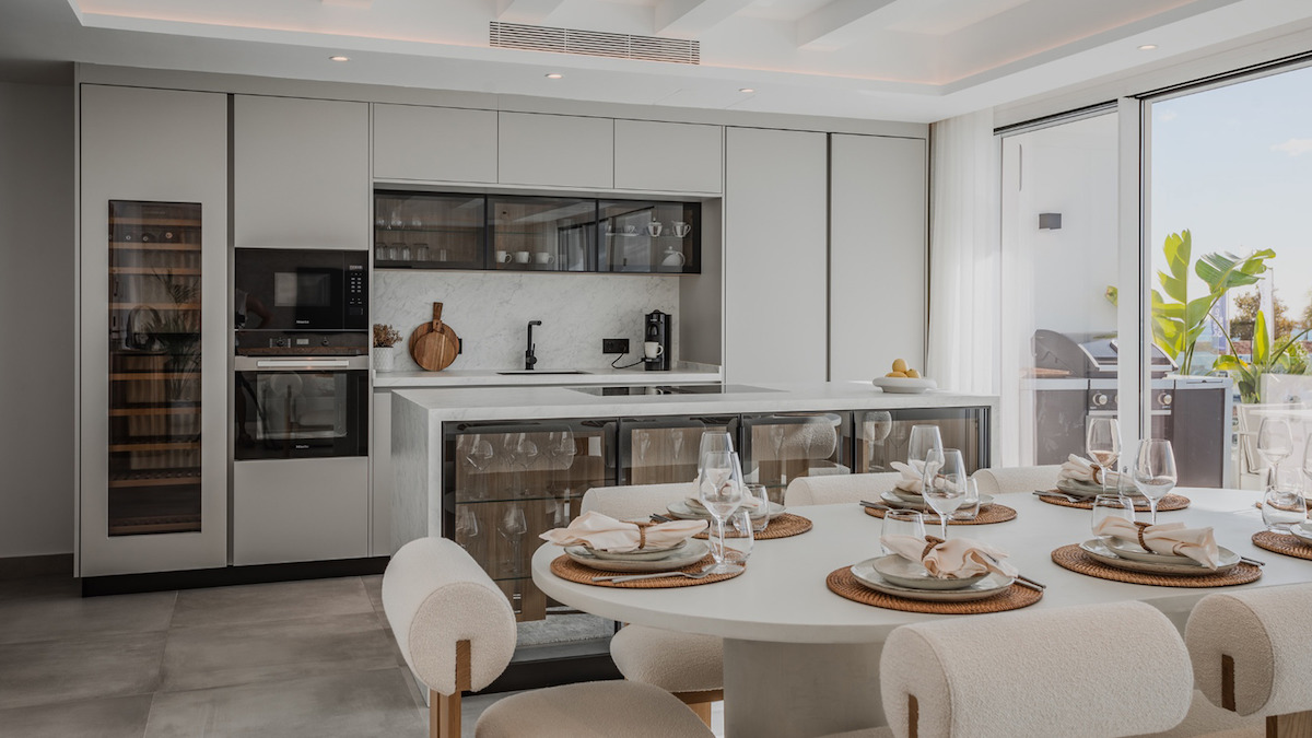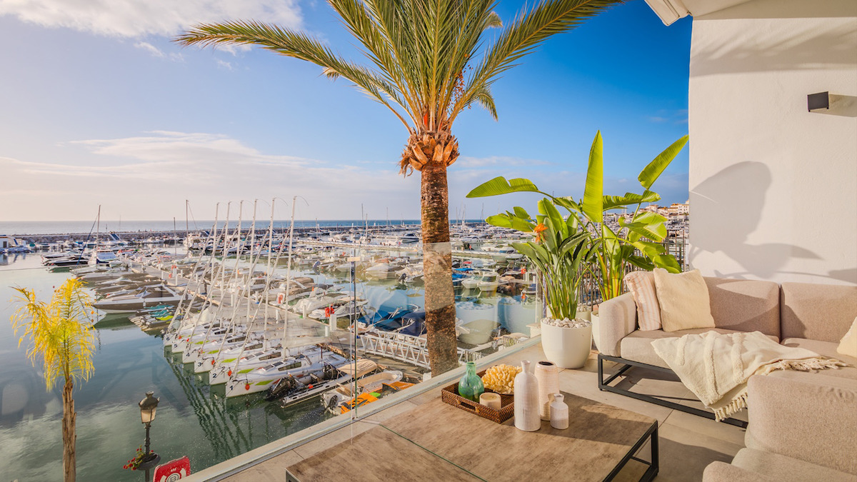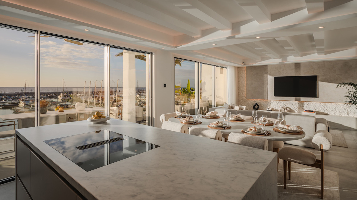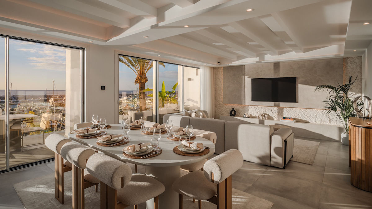 Es umfasst einen großen Wohnbereich mit cremefarbenem Marmor und Designerbeleuchtung, ein Hauptschlafzimmer mit Bad en suite, Ankleide, zwei weitere Doppelschlafzimmer mit eigenen Bädern sowie ein zusätzliches Gästezimmer. Die große Terrasse mit direktem Blick auf den Yachthafen bildet das Herzstück des Objekts.